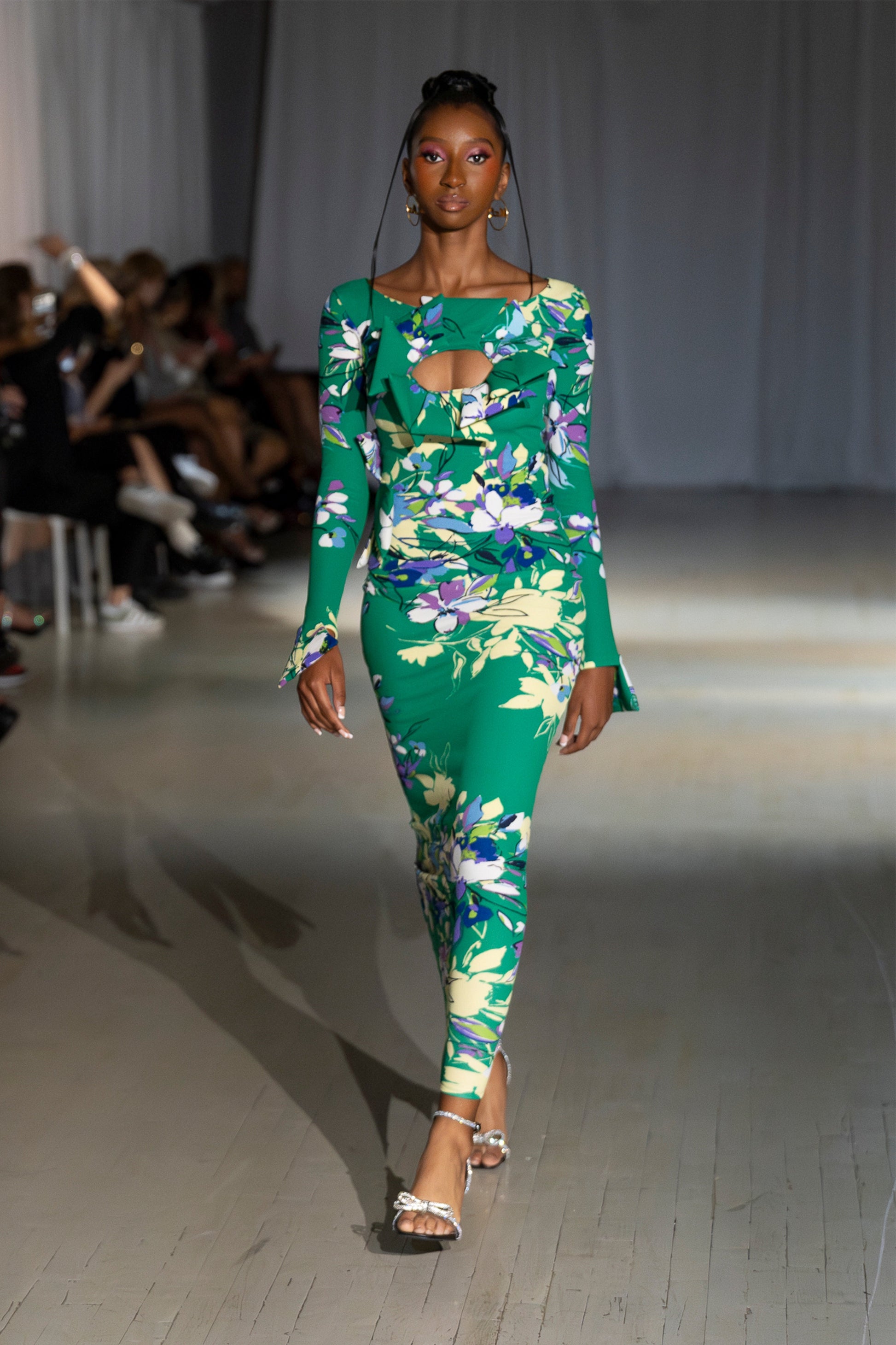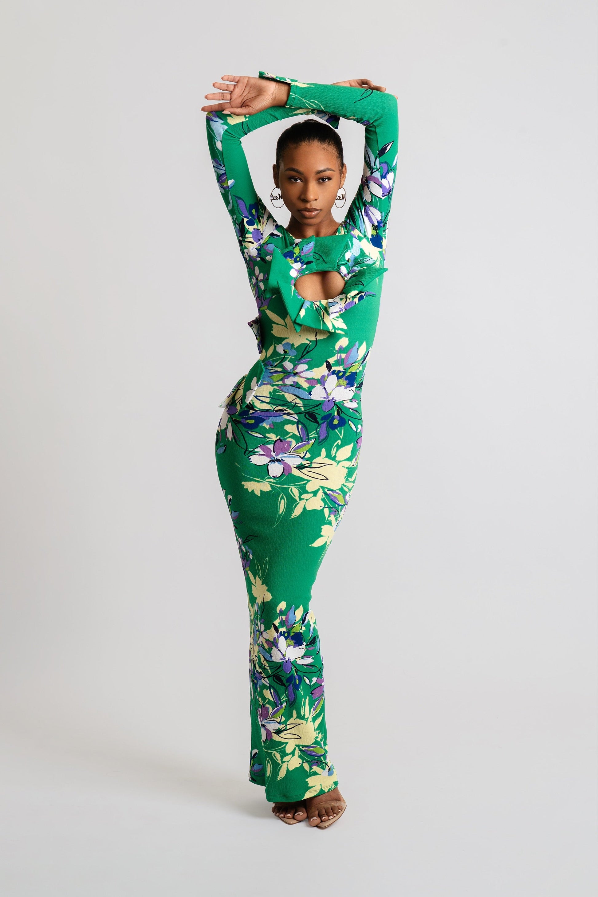 This vibrant floral maxi dress is designed in a rich emerald green with blooms in violet, ivory, and soft yellow. Made from a figure-hugging stretch fabric, it shapes and smooths while offering breathable comfort for all-day wear. The statement bow detail and front keyhole cutout add a playful yet refined touch, creating a flattering silhouette that’s both bold and feminine. Flared sleeves bring added drama and balance to the sleek, floor-length design.