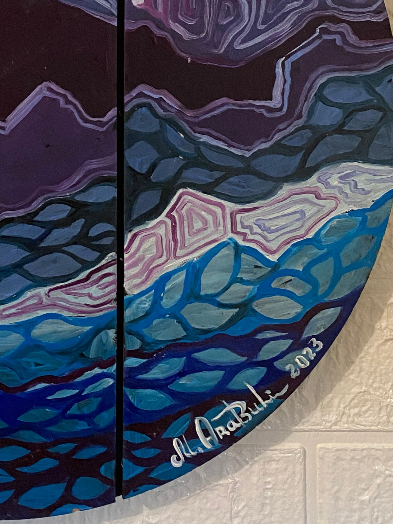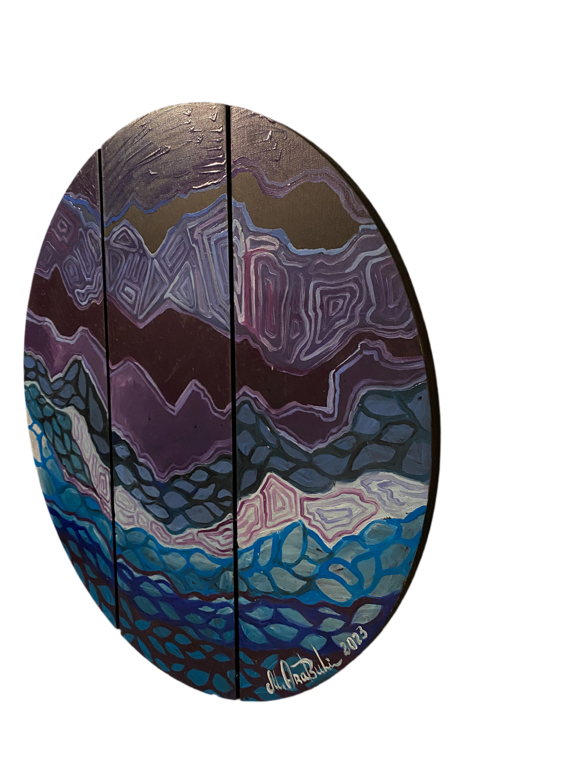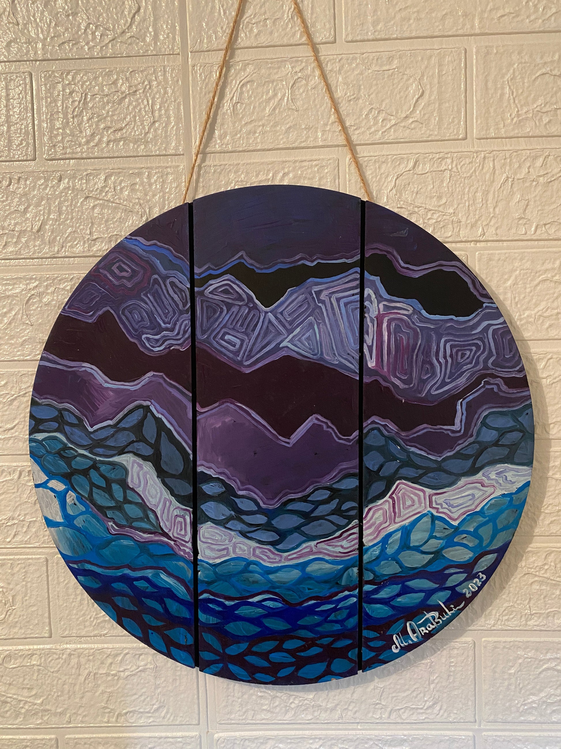 A mesmerizing abstract composition painted in deep purples, blues, and blacks, DNA of Universe explores the hidden patterns and rhythms of existence. This circular artwork is painted across three vertical wooden slats, adding a unique dimensional effect and enhancing its cosmic energy. The intricate, wave-like patterns evoke the strands of DNA and the vastness of the universe—where micro and macro worlds intertwine.
