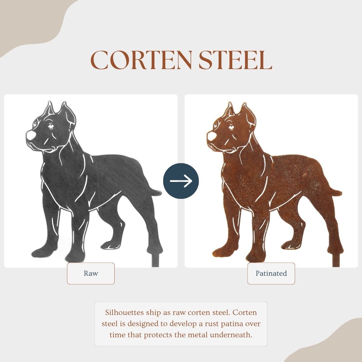 The Corten steel finish is designed to develop a beautiful patina rust coating that will change over time, protecting the steel underneath. These silhouettes ship out as raw steel and will develop a patina if left in the weather or frequently exposed to wet conditions. The color of the patina should change over time, starting as brighter orange tones and changing to darker brown tones.