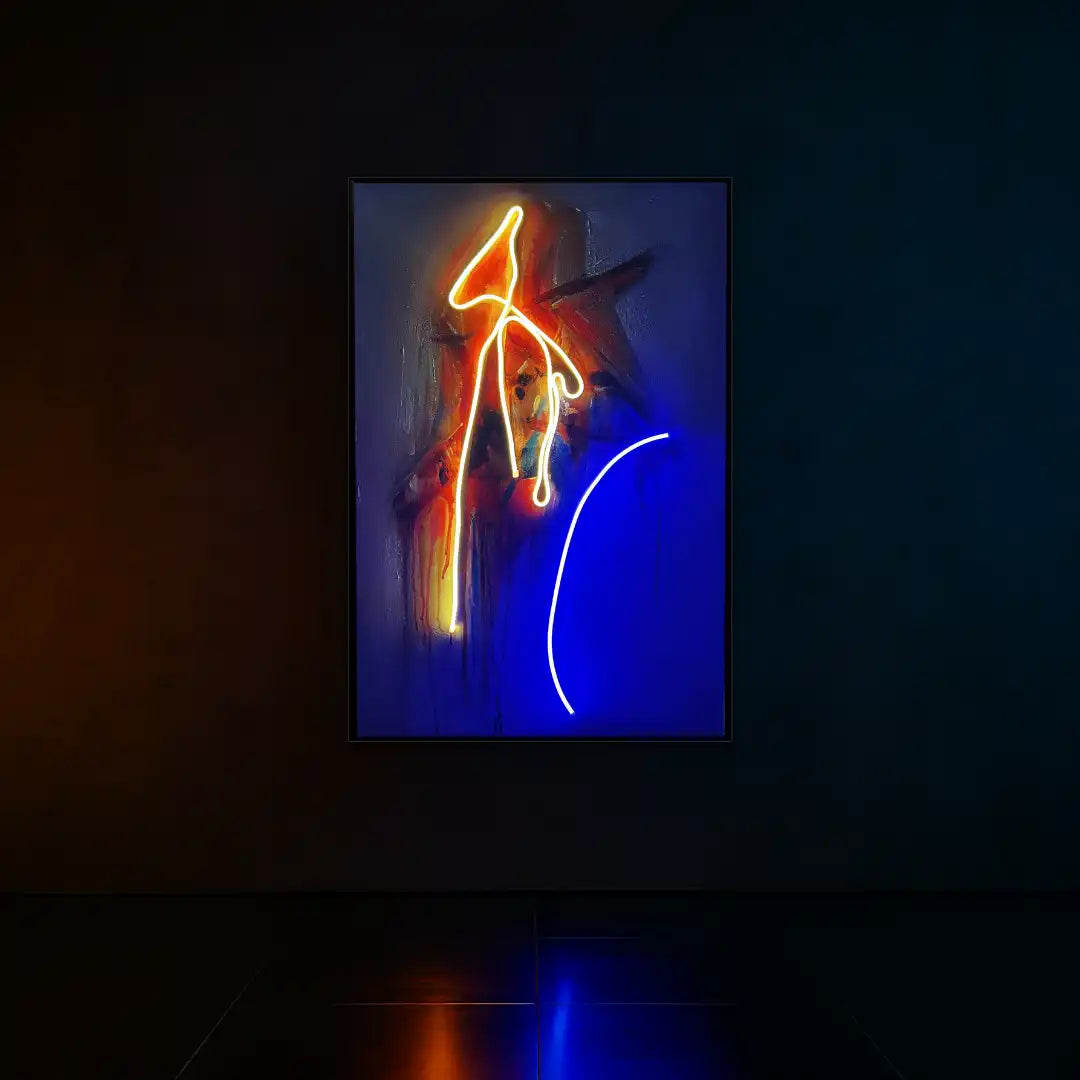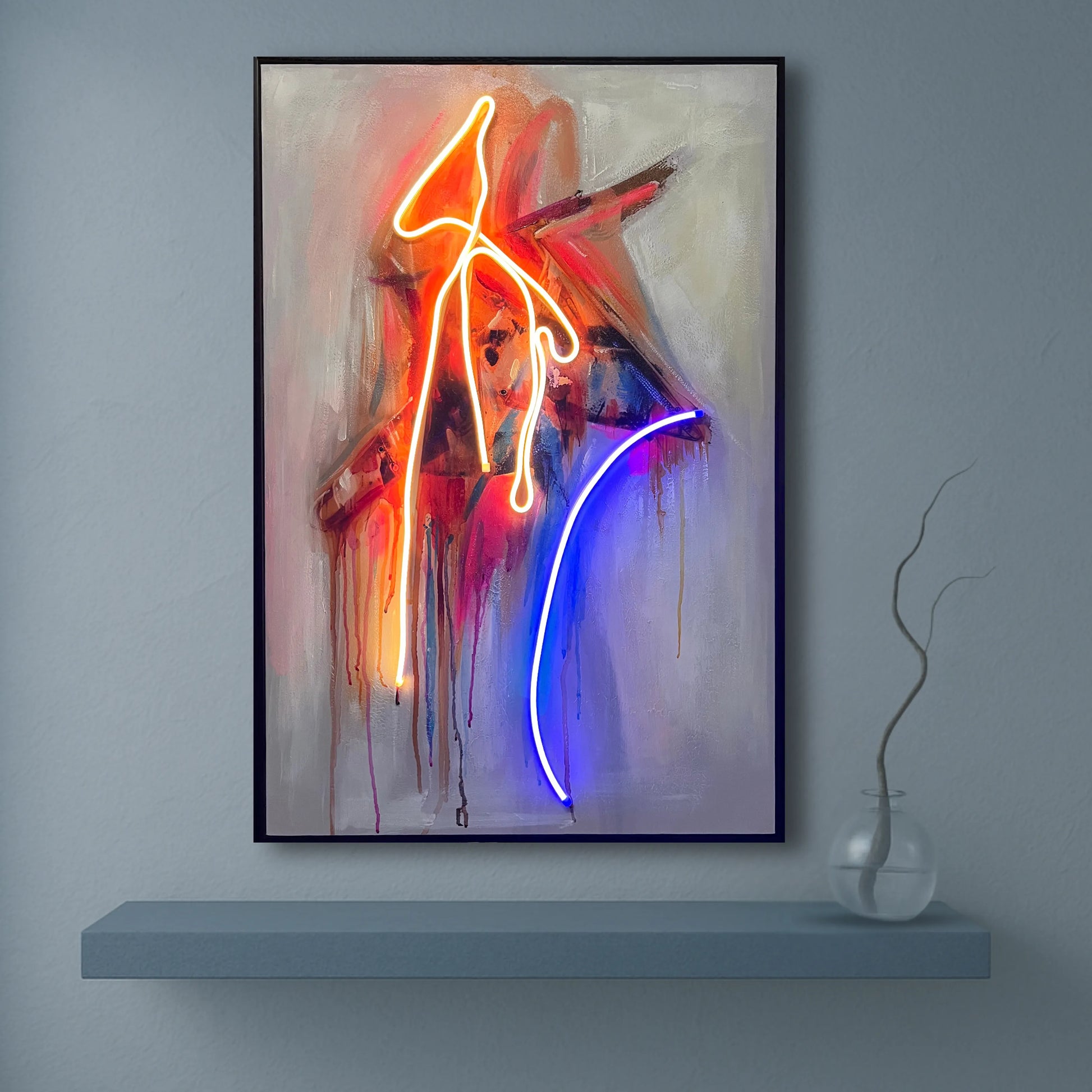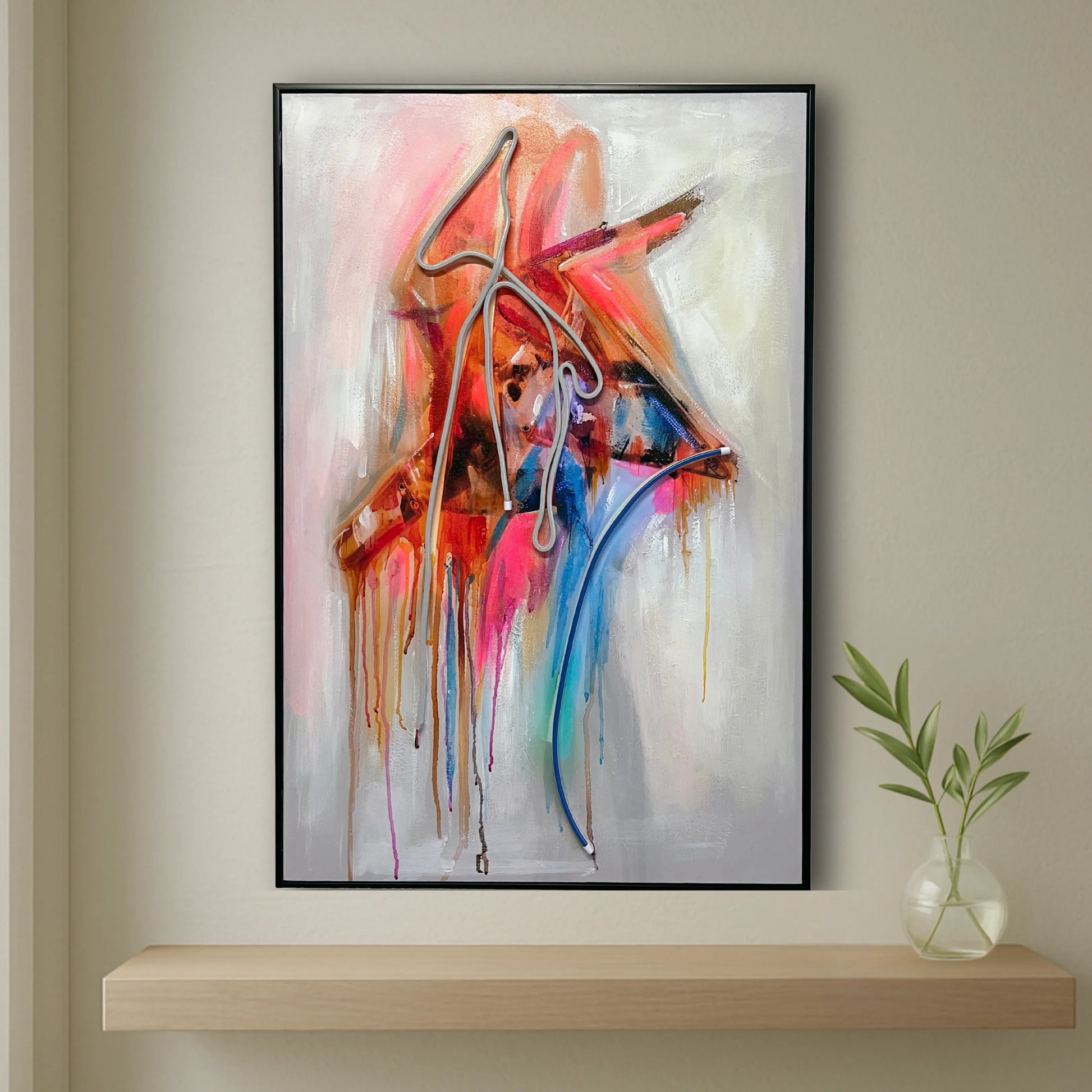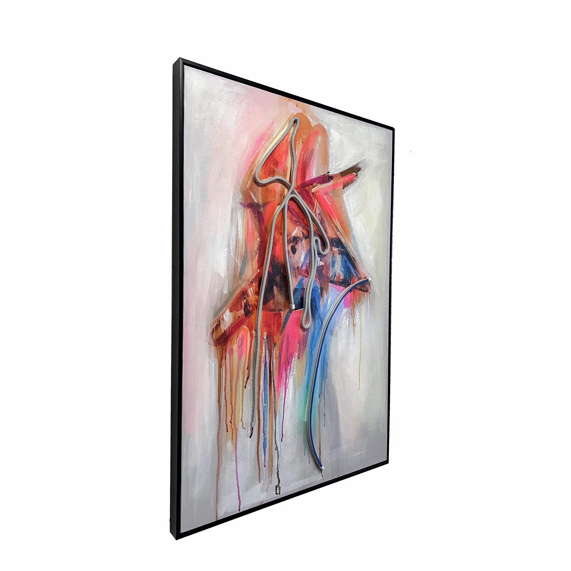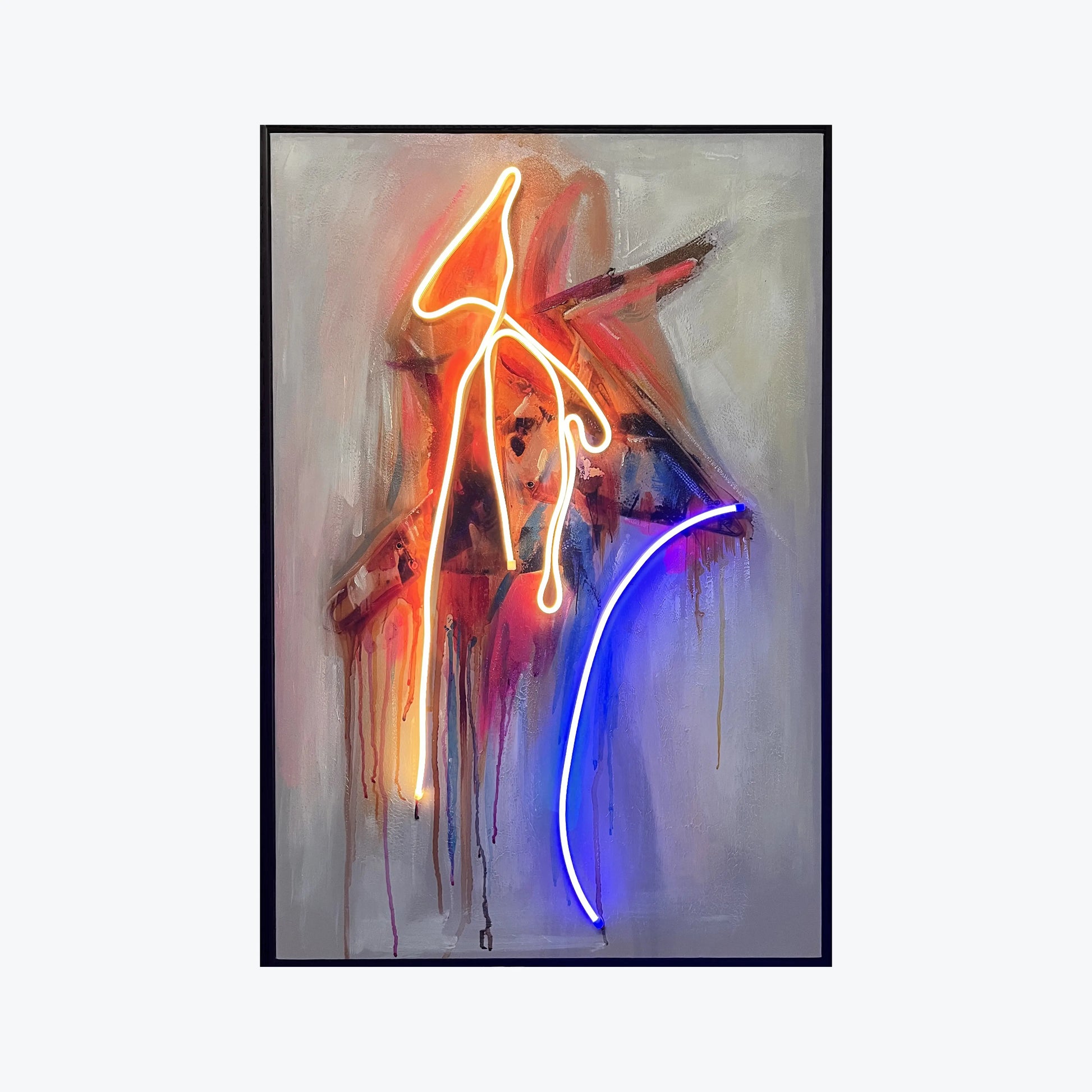 Drift Signal is a bold interplay of gesture, light, and layered abstraction. Hand-painted strokes meet sculptural neon lines, creating a composition that feels both spontaneous and intentional. The piece radiates movement and emotion—like a transmission caught mid-signal.