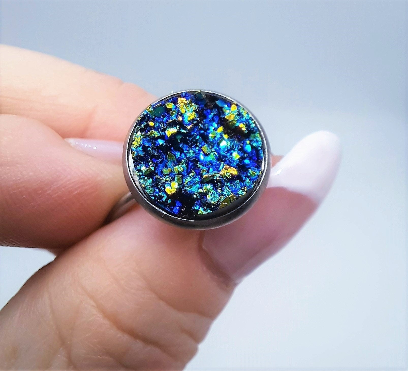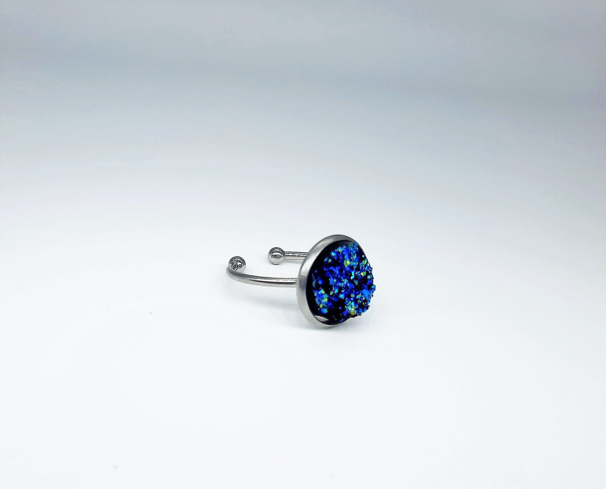 Handcrafted / Handmade Iridescent Druzy Stone, Hypoallergenic Silver Stainless Steel Cuff Finger Ring, Size 7