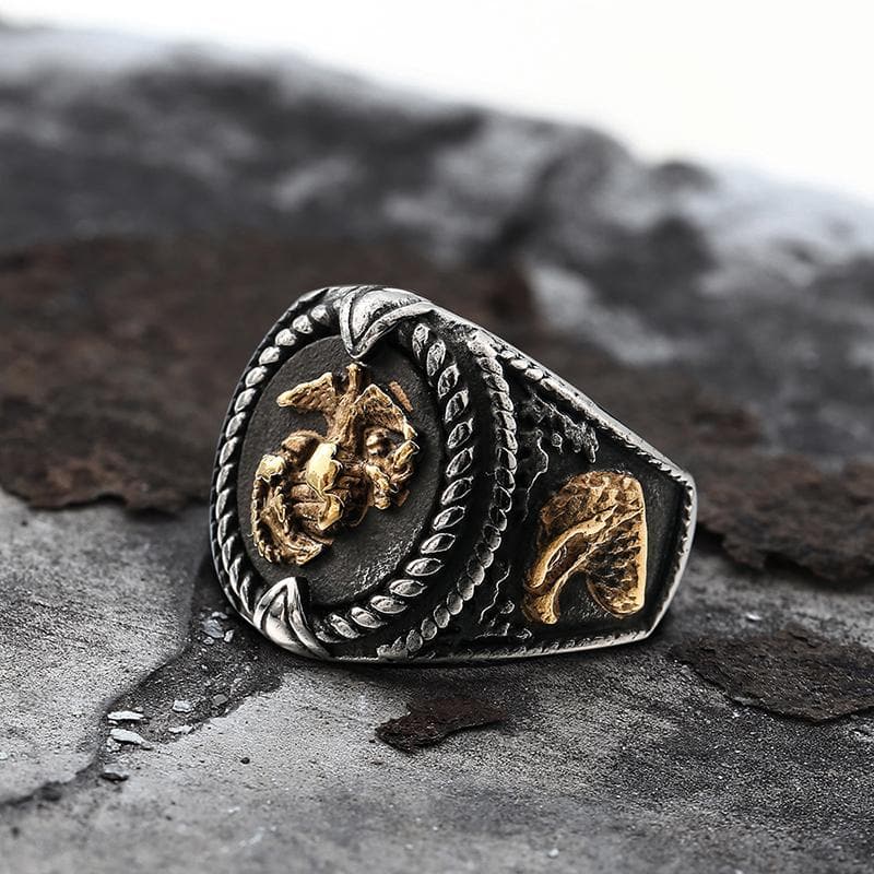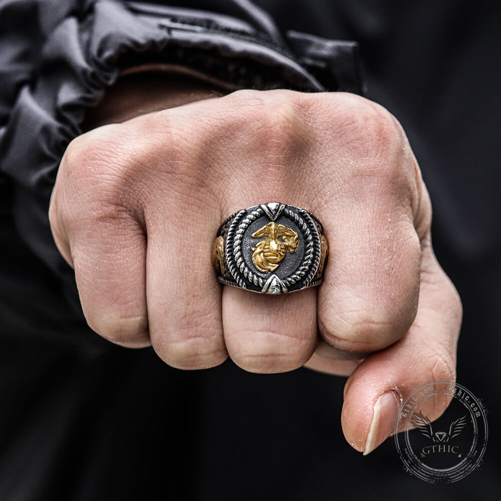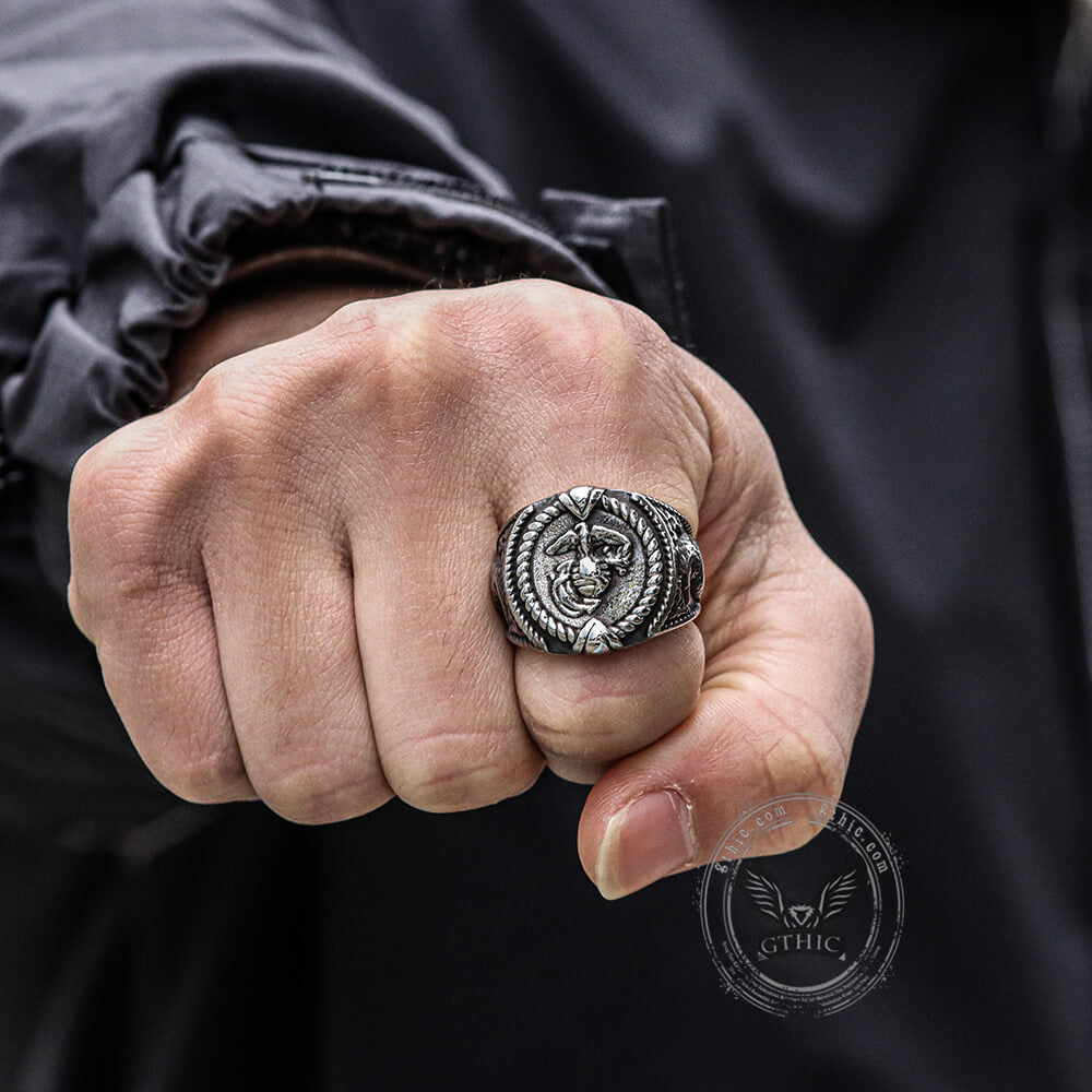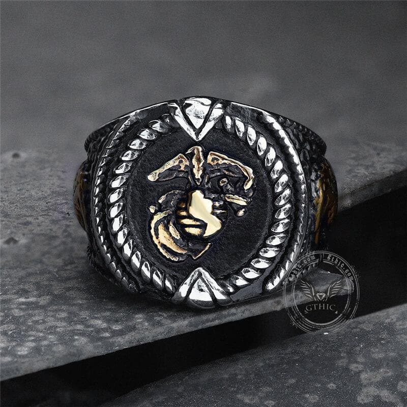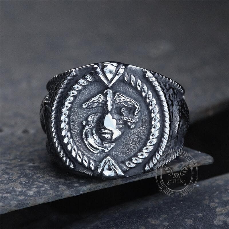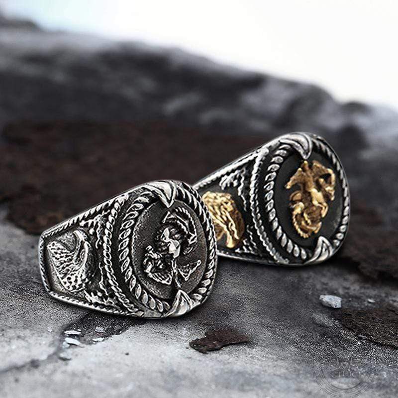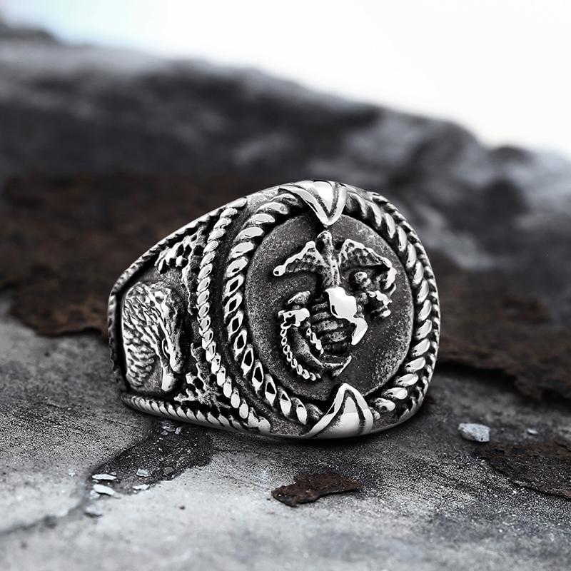 The Eagle, Globe, and Anchor is the official emblem and insignia of the United States Marine Corps. It is commonly referred to as an EGA. This ring is made of stainless steel with the theme pattern of navy anchor that creates a look that is both elegant and rugged, making it great for any biker. Men's stainless steel ring, marine anchor ring. It is a comfortable yet masculine ring, one that you will not be disappointed with. Get yours today!
