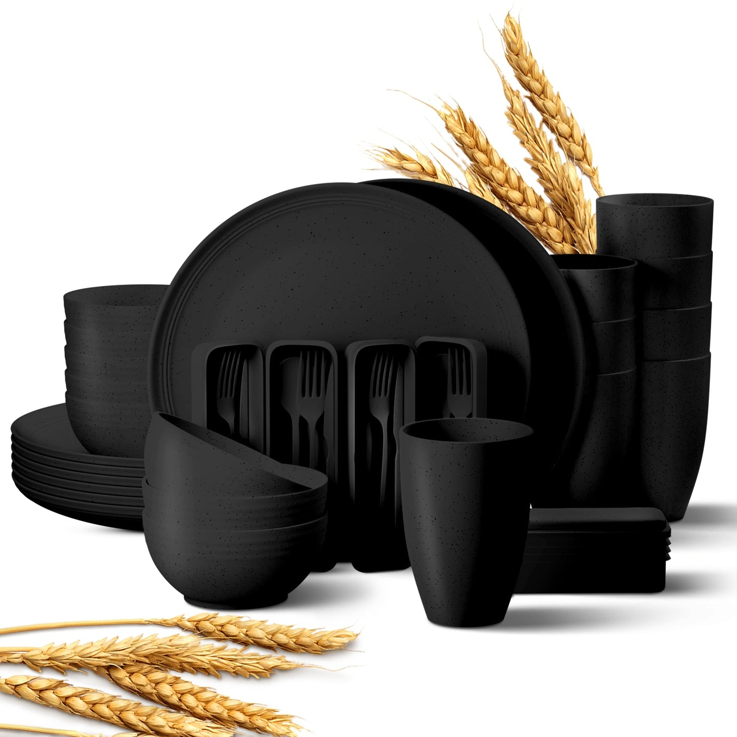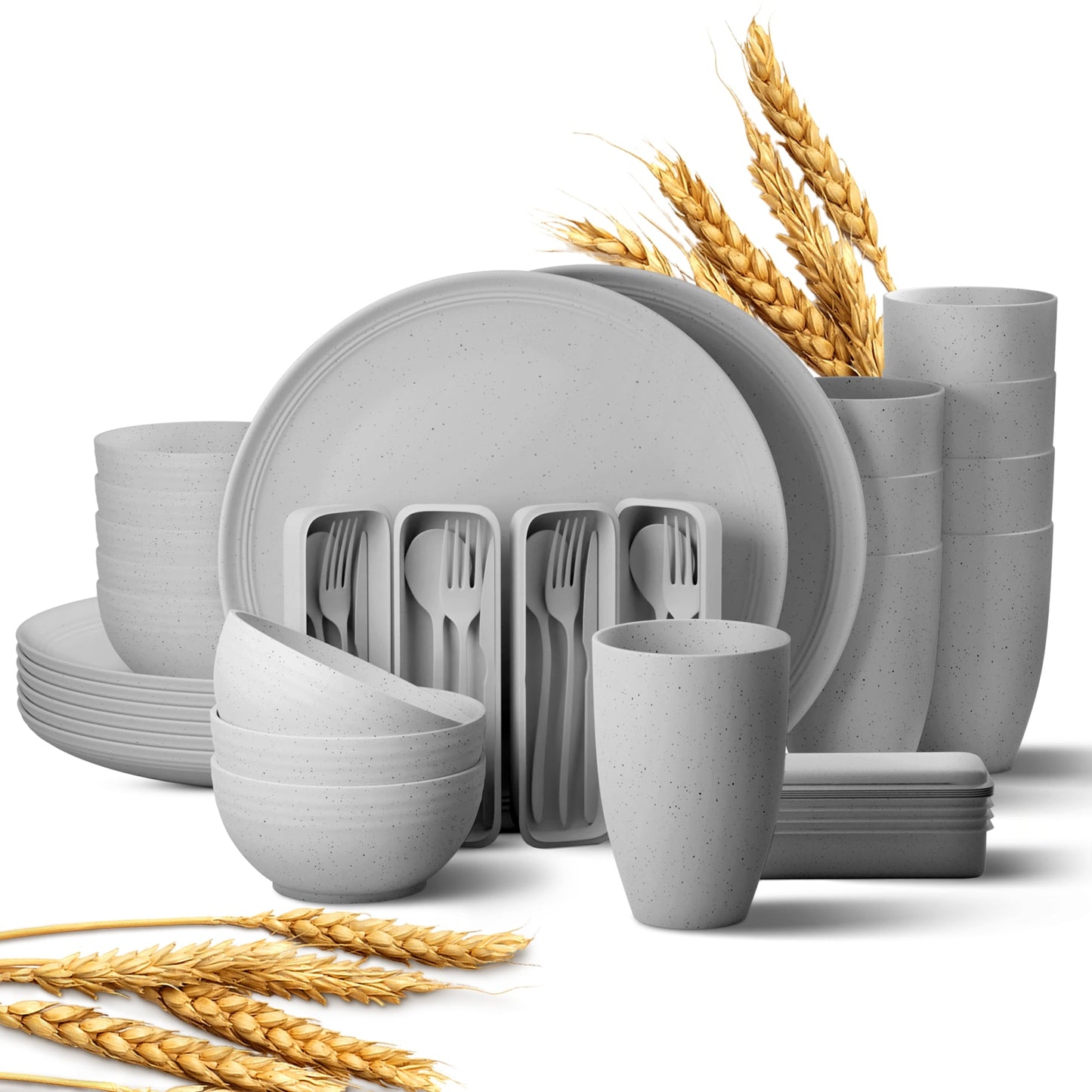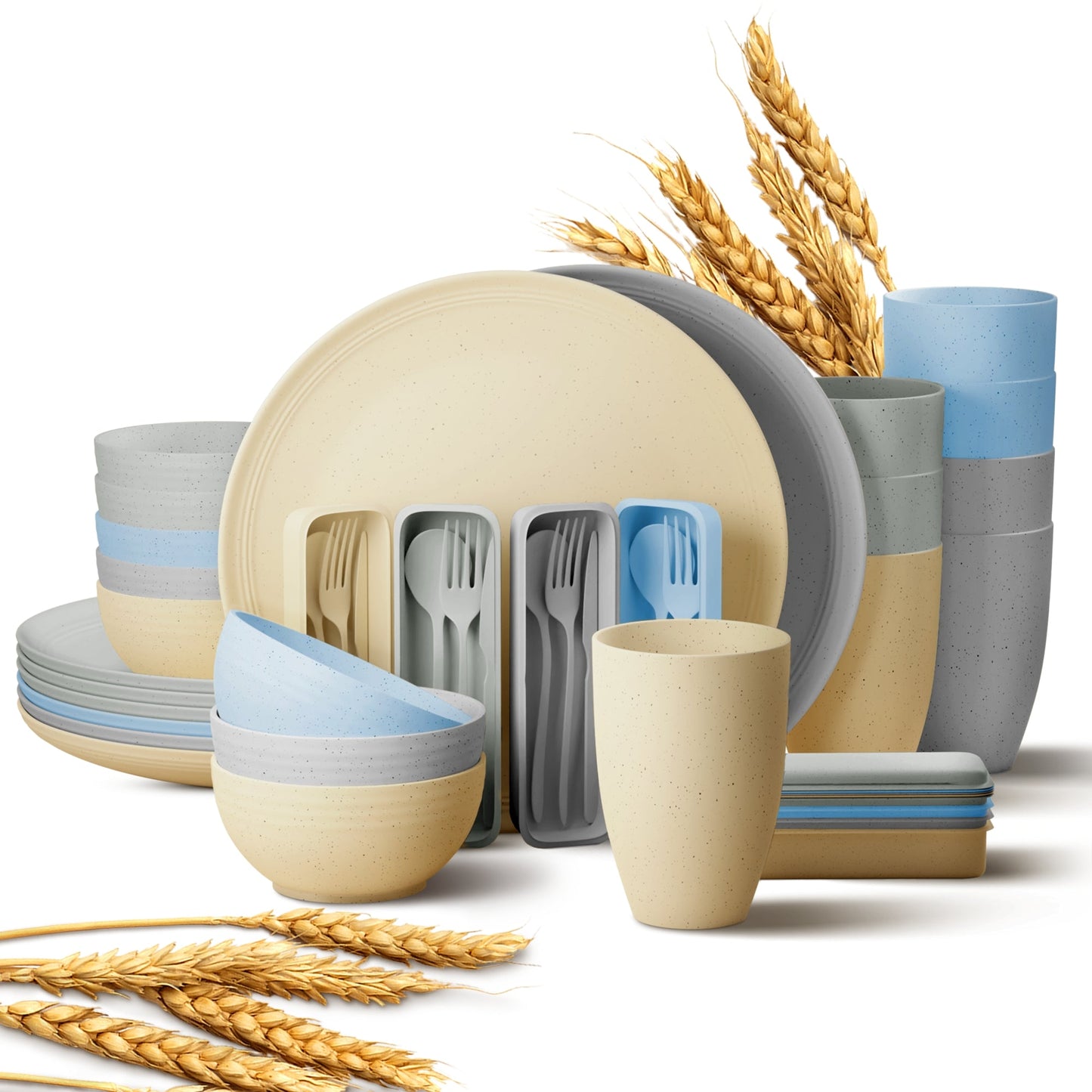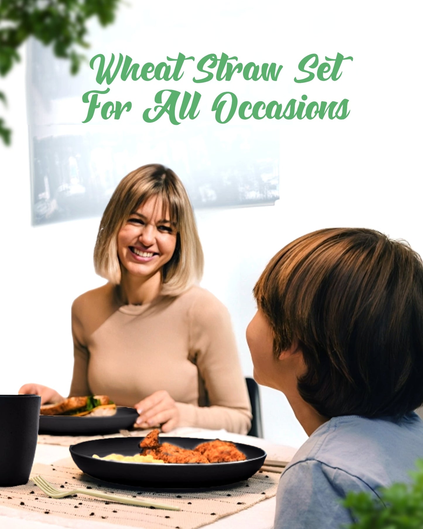 - Complete Wheat Straw Dinnerware Set: A stylish and durable dinnerware set, including plates, bowls, cups, and utensils made from microwavable wheat straw/plastic, perfect for an upscale tabletop presentation. The set for 4 contains 4 Plates, 4 Bowls, 4 Cups, and 4 Cutlery sets. The set for 8 contains 8 Plates, 8 Bowls, 8 Cups, and 8 Cutlery sets. The set for 12 contains 12 Plates, 12 Bowls, 12 Cups, and 12 Cutlery sets.