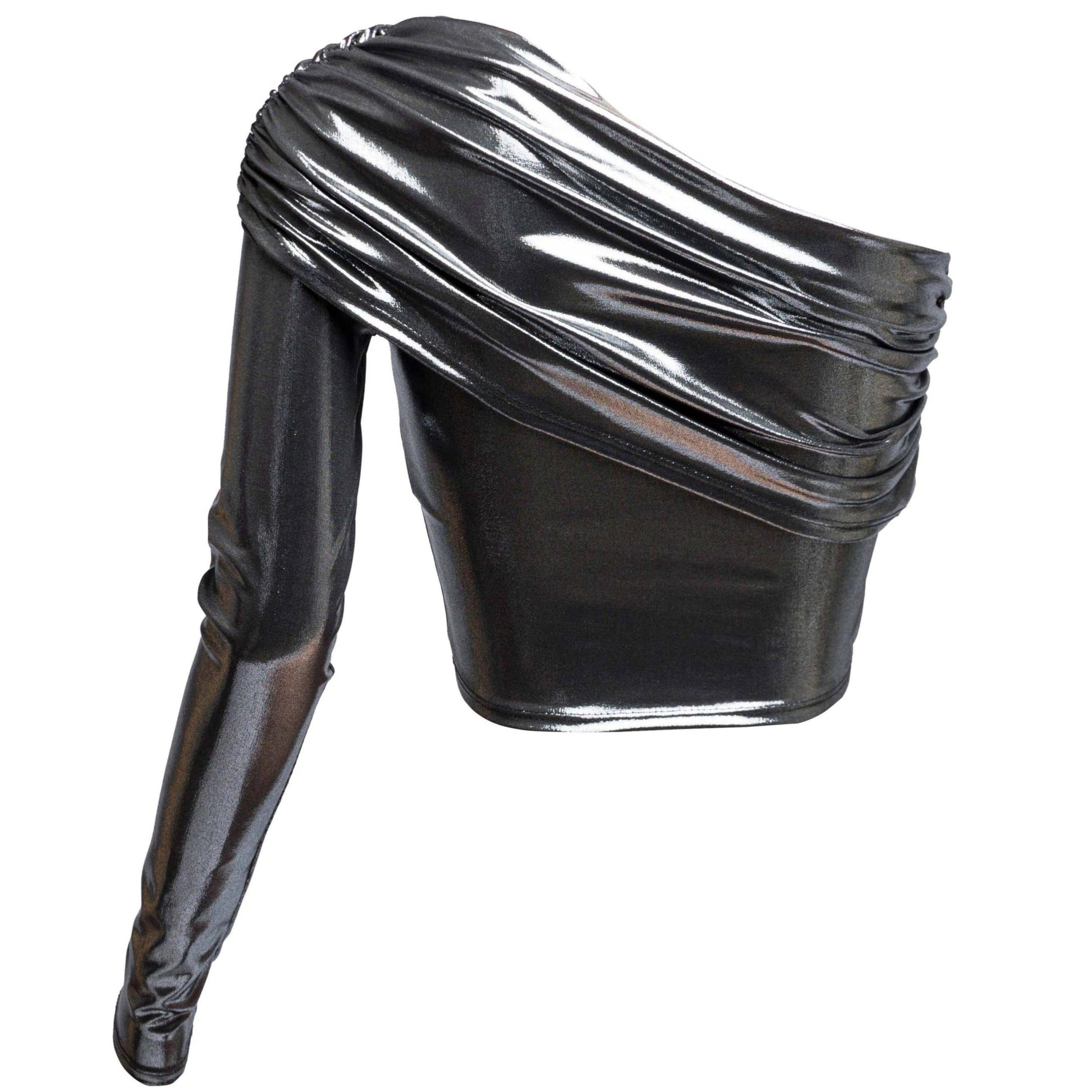 Turn heads with this striking fold-over one-shoulder top, crafted from a high-shine liquid foil fabric that hugs your shape with just the right amount of stretch.