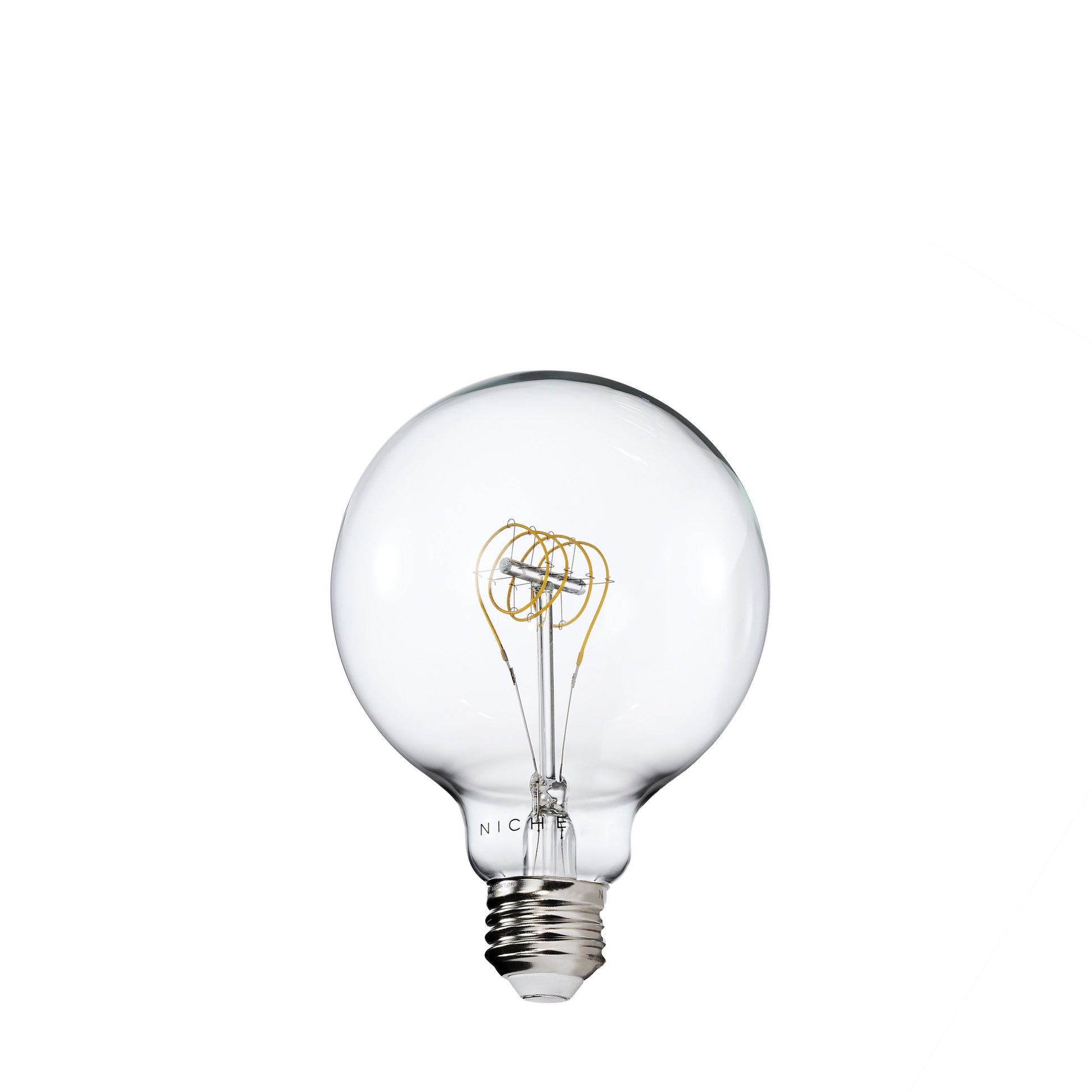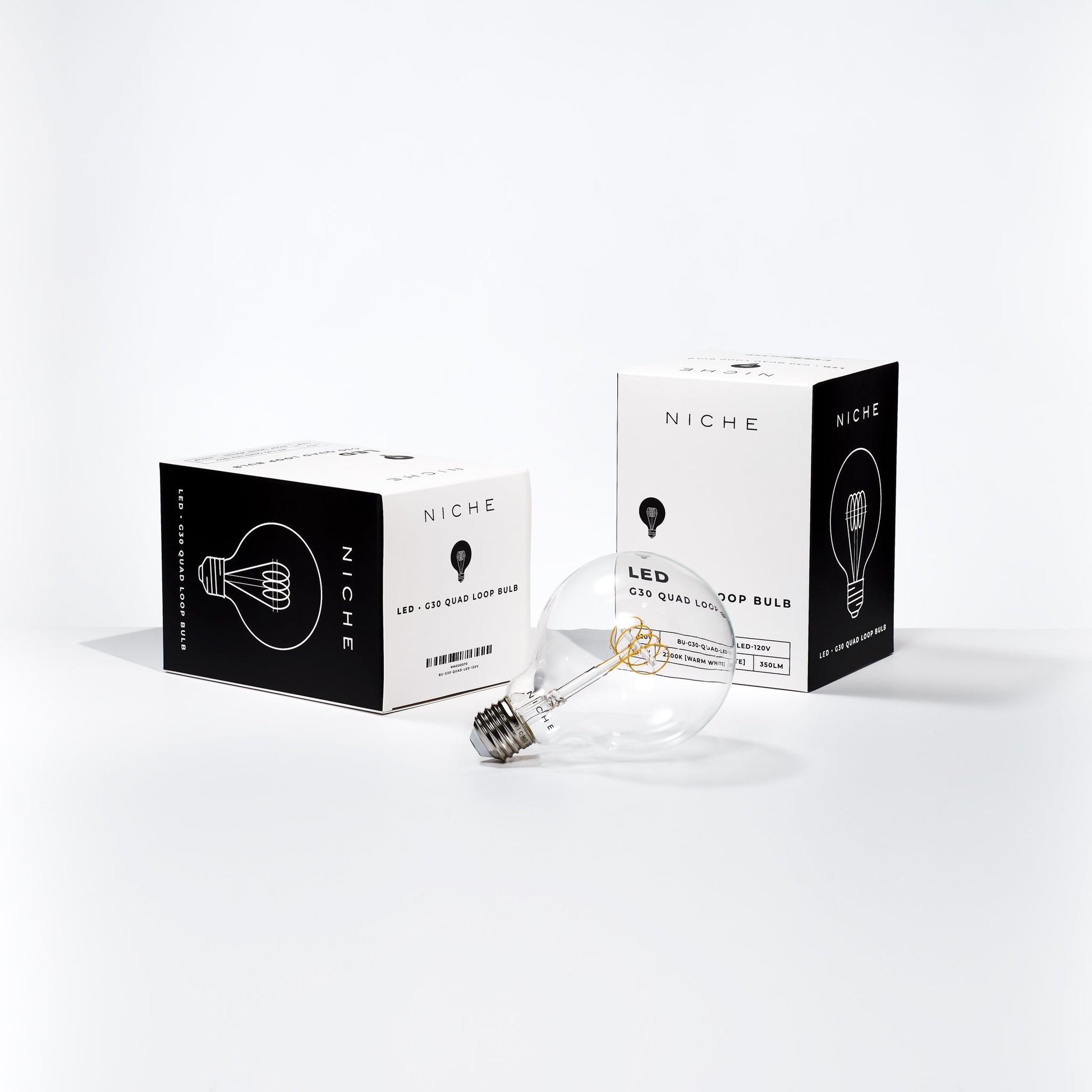 The warm glow of the G30 Quad Loop Bulb is essential for creating a relaxing and balanced feel throughout your space. This LED bulb has a forever classic round shape that looks stunning when centered within most large handmade glass pendants. It is compatible with 120V Cord Sets. We recommend installing this bulb on a dimmer to adjust your light from soft white to a relaxing warm glow.