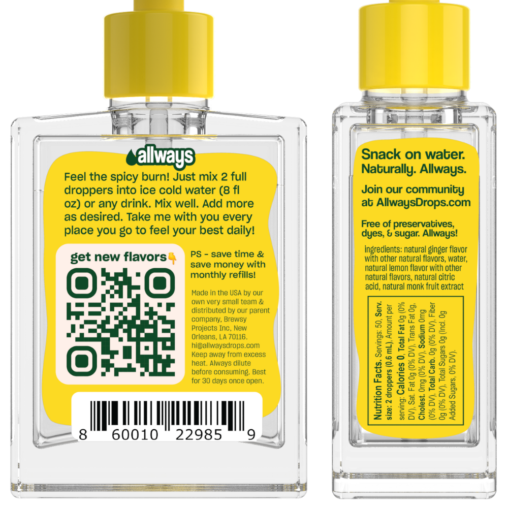 Allways made with all-natural ingredients and sweetened with monk fruit, these zero-calorie, zero-sugar natural water enhancer drops turn your drink into the perfect balance of refreshing and spicy without the sugar crash. Packaged in a sustainable 30 mL glass bottle with an easy-to-use dropper, each bottle makes up to 50 delicious 8 oz drinks, reducing waste from single-use plastic bottles. Stay hydrated on-the-go and enjoy guilt-free flavor, all while making a more eco-conscious choice.