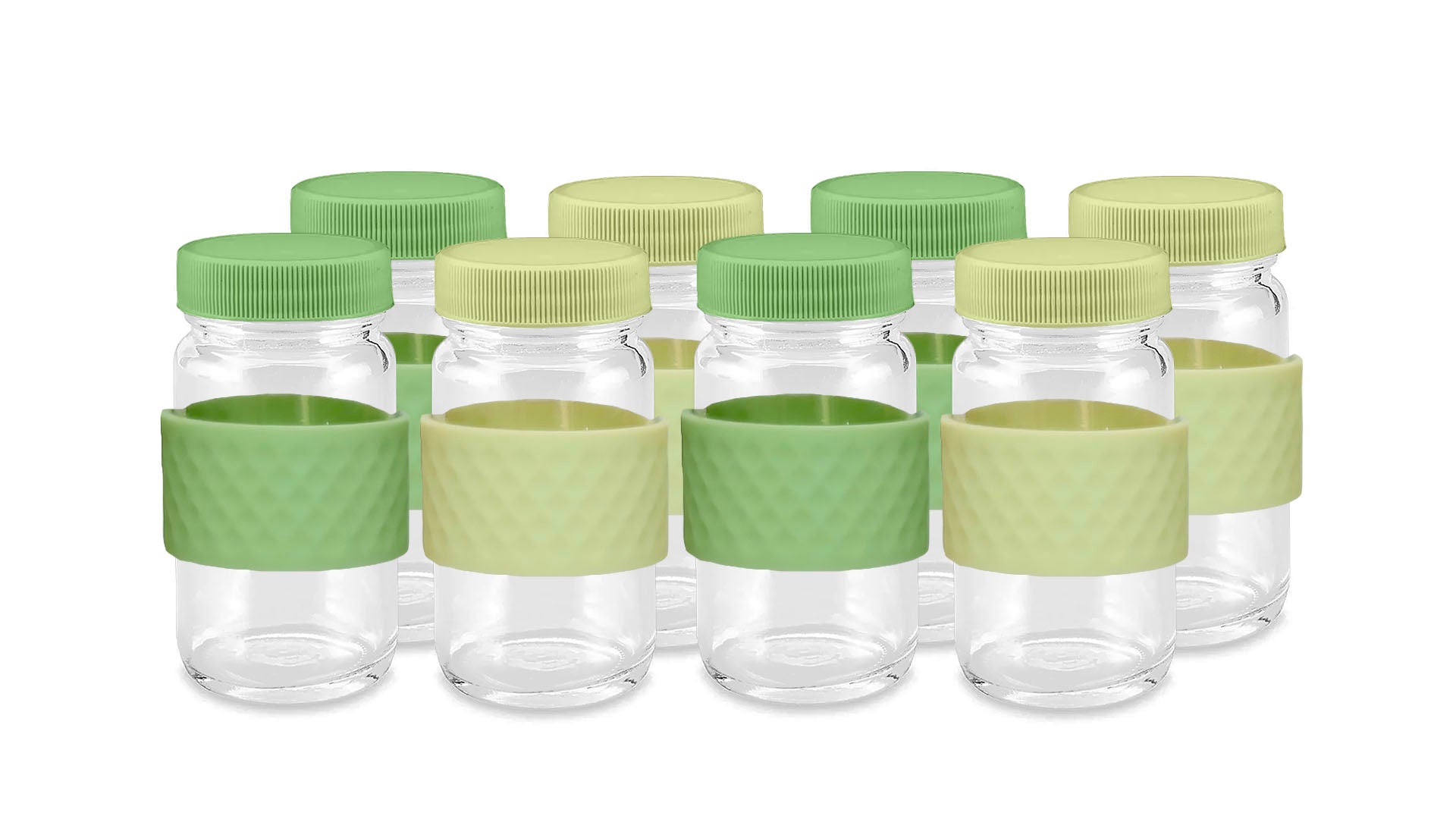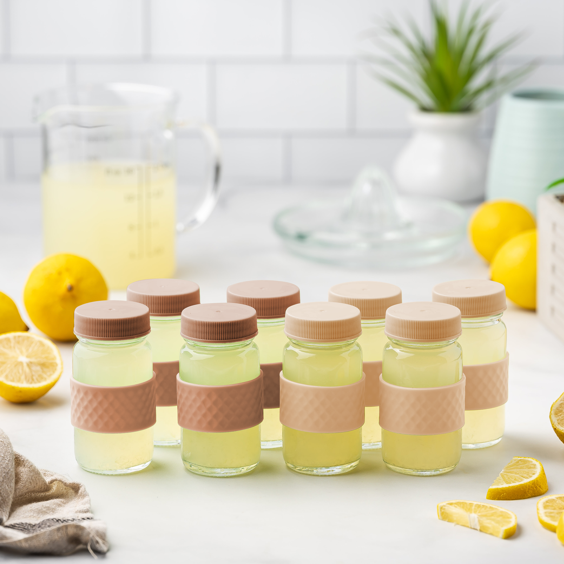 Glass Juice Shot Bottles Set w/ Colored Lids & Grip Bands, 8 Pack Set, 2oz