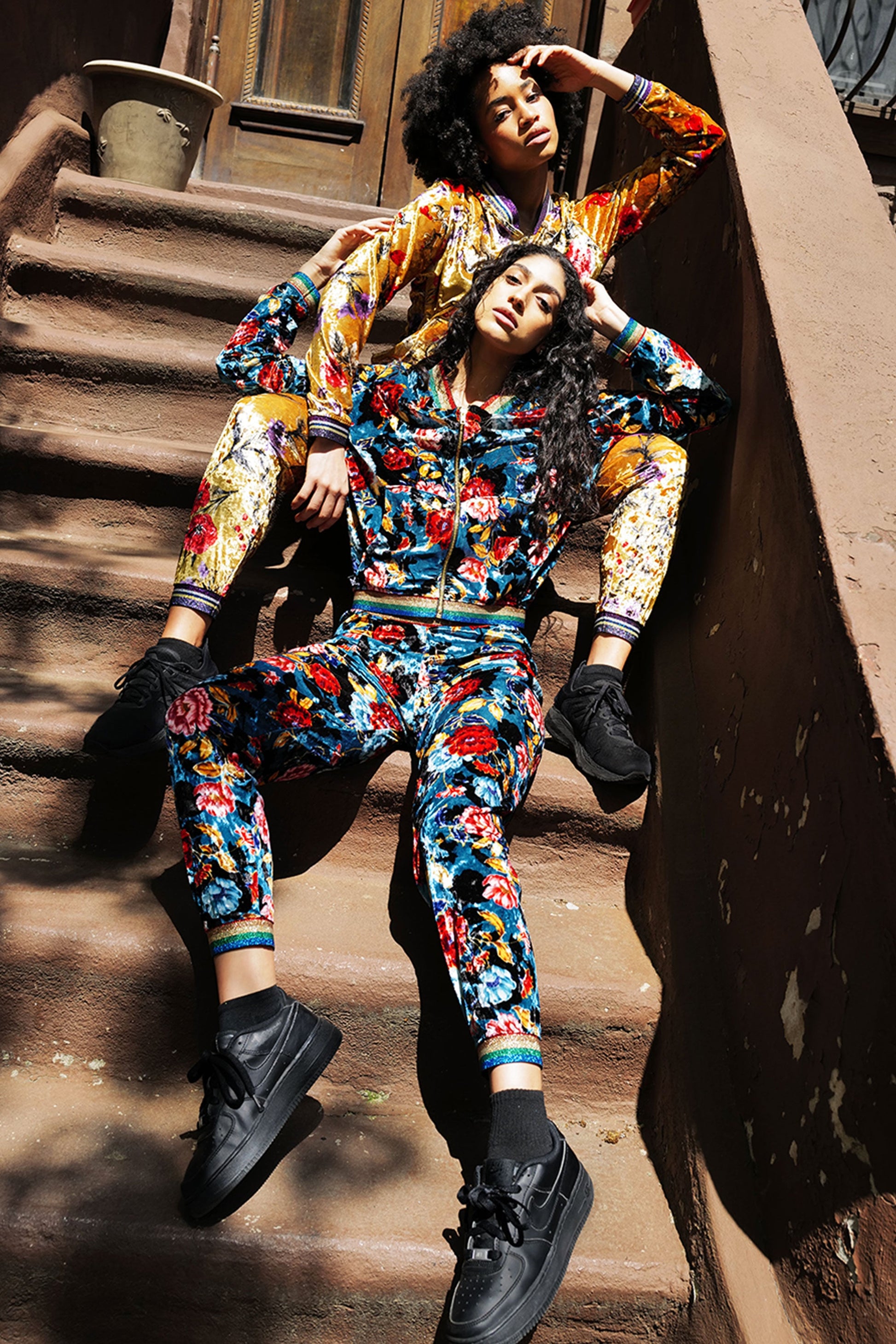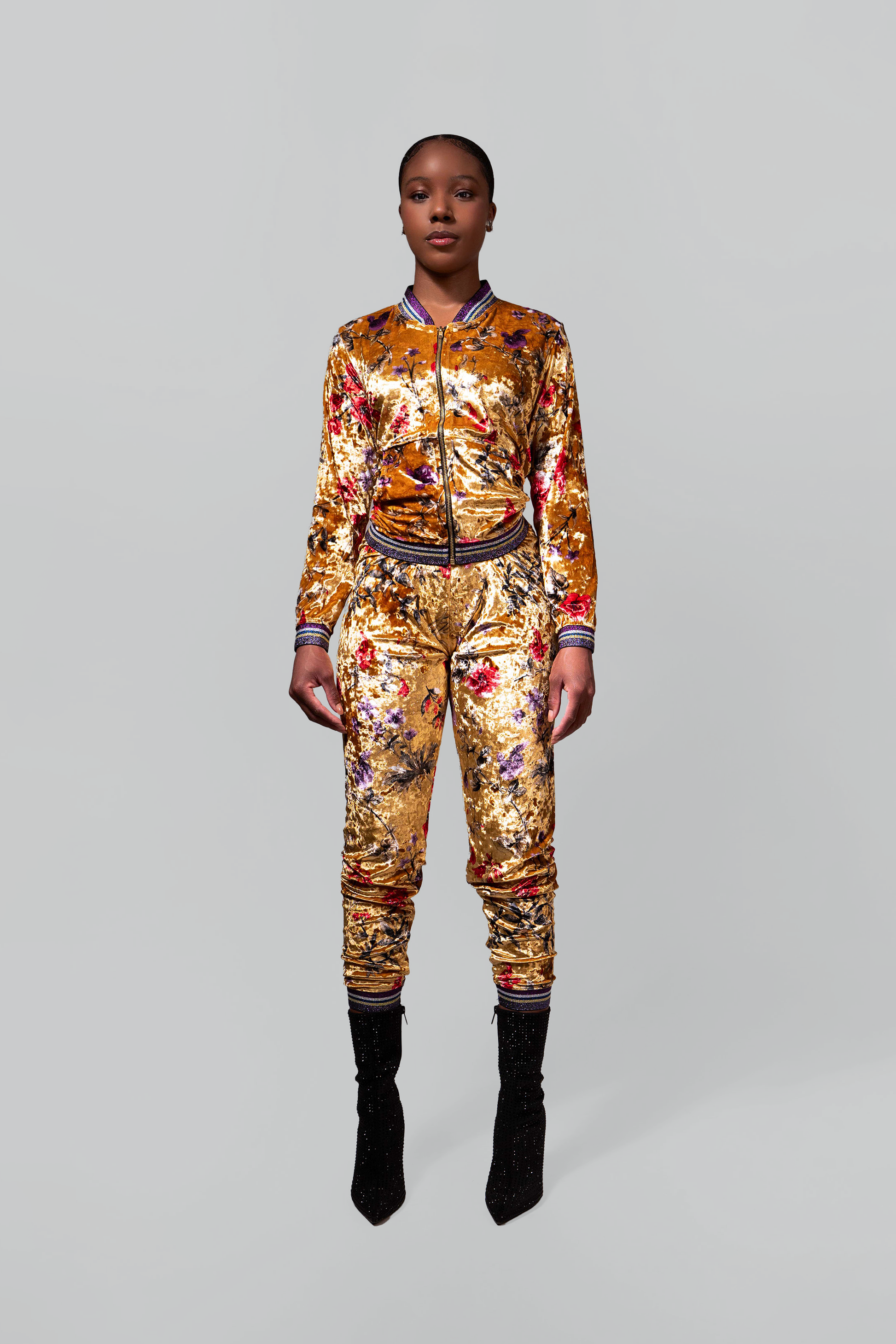 The Goddess Tracksuit in Gold features luxurious soft velour fabric with purple and red floral accents. The long-sleeve top is finished with a front zipper, while purple, white, blue, and gold elastic trim adds a stylish touch at the neckline, waistline, wrists, and ankles. This set is warm enough for the Winter months while providing a shimmer or gold to shine through those chilly and grey days.
