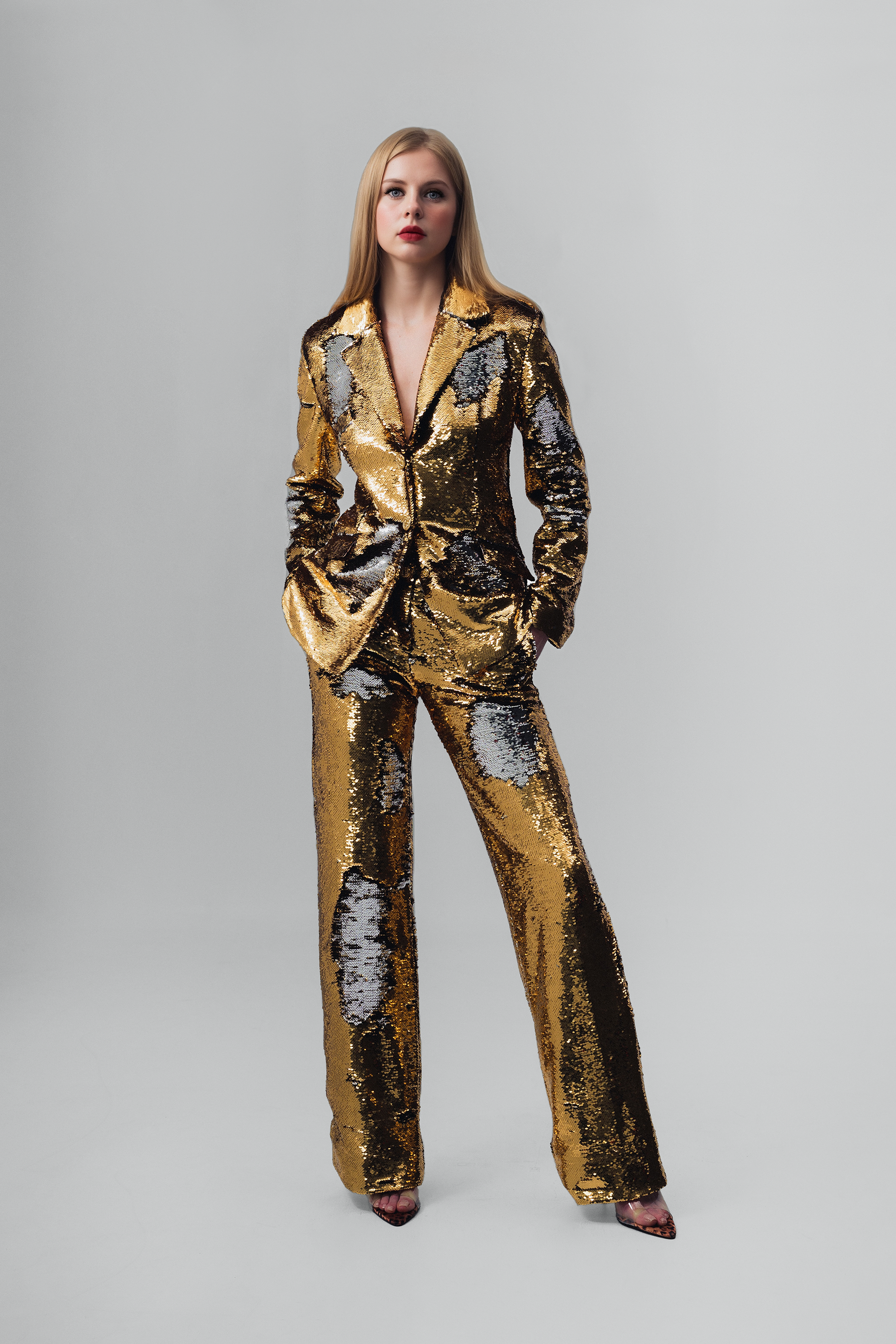 The Goldie Sequin Blazer features reversible gold and silver sequins with three gold buttons. Designed with a notch lapel, split tail, and three pockets, it effortlessly combines modern style and functionality. This stunning look is the perfect show stopper for any event.