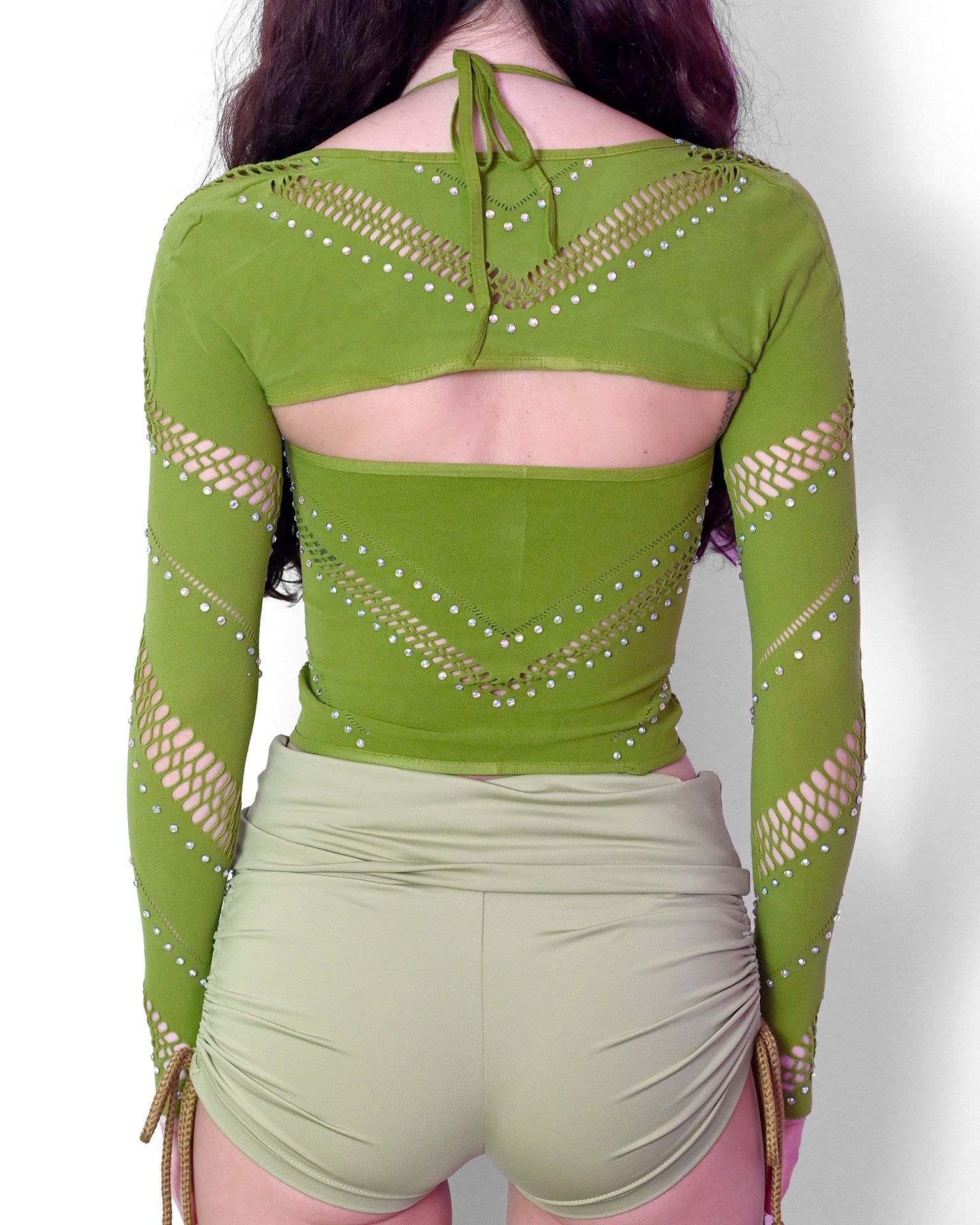 The Halter Bolero Set is a versatile two-piece top crafted with high-stretch seamless technology for a flexible and flattering fit. This one-size-fits-most set features intricate cutout details and iridescent rhinestones. The fully adjustable tie-behind-the-neck halter can be worn solo or paired with the matching bolero for a comfy, boho-inspired festival outfit. The earthy green shade, paired with shimmering embellishments, offers endless styling possibilities—from a fully accessorized rave look to a relaxed, campground-casual vibe.