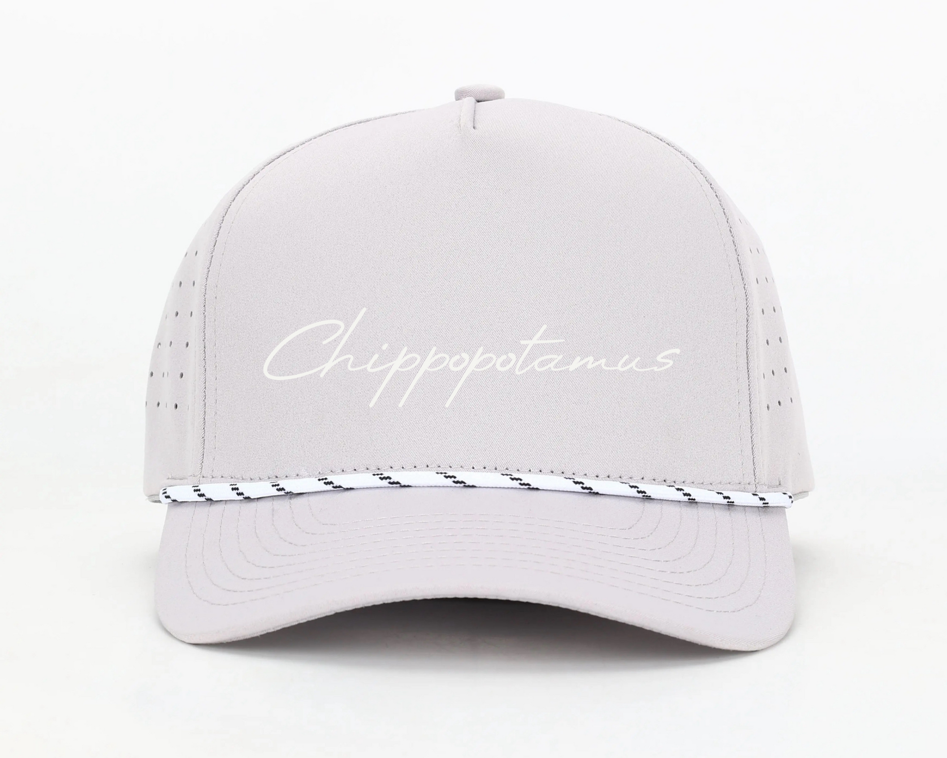 Waterproof material, sweatproof band. 5 panel classic laser cut drilled hole hat in color grey. Embroidered Chippopotamus name in the front.