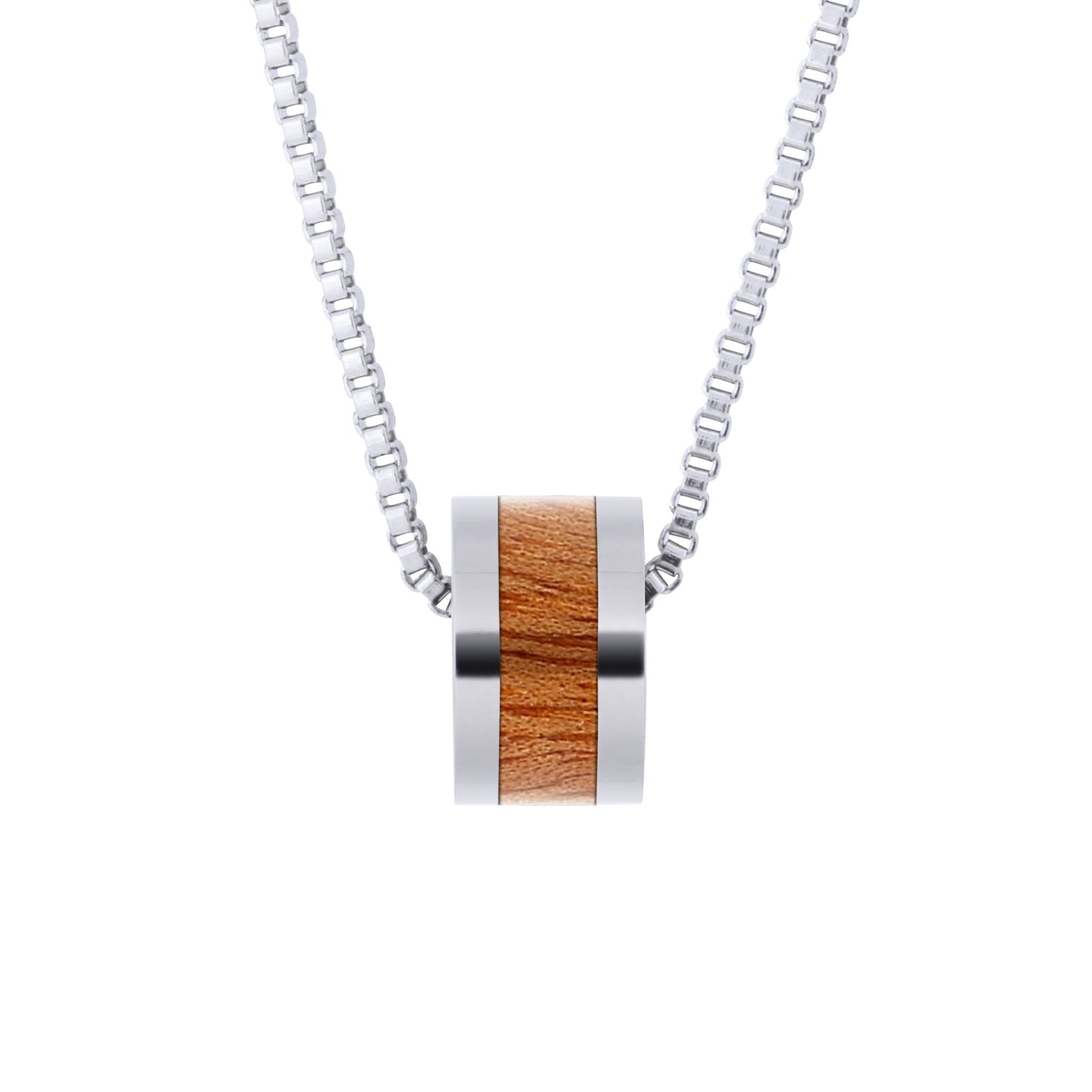 Stainless steel barrel bead pendant inlaid with responsibly sourced Gum Burl (Tasmanian Oak/Stringybark) timber. Barrel bead also fits most popular charm bracelets.