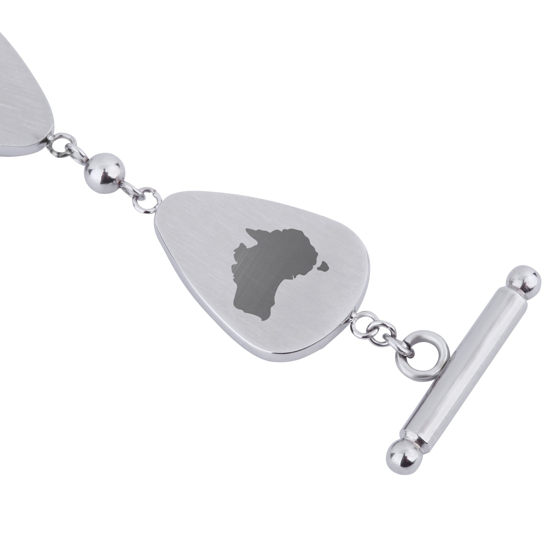 Stainless Steel water drop link bracelet with Gum Burl (Tasmanian Oak/Stringybark) timber inlays. Adjustable toggle and loop closure.