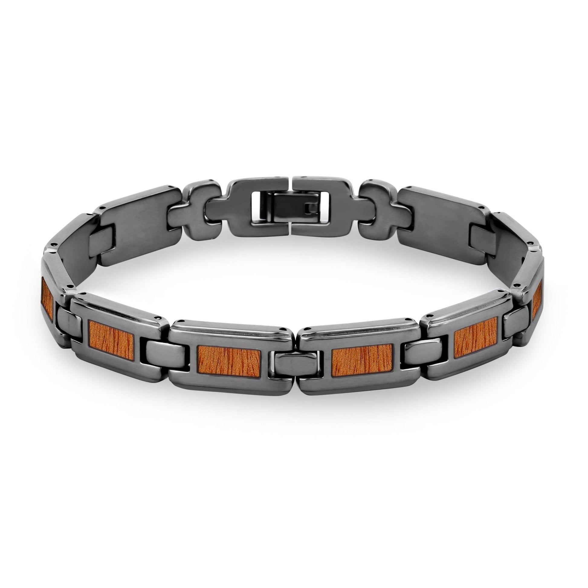 Ladies Gunmetal plated stainless steel link bracelet with Australian Gum Burl (Tasmanian Oak/Stringybark) inlays. Links are removable to adjust for size.