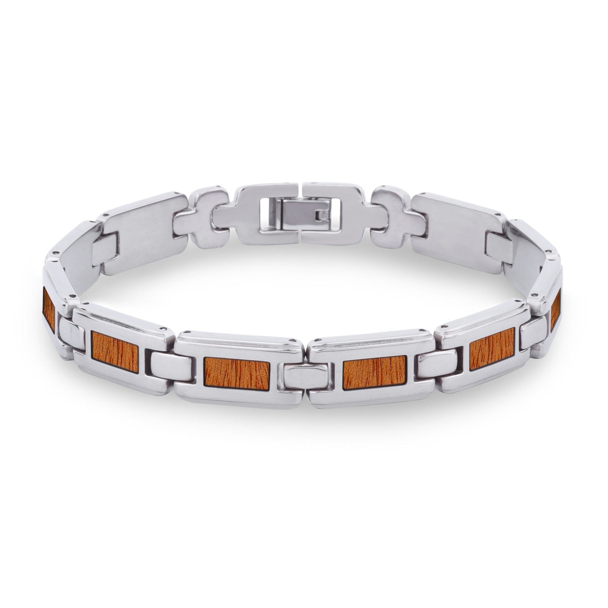 Men's stainless steel link bracelet with Australian Gum Burl (Tasmanian Oak/Stringybark) inlays. Links are removable to adjust for size.