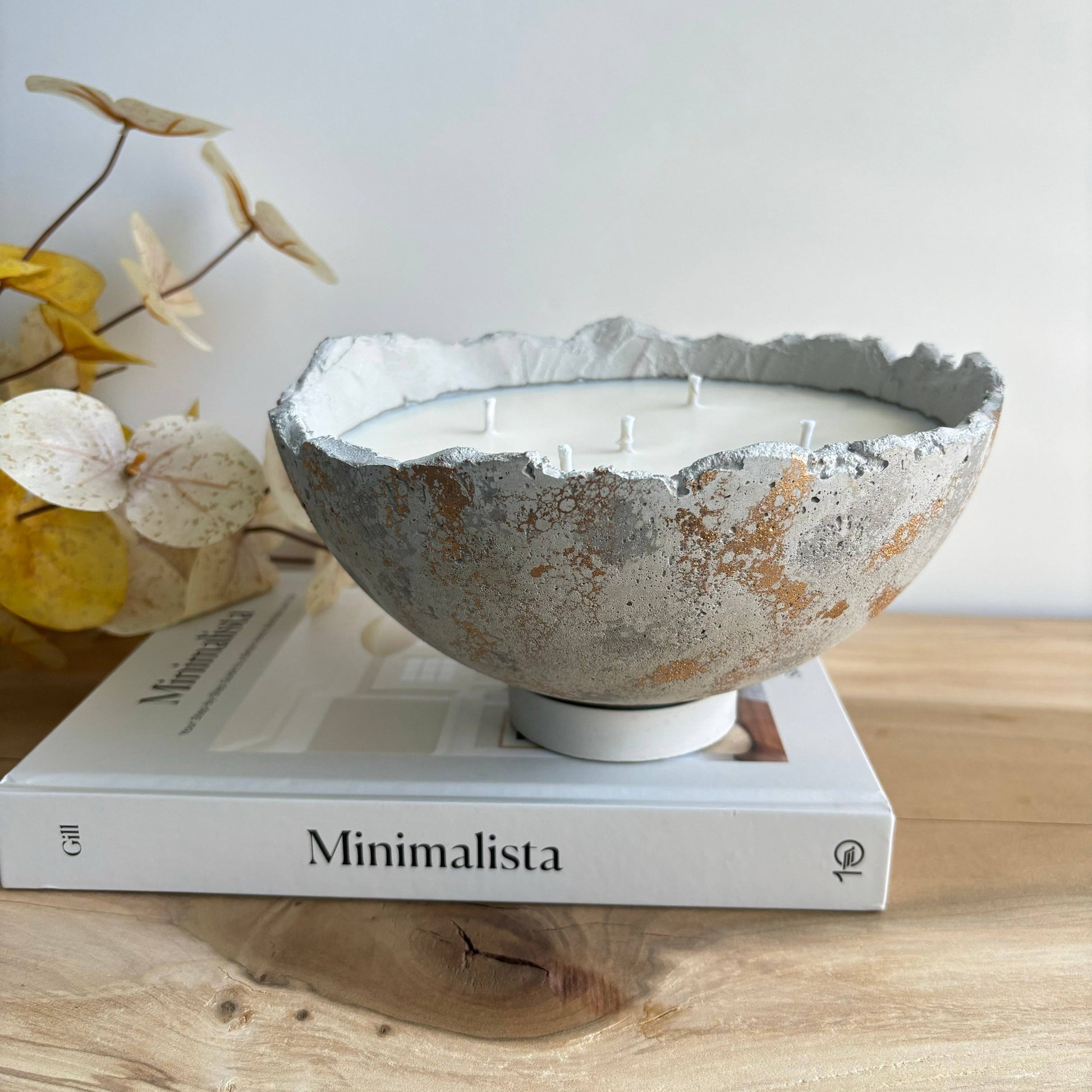 Bring an artful blend of elegance and raw beauty to your space with the Half Moon Concrete Bowl Candle. The bowl’s light gray concrete, enhanced with silver and gold accents, adds character and sophistication to any decor. Its unique pointed base is stabilized by a secure ring to ensure it remains steady and safe. Details: - Measuring 8” in diameter and 4” in height - 30 oz of wax - soy and coconut wax blend, phthalate-free fragrance, cotton wicks Scents: * Moroccan Cashmere: Bergamot, Powder, Sugar, Lavender, Vanilla, Ylang Ylang, Amber, Musk, Sandalwood * Fraser Fir: Cypress, Lemon Peel, Evergreen, Cedar, Fir, Amber, Moss * Oakmoss & Amber: Sage, Orange, Grapefruit | Lavender | Amber, Tonka, Bean, Oakmoss * Blue Spruce: Eucalyptus, Mint | Spruce, Moss, Evergreen | Cedar, Amber Note: As each piece is handmade, natural variations and slight imperfections in texture, color, and finish make every bowl candle unique. These characteristics highlight the artistry.