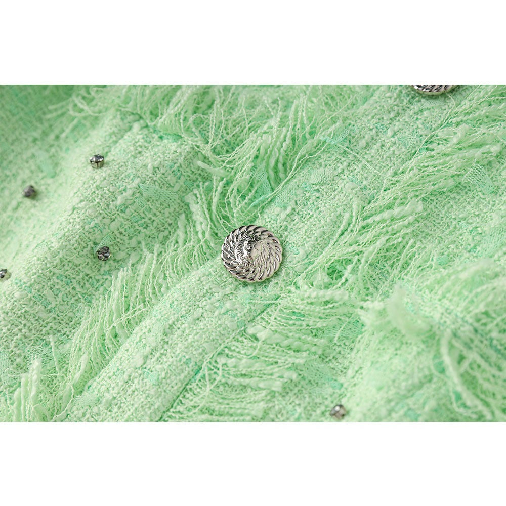 The "neck hanging" halter neckline and the short skirt come together to create a bold and confident look. The silhouette, designed for movement and nightlife, is meant to be the center of attention. This dress, with its elaborate detailing, is the perfect garment for any party or evening event where fashion is the protagonist and creativity is the standard.