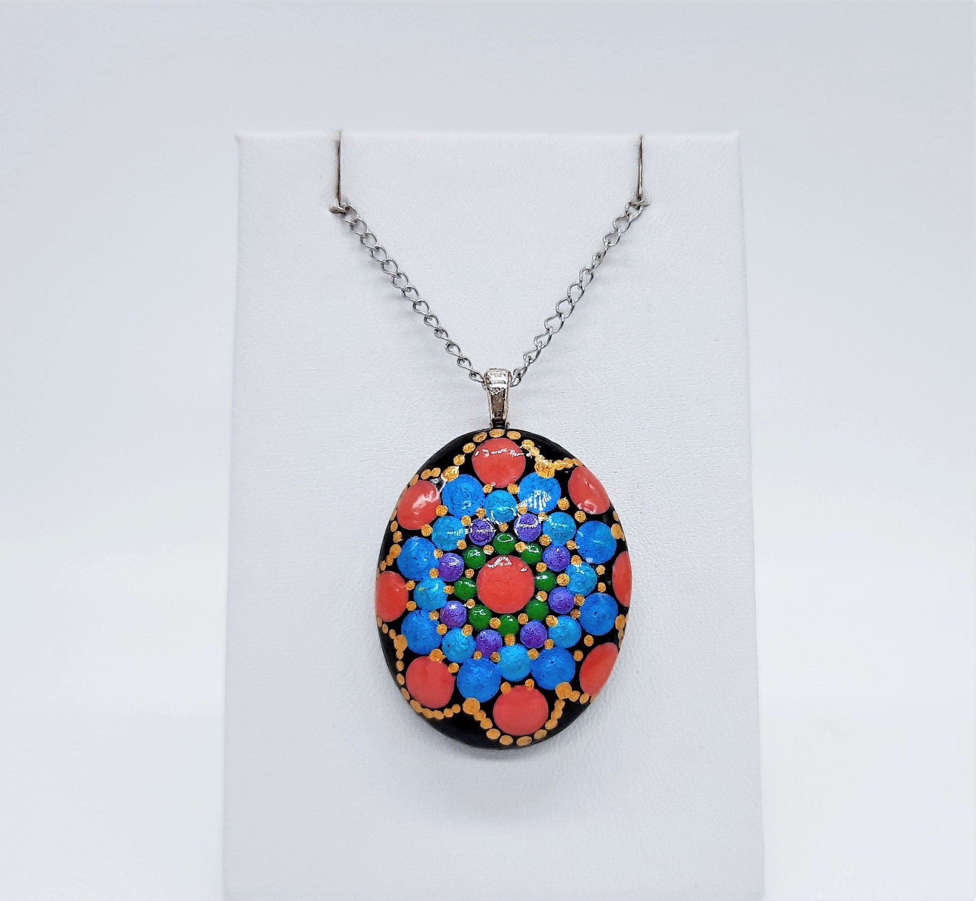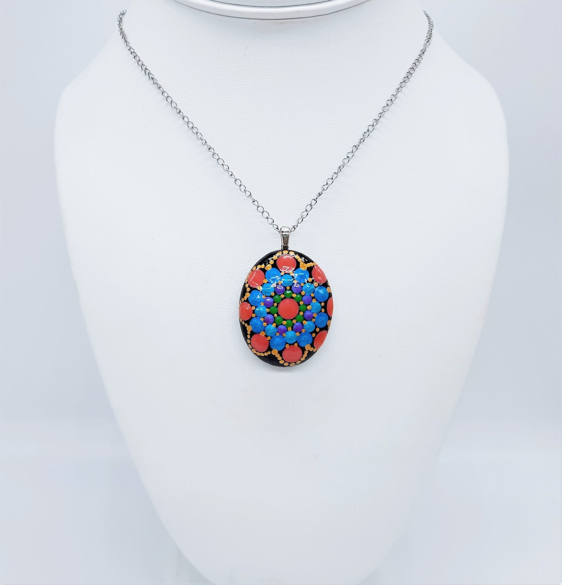 Hand-painted, one of a kind, approximately the size of a fifty cent piece, sealed with resin, comes with a hypoallergenic stainless steel 18" chain with lobster claw closure.
