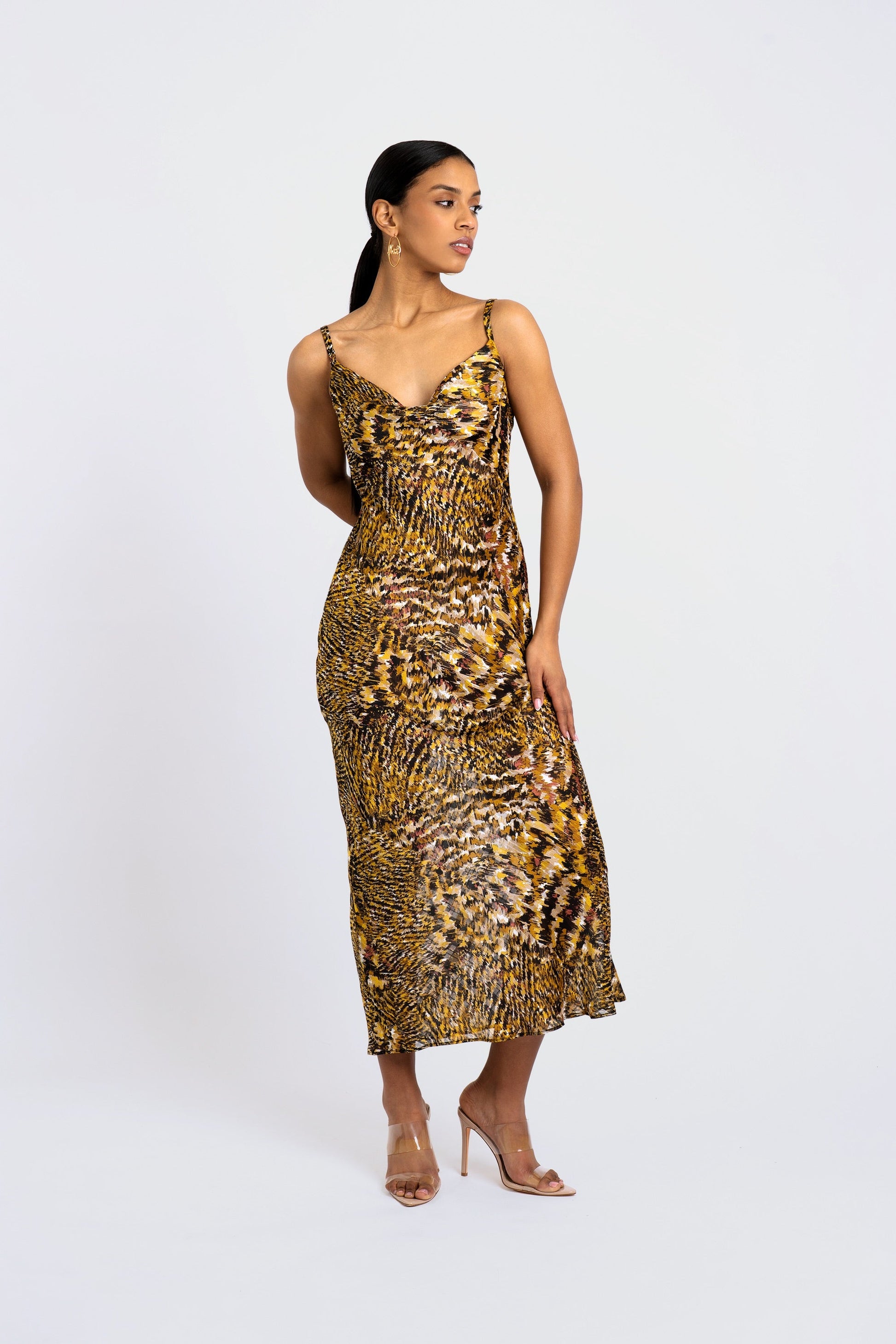 Designed with a bias-cut silhouette that skims the body, this luxurious fabric drapes naturally, enhancing movement with every step. A soft cowl neckline adds a touch of refinement, while delicate spaghetti straps frame the shoulders for a barely-there allure. The print is an electrifying fusion of gold, black, and earthy tones, evoking the raw beauty of the wilderness, transforming classic slip dress minimalism into a bold statement.