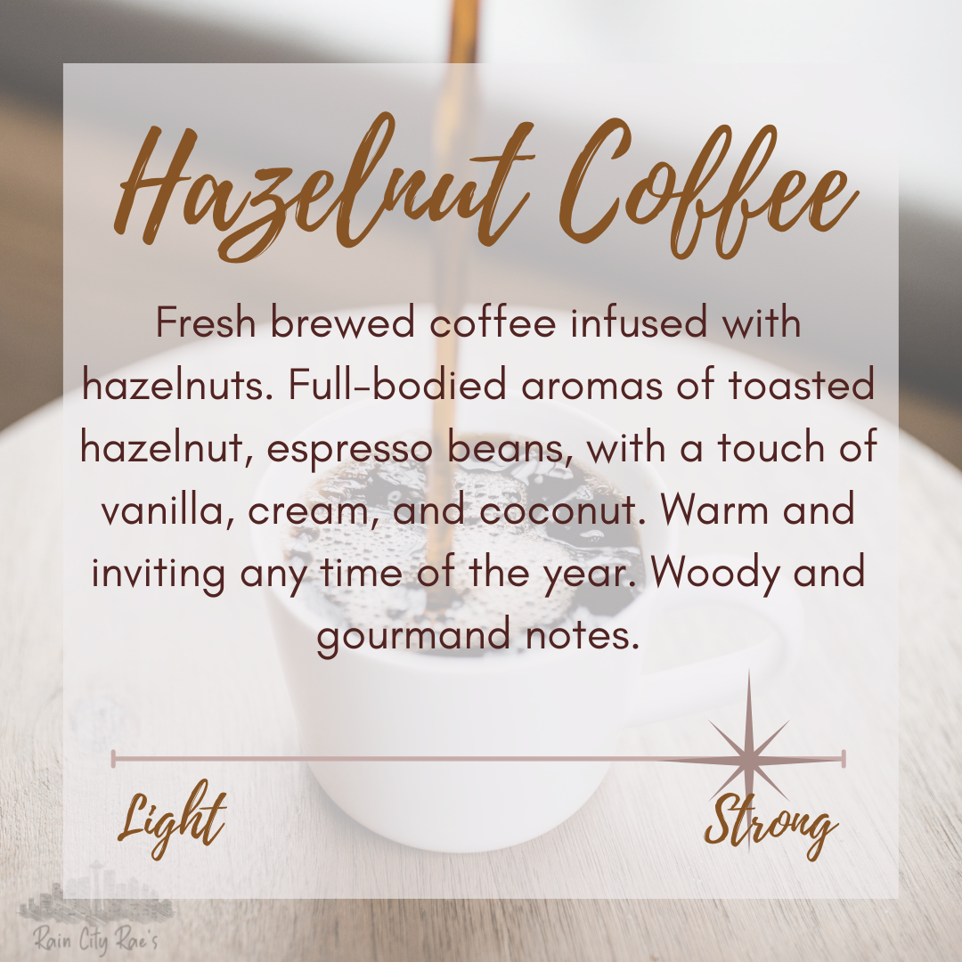 Fresh brewed coffee infused with hazelnuts. Full-bodied aromas of toasted hazelnut, espresso beans, with a touch of vanilla, cream, and coconut. Warm and inviting any time of the year. Woody and gourmand notes.