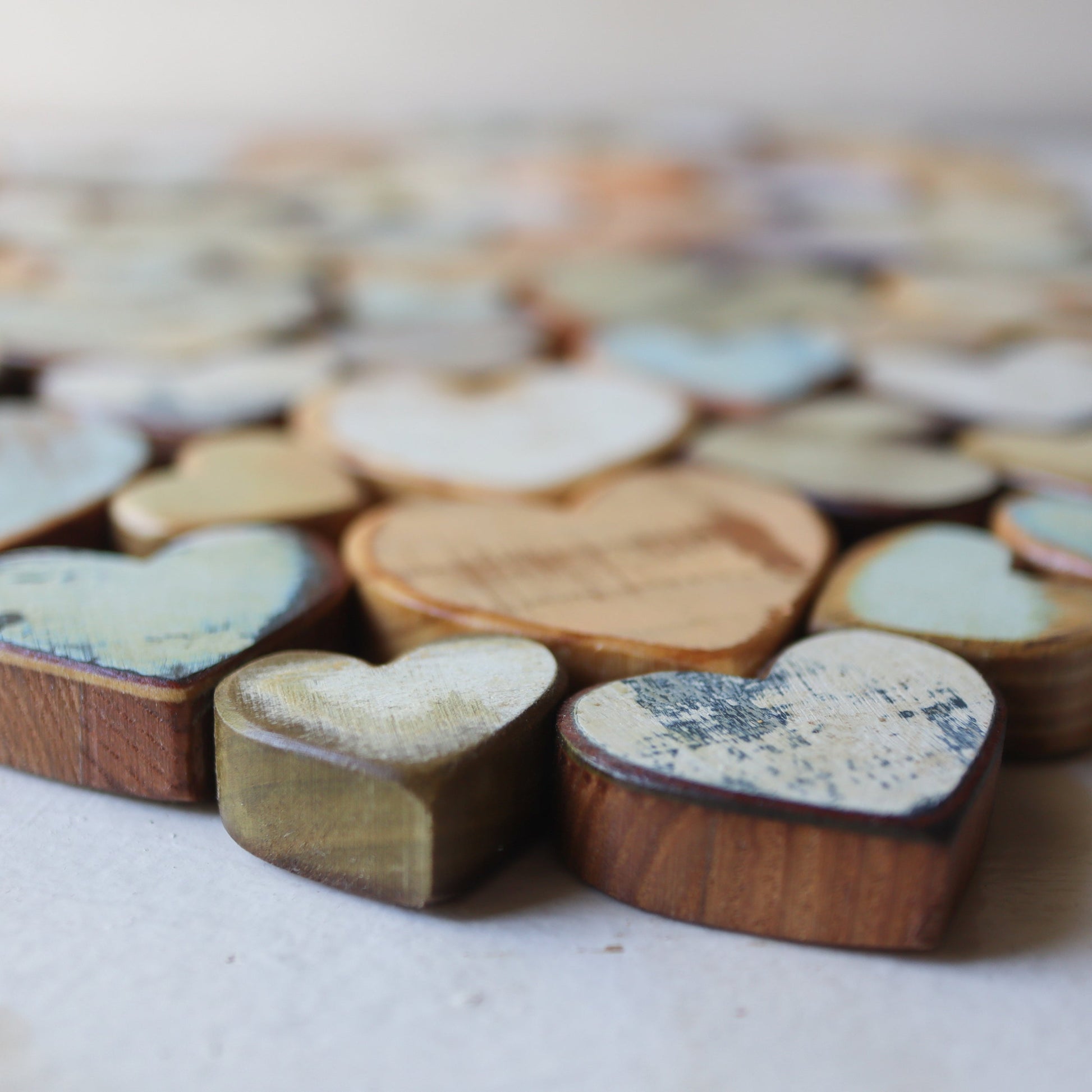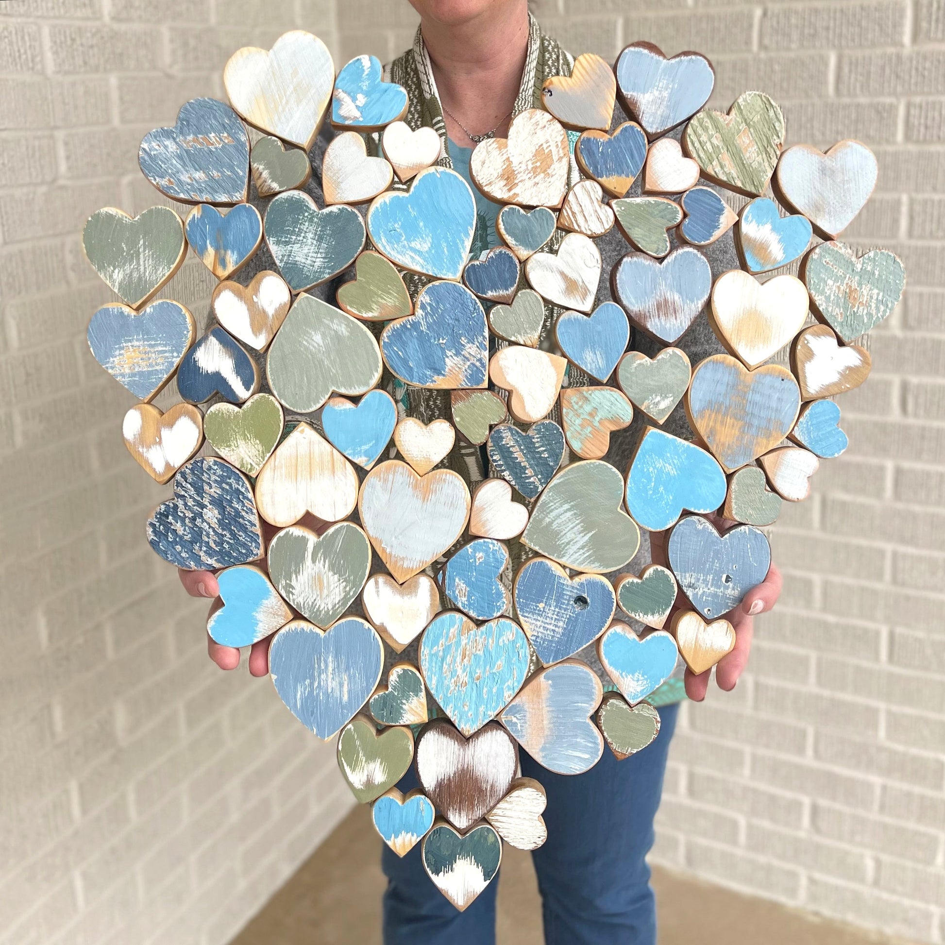 This artwork is handcrafted by assembling reclaimed wooden hearts of various sizes into one large heart—a meaningful one-of-a-kind find! The hearts range from 1 ½ to 3 inches wide, and the final Heart of Hearts Artwork is available in 20 x 20 or 30 x 30 inches.