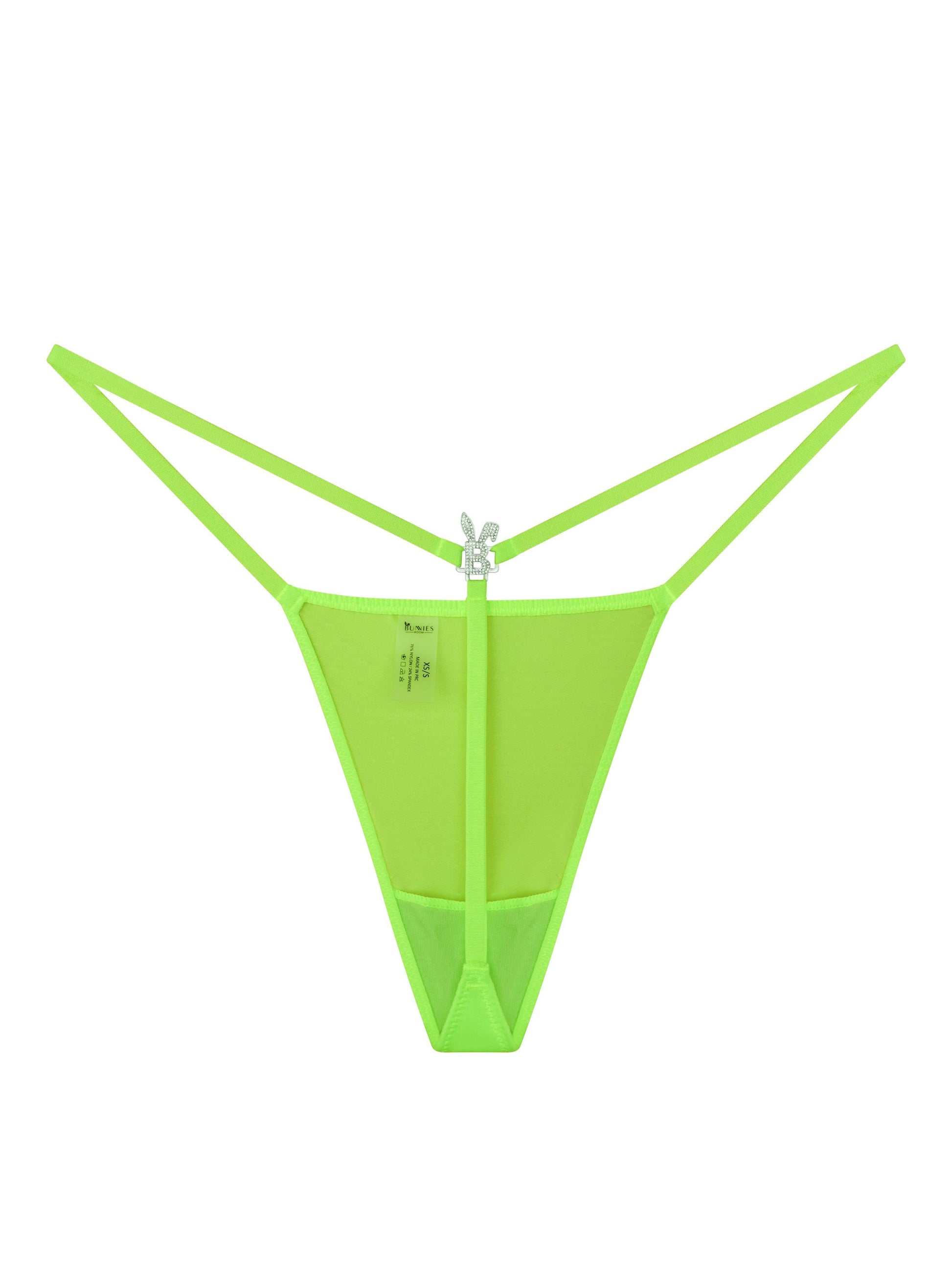 G-string Thong in Neon Green featuring a silver charm with crystals.