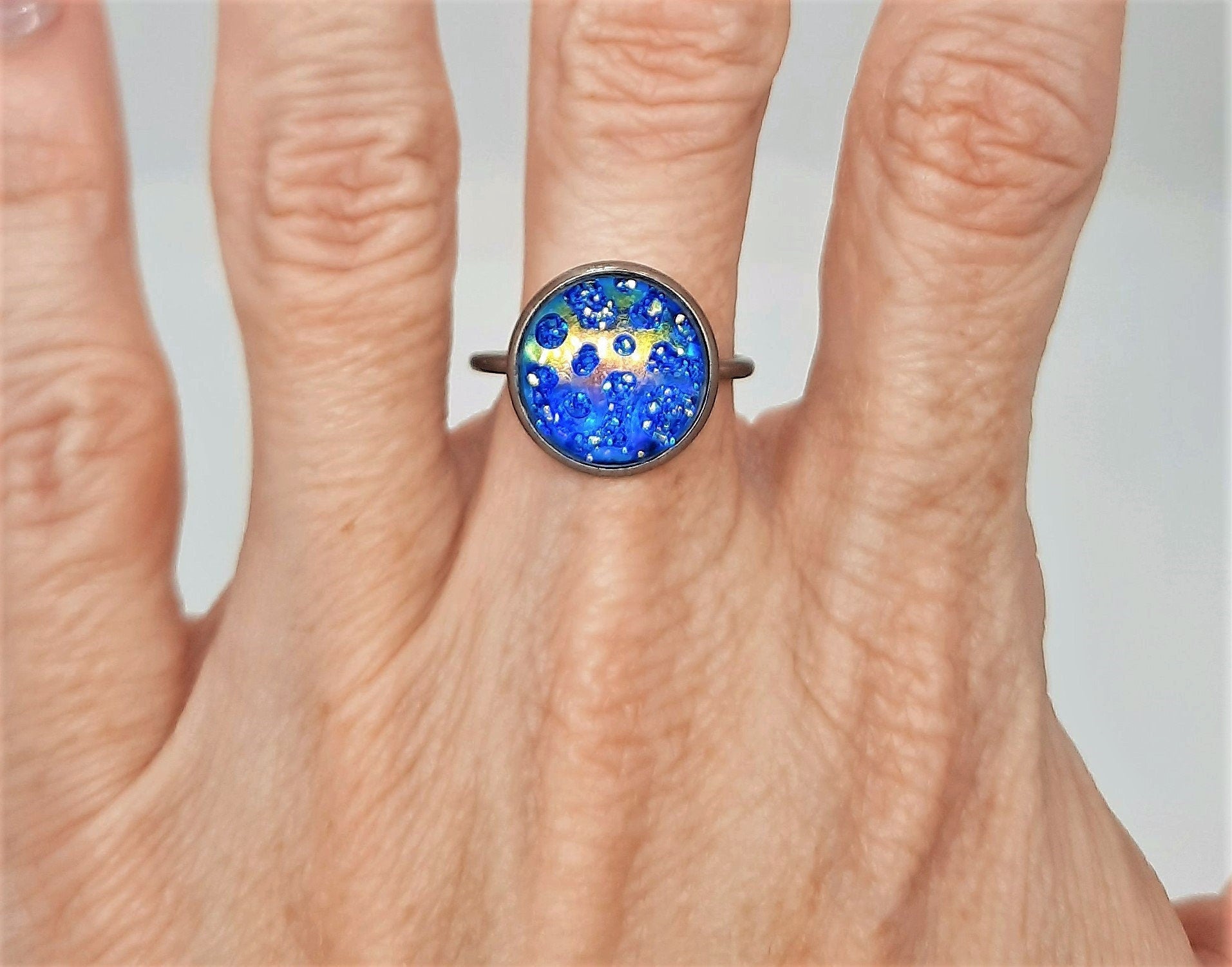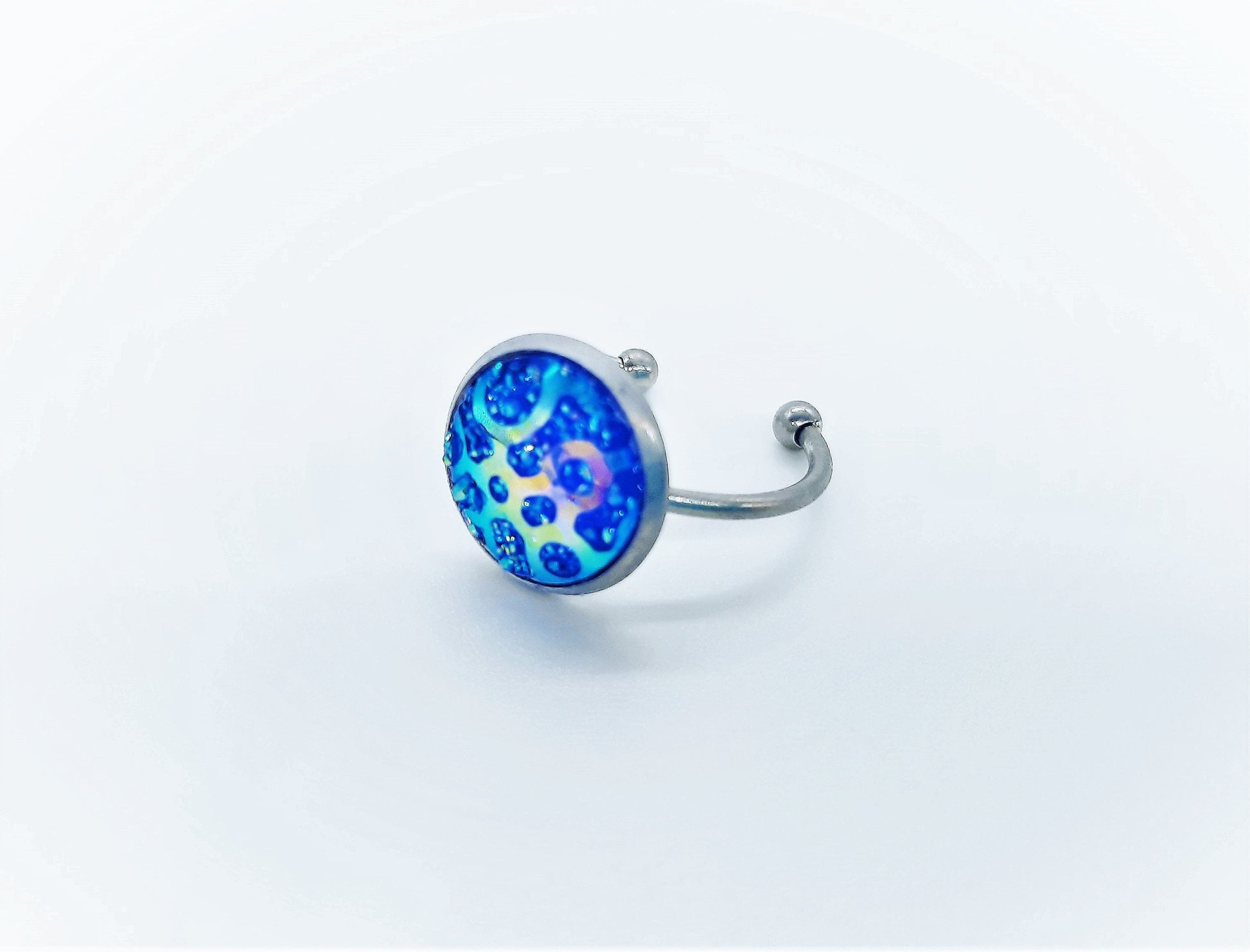Handcrafted / Handmade Iridescent Blue Resin Hypoallergenic Silver Stainless Steel Cuff Finger Ring, Size 7.