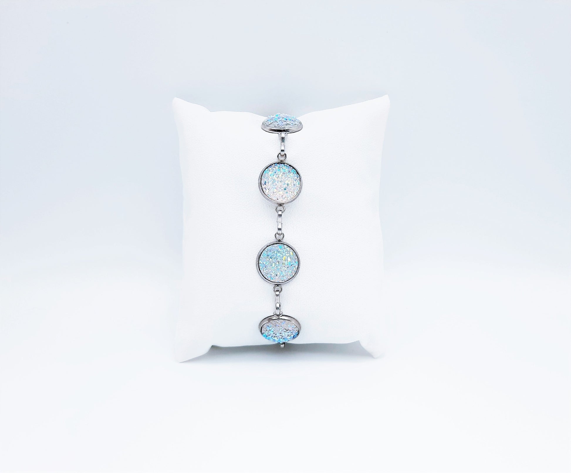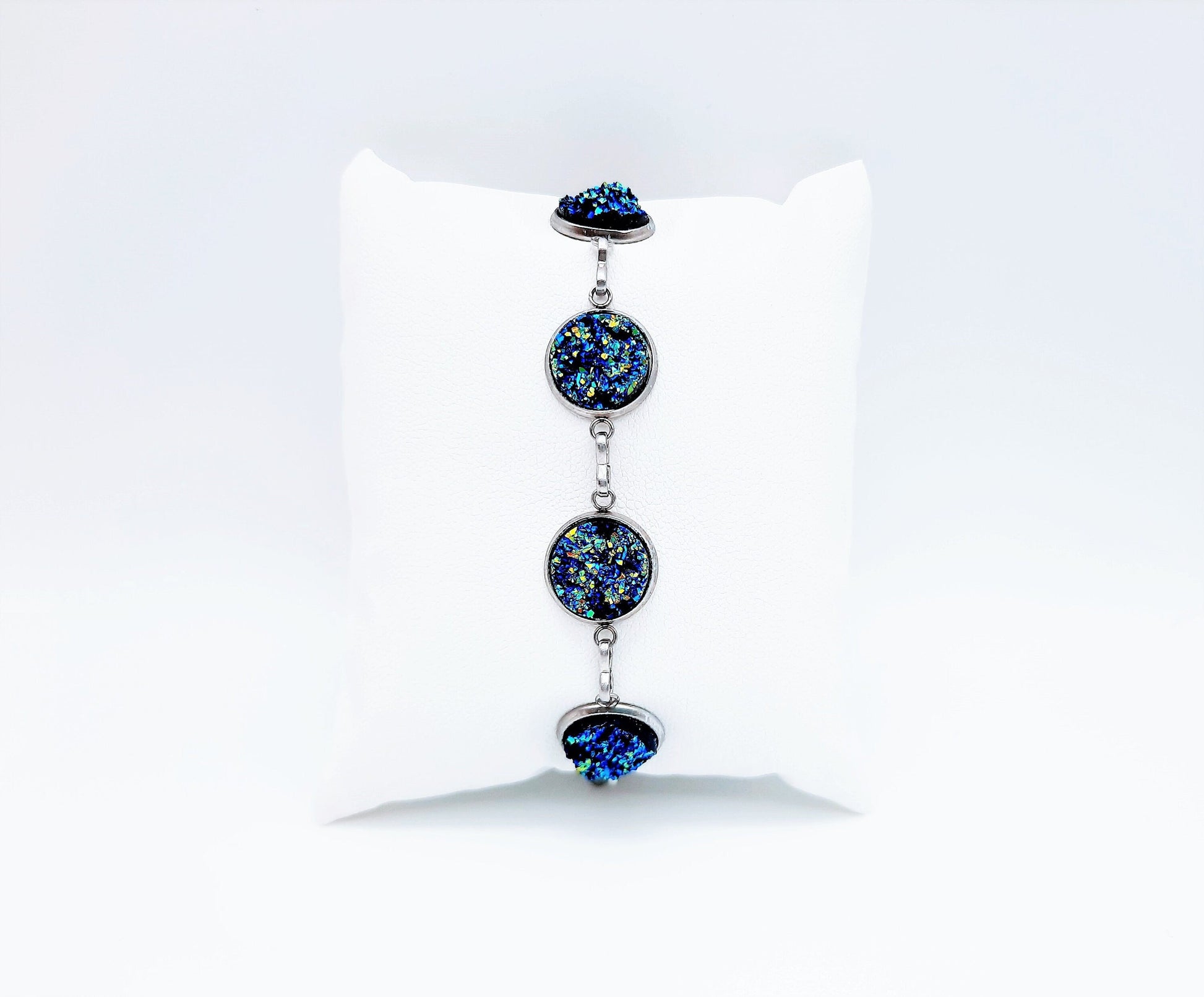 Handcrafted Iridescent Druzy Stone Link Bracelet. The bracelet size is adjustable. Six (6) 12mm round cabochon resin settings, 7 inches long with 1.5 inch extender chain and lobster claw clasp.