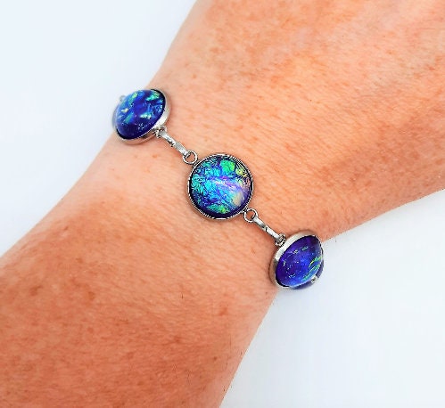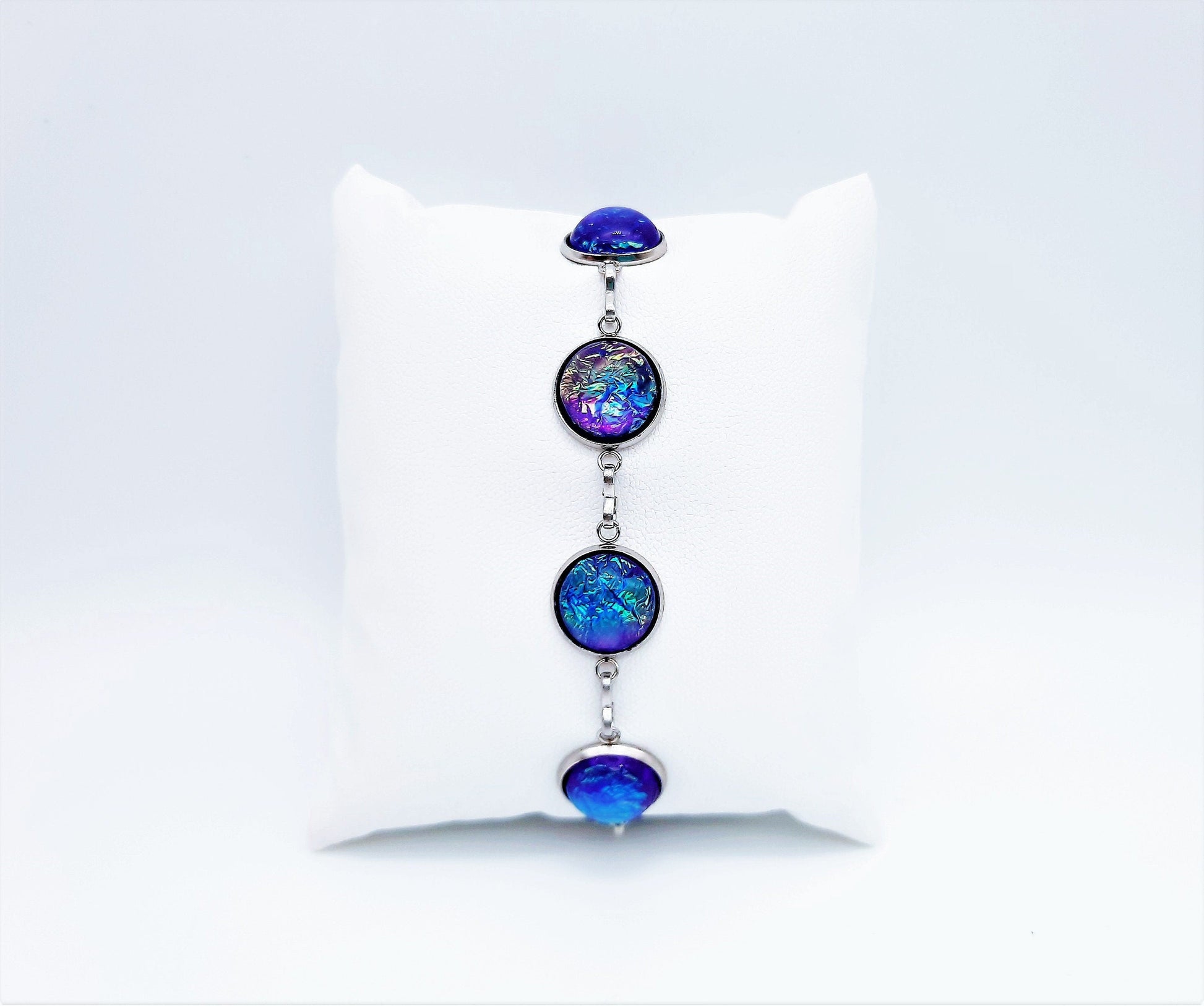 Handcrafted Iridescent Purple Glass Cabochon Link Bracelet. The bracelet size is adjustable. Six (6) 12mm round cabochon resin settings, 7 inches long with 1.5 inch extender chain and lobster claw clasp.