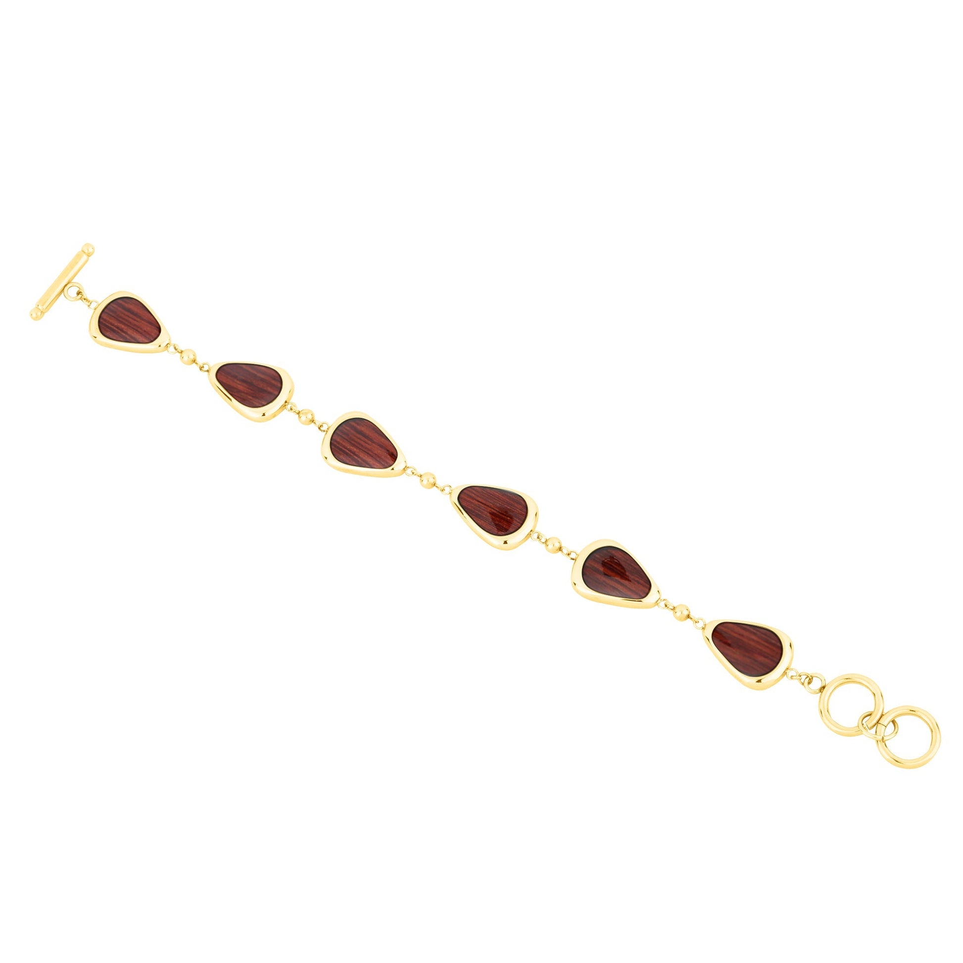 Yellow Gold plated stainless steel water drop link bracelet with Jarrah wood inlays. Adjustable toggle and loop closure.
