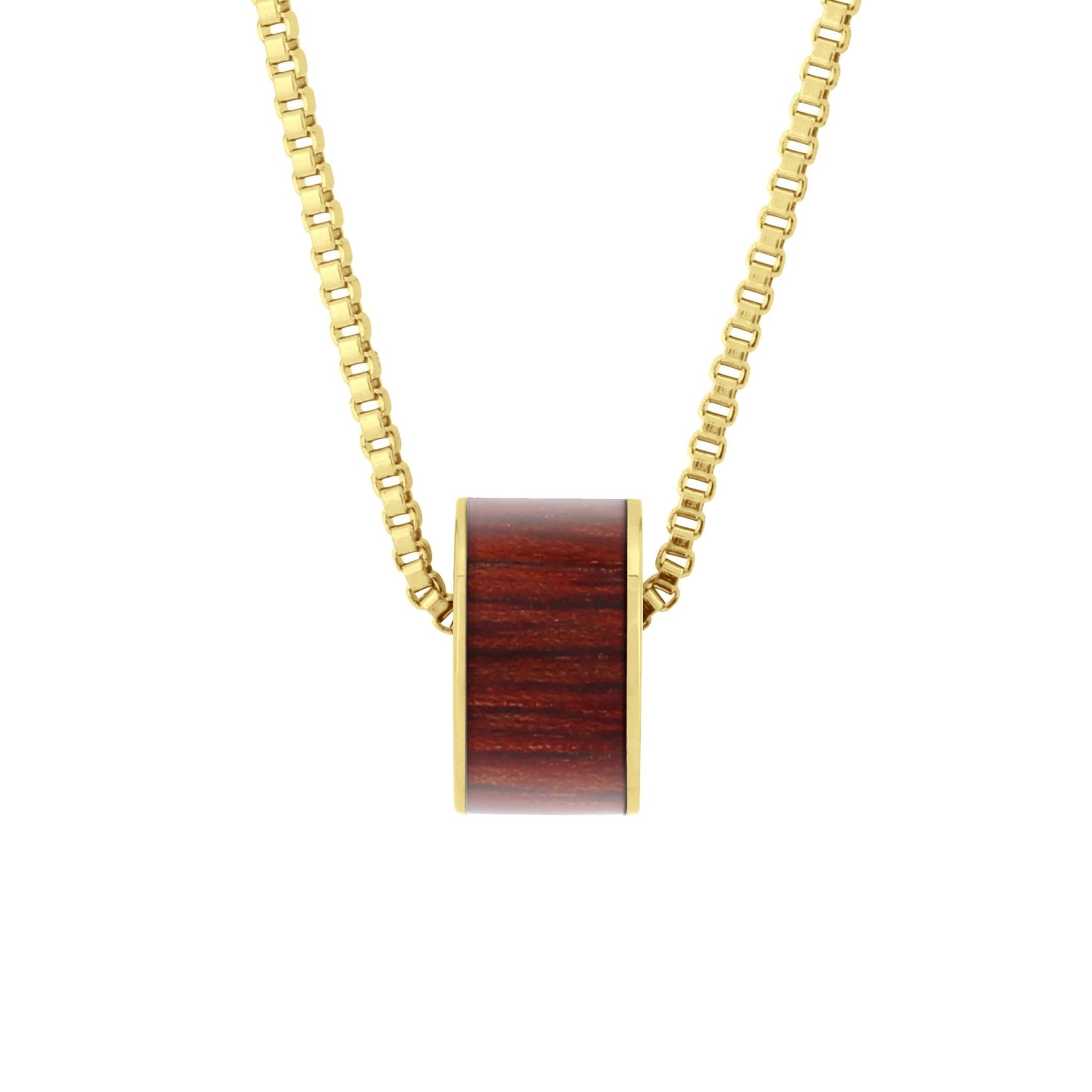 Yellow Gold plated stainless steel barrel bead pendant inlaid with responsibly sourced Jarrah timber from southwest Australia.