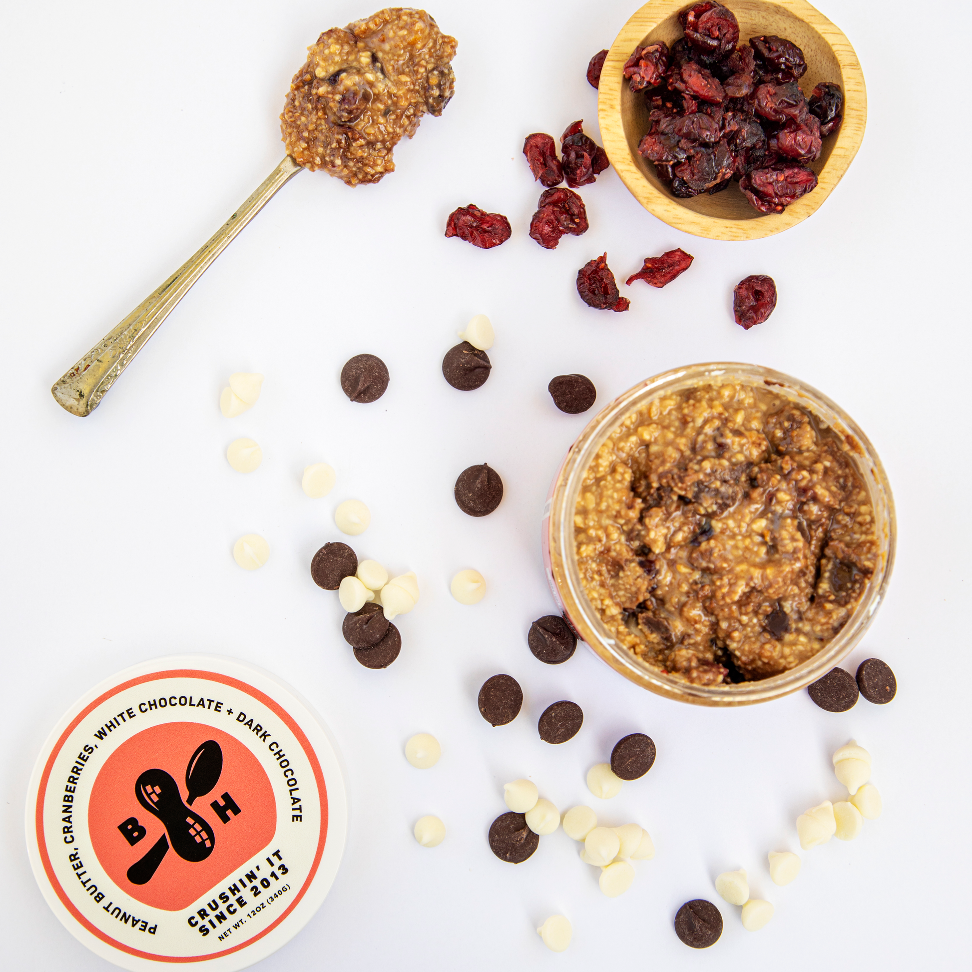 Bringing peace and harmony with dark chocolate, white chocolate and dried cranberries in honey roasted peanut butter.