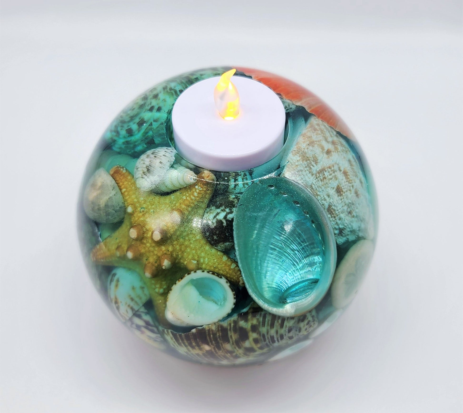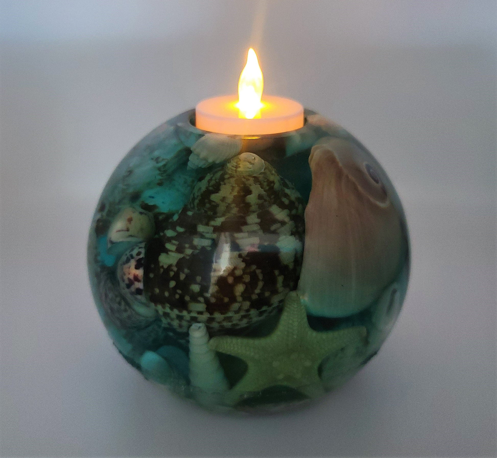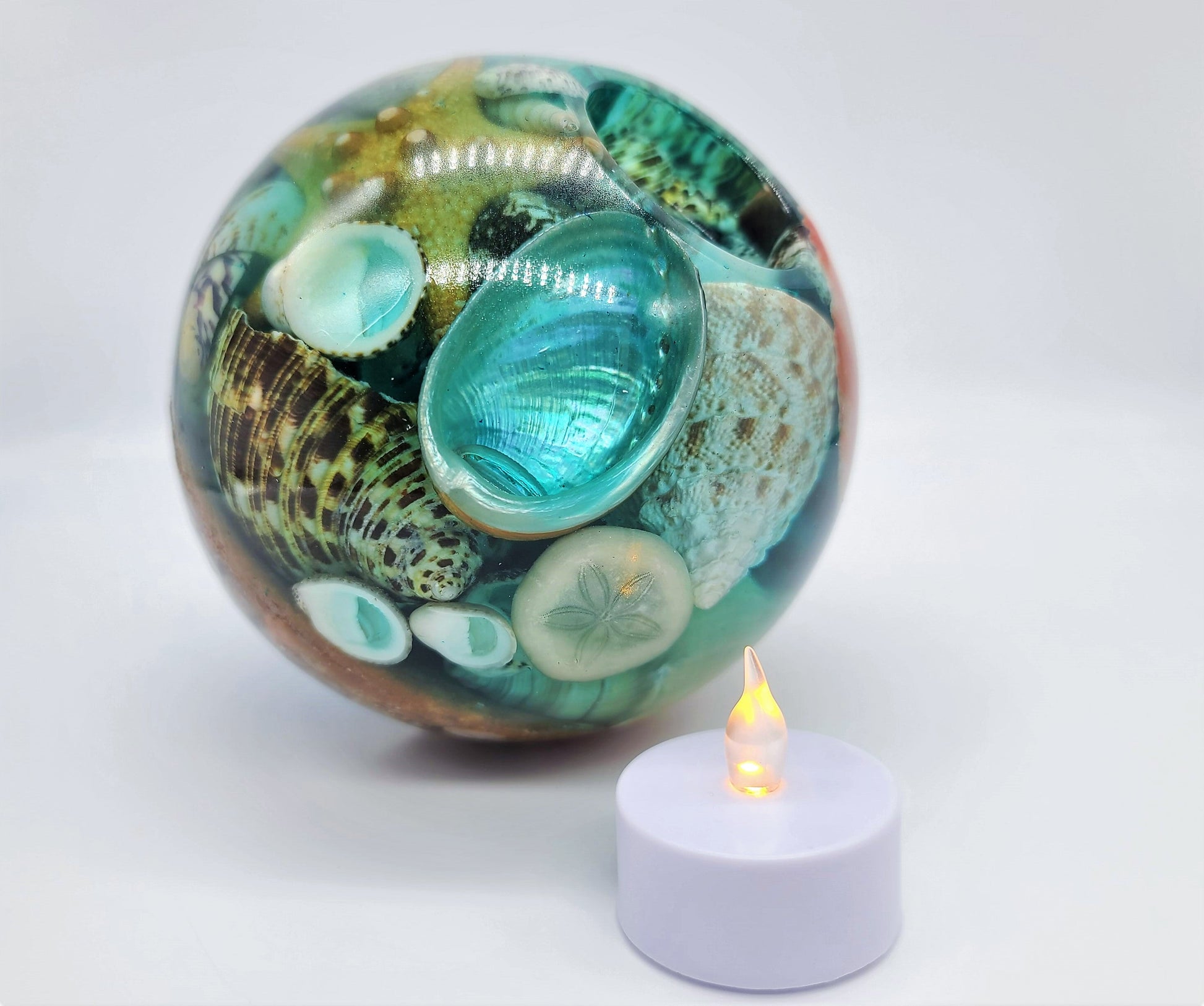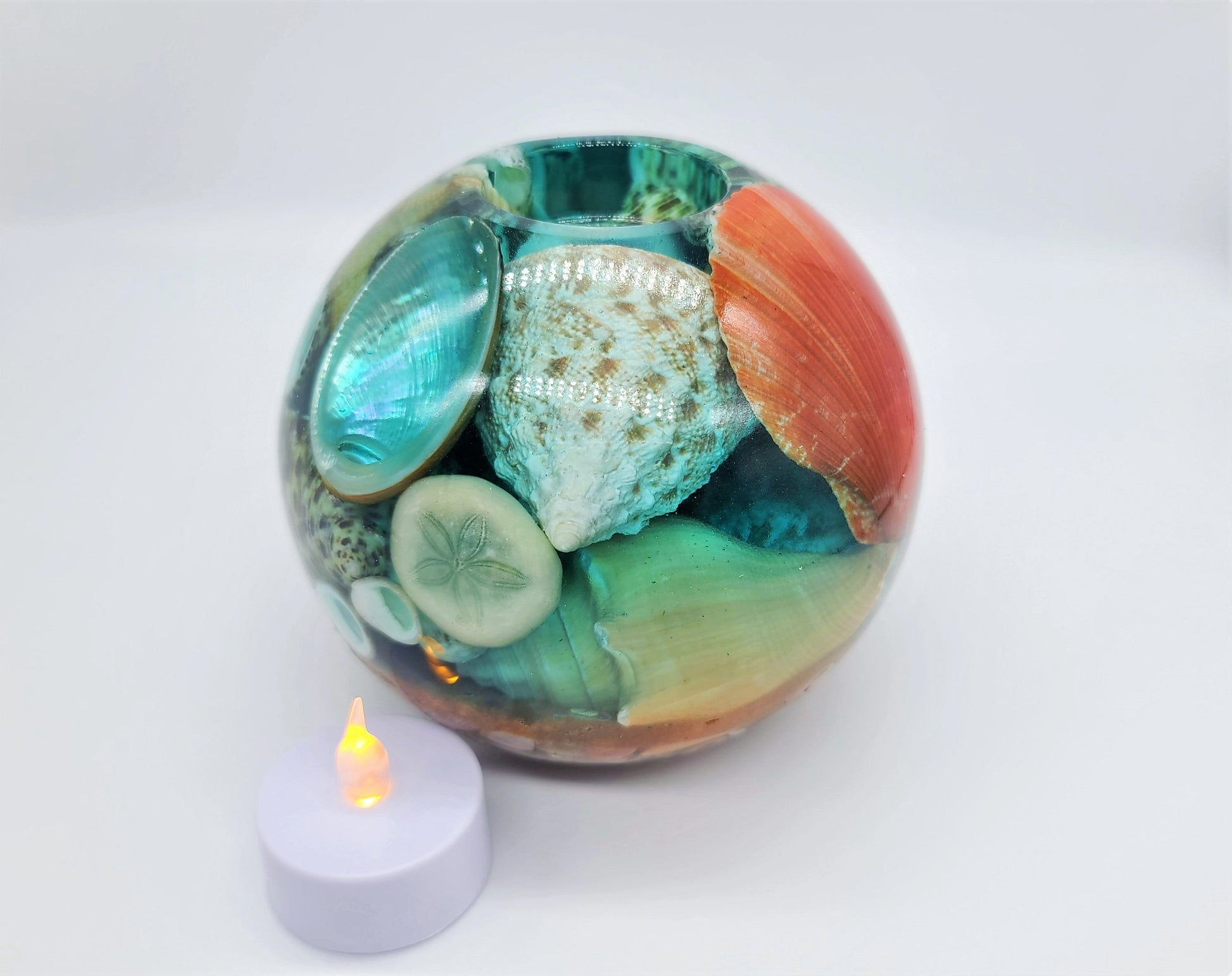 Large Spherical / Round Seascape Candle Holder Made with Eco-Friendly Epoxy Resin & Seashells - Includes Real Tealight or LED Tealight.