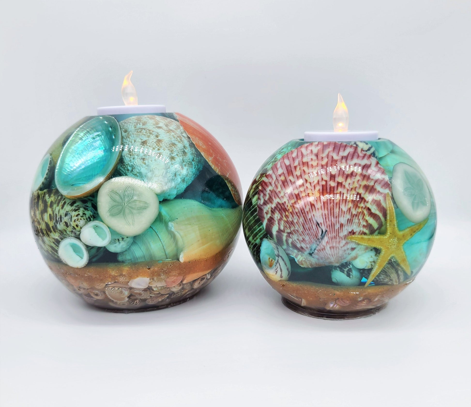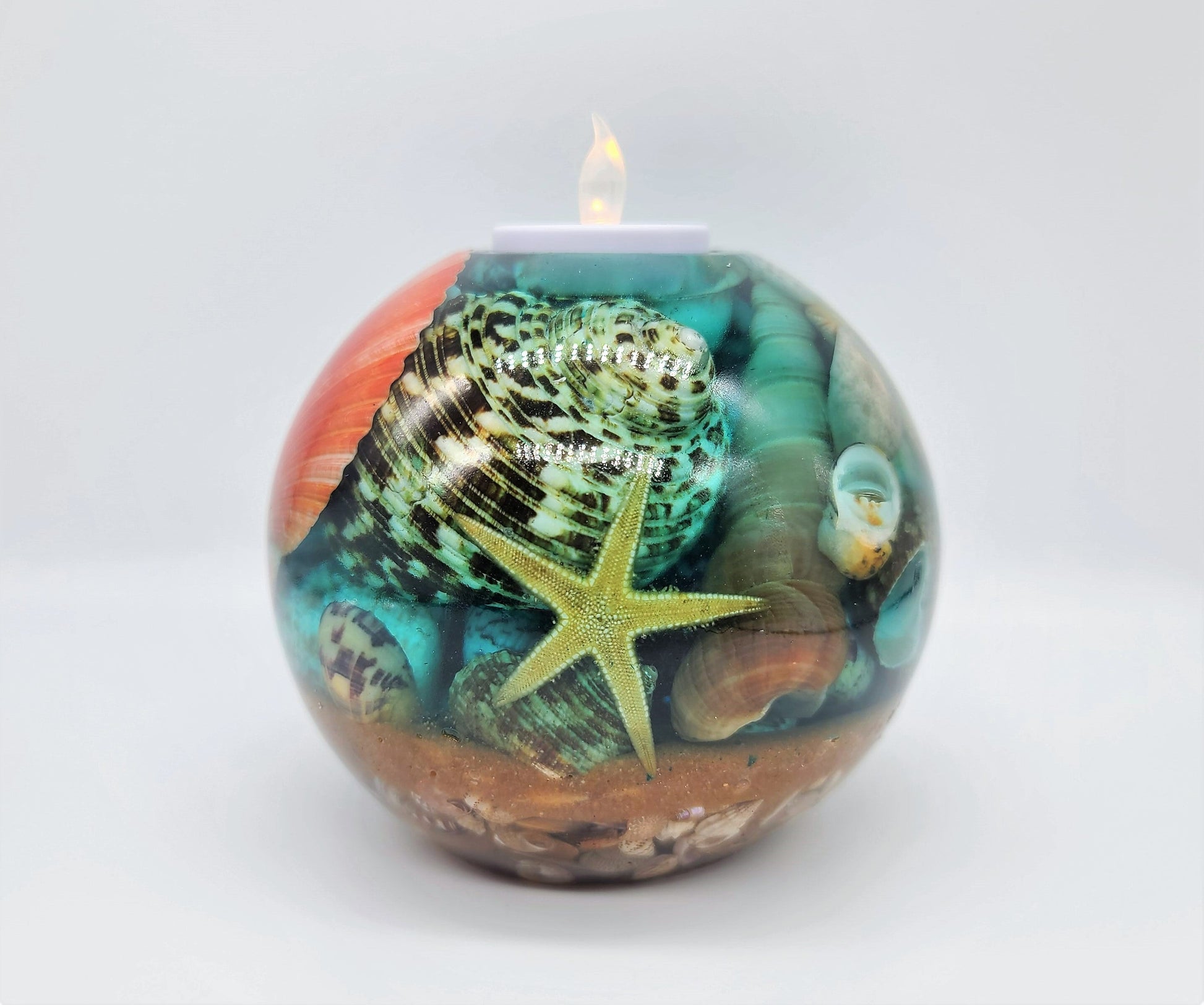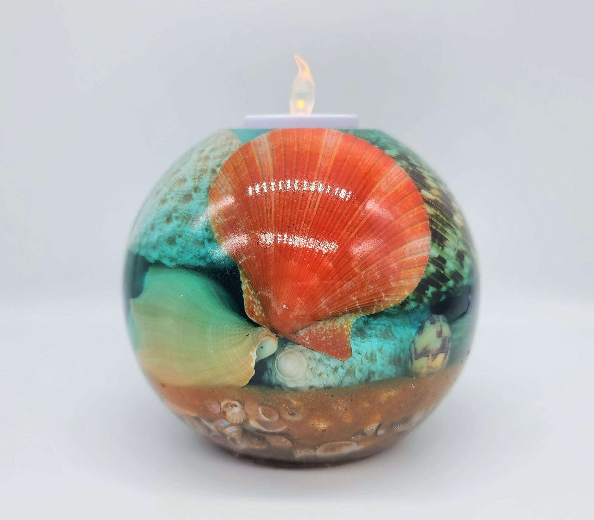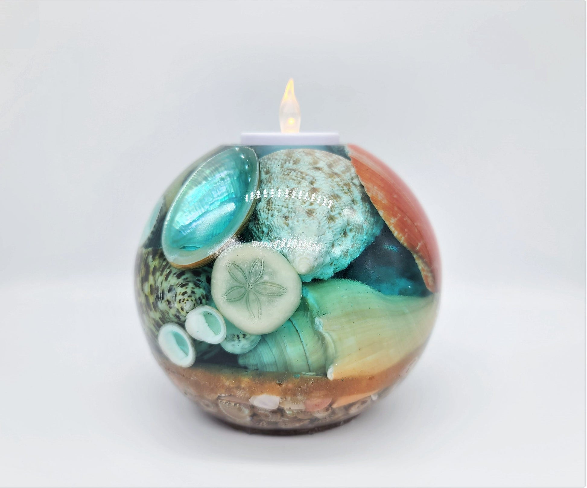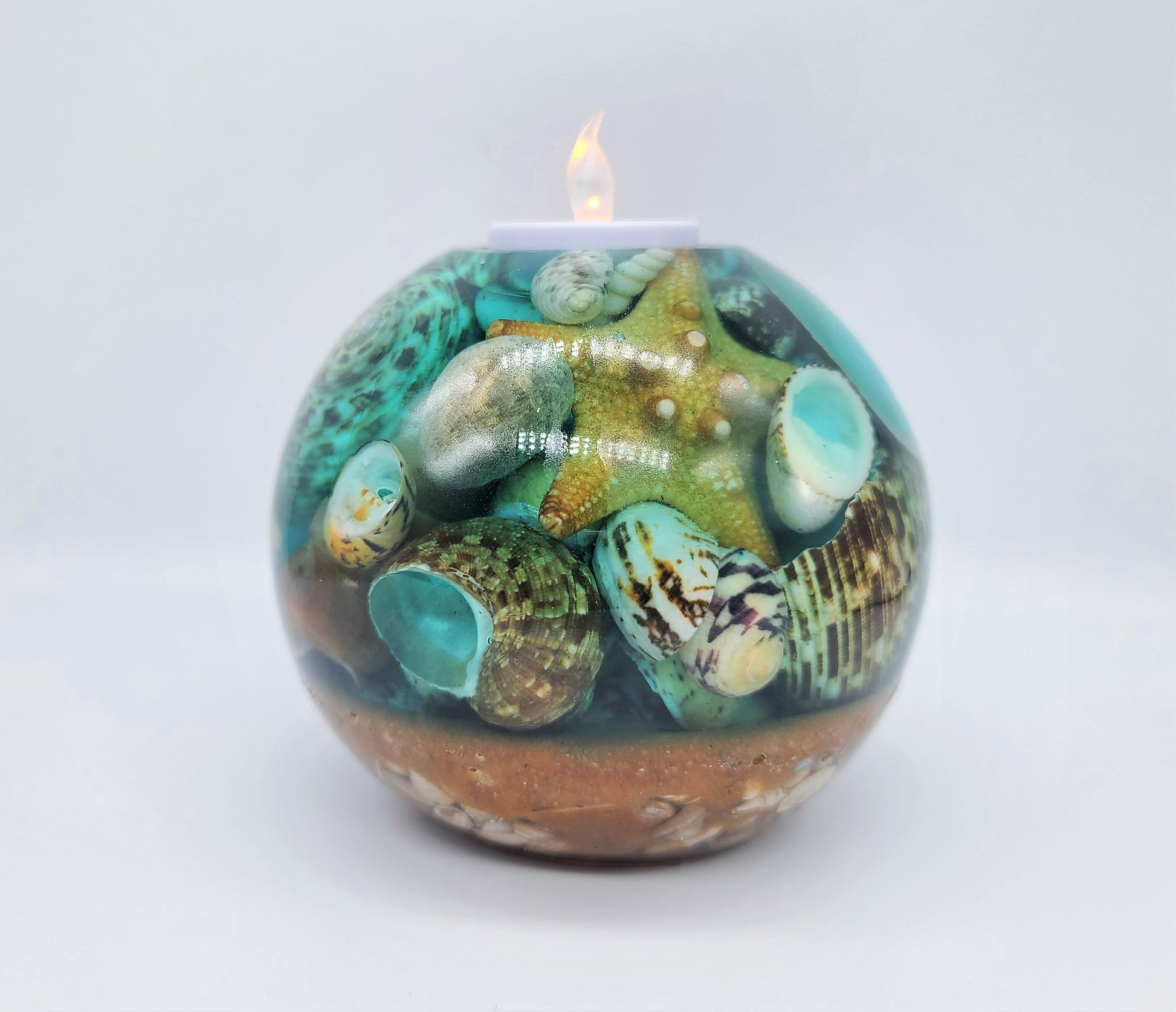 Large Spherical / Round Seascape Candle Holder Made with Eco-Friendly Epoxy Resin & Seashells - Includes Real Tealight or LED Tealight.