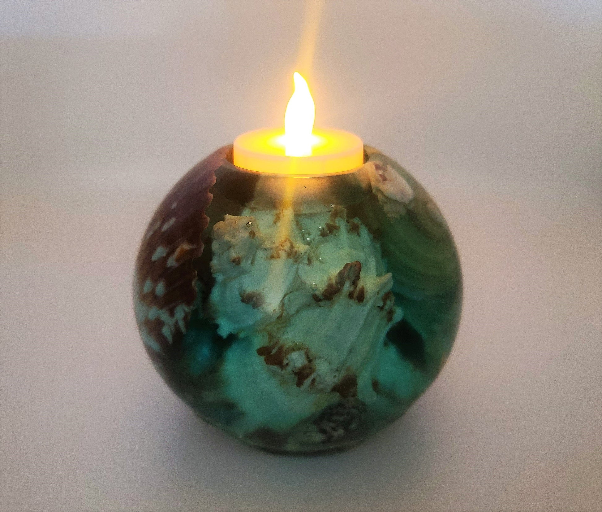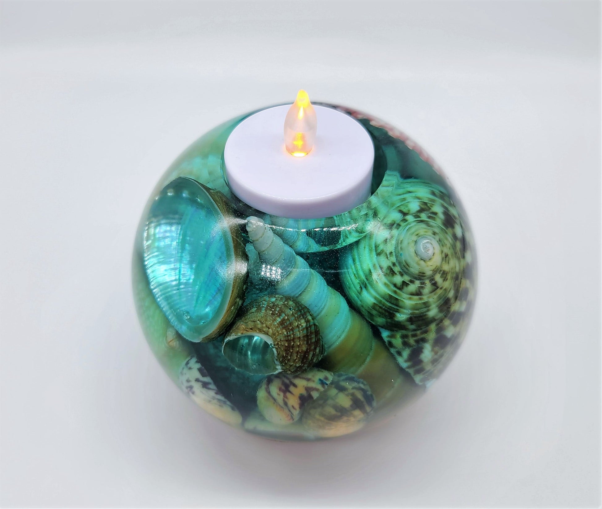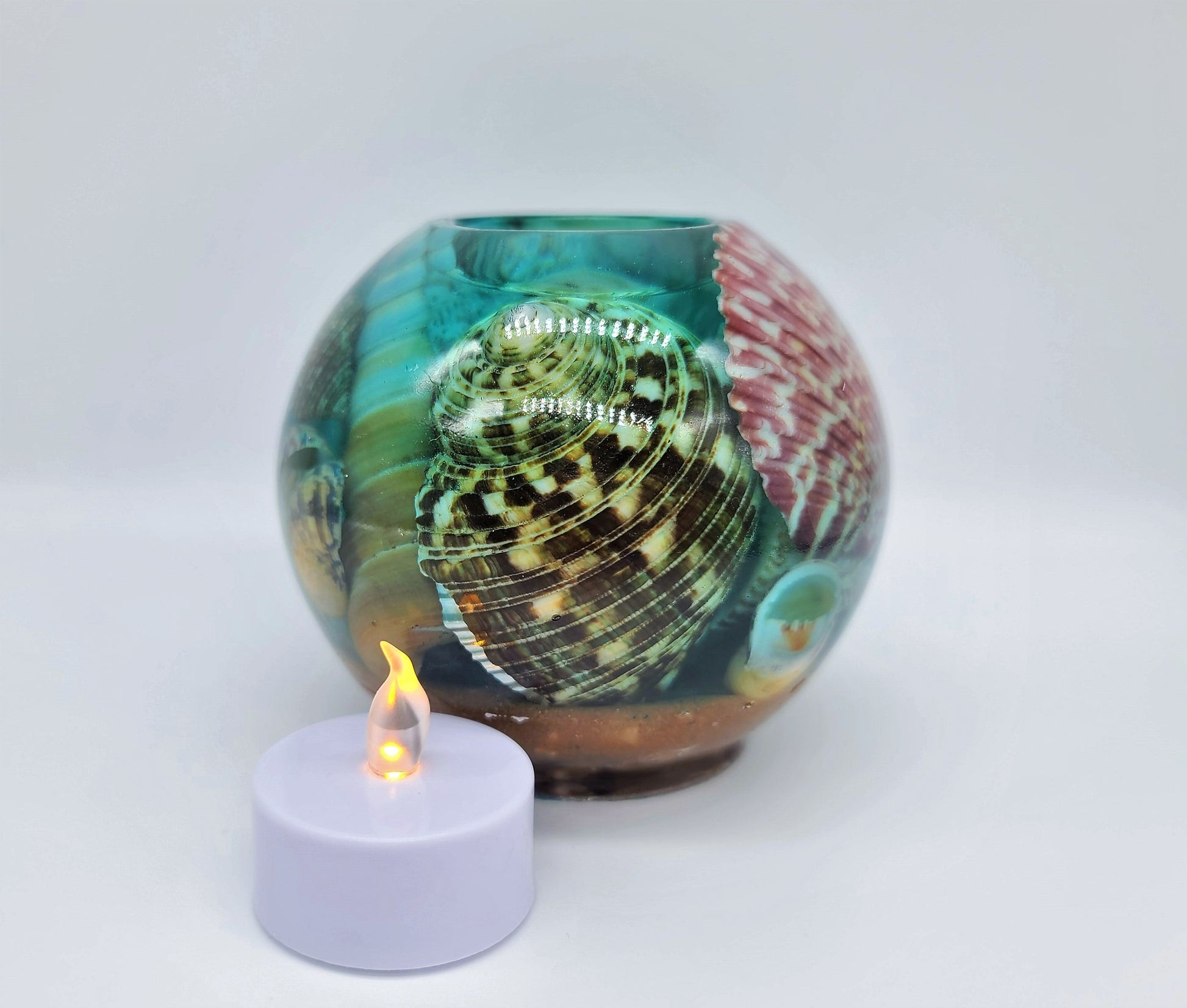 Medium Spherical / Round Seascape Candle Holder Made with Eco-Friendly Epoxy Resin & Seashells - Includes Real Tealight or LED Tealight.