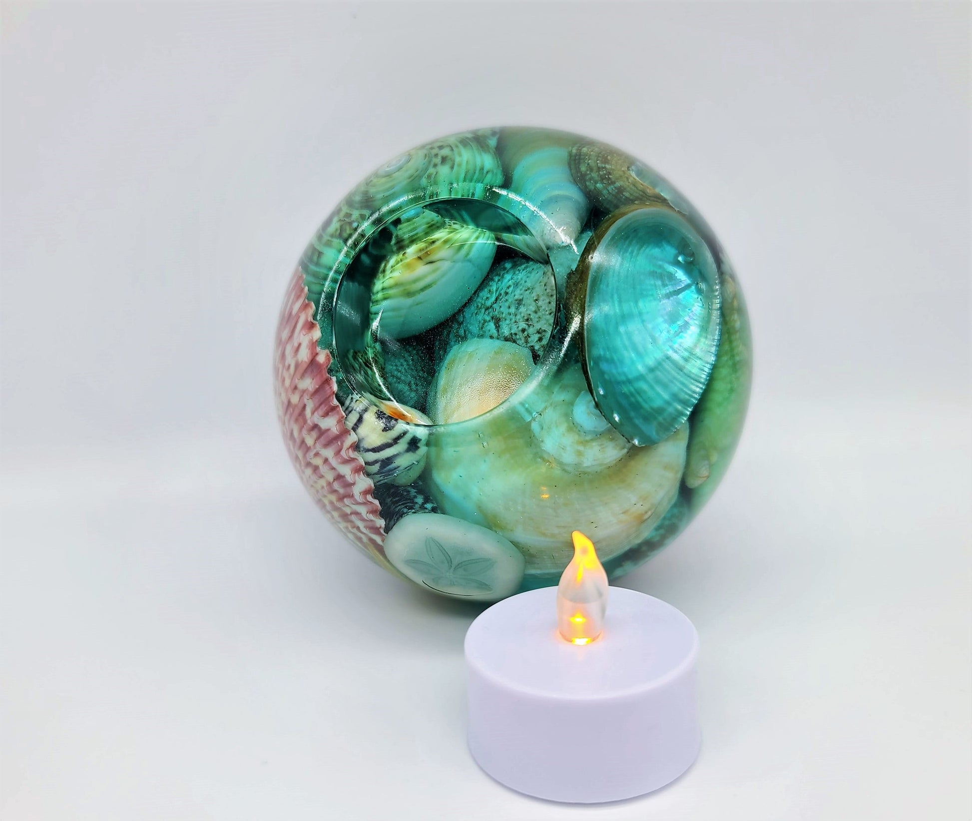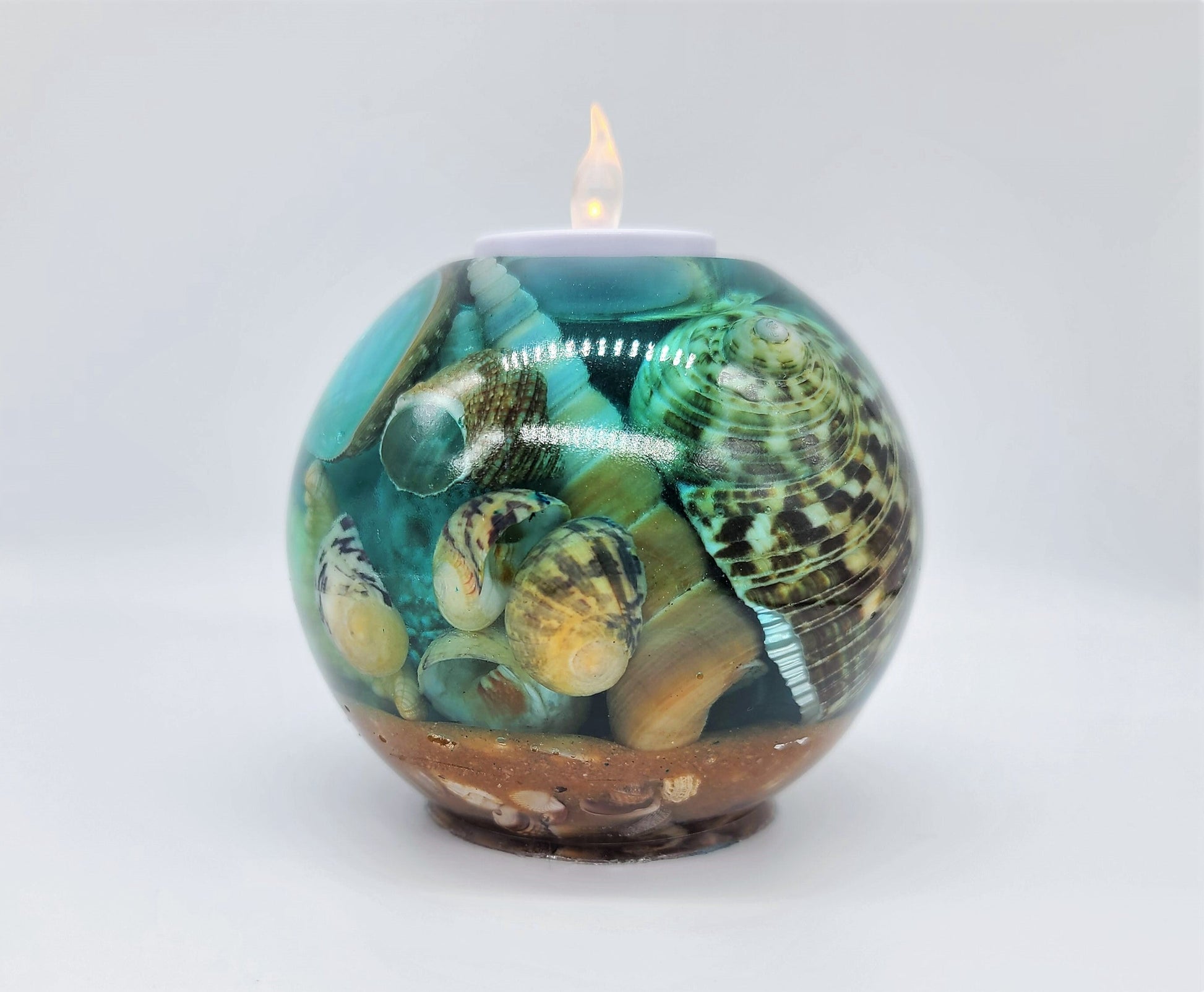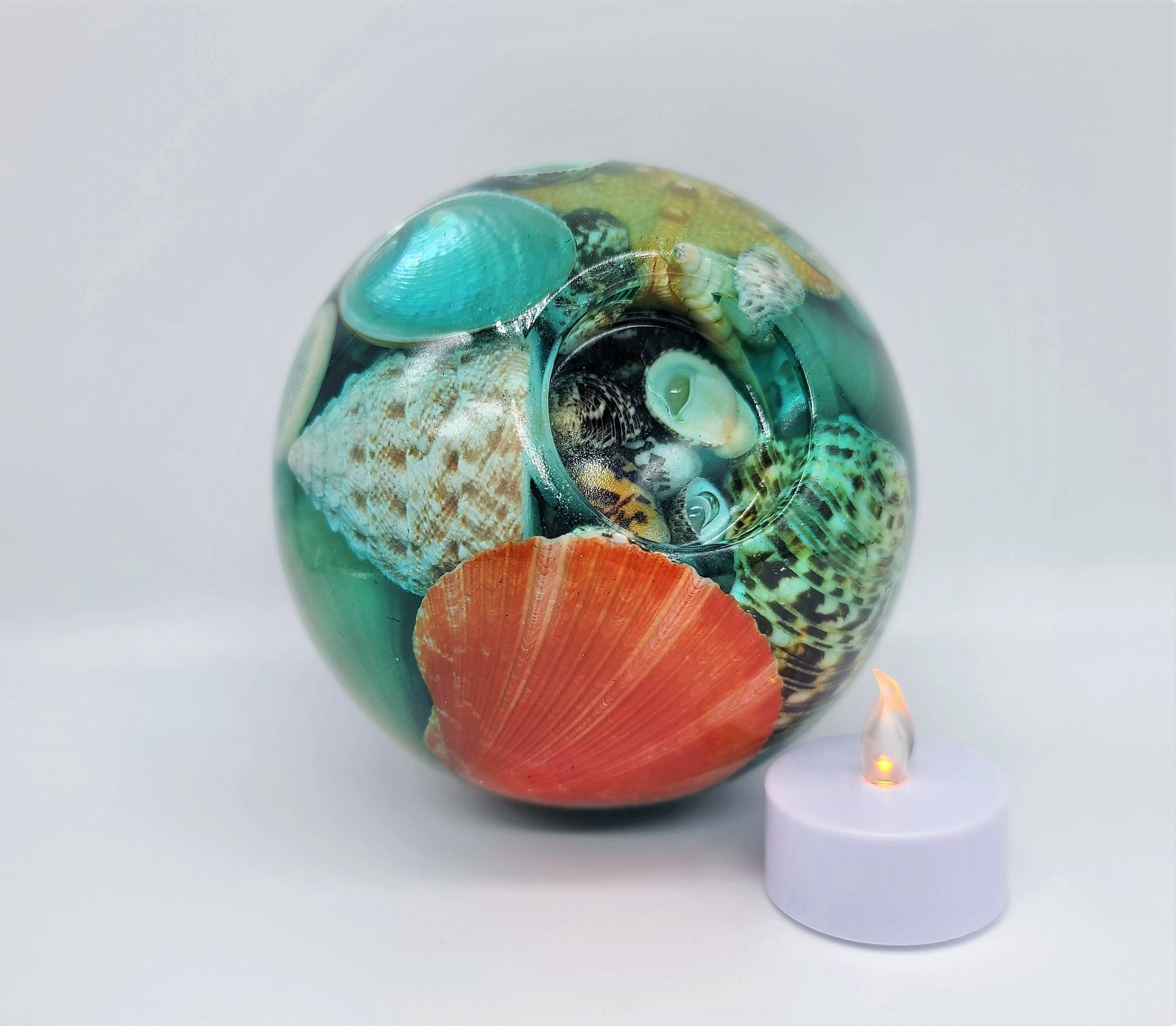 Medium Spherical / Round Seascape Candle Holder Made with Eco-Friendly Epoxy Resin & Seashells - Includes Real Tealight or LED Tealight.