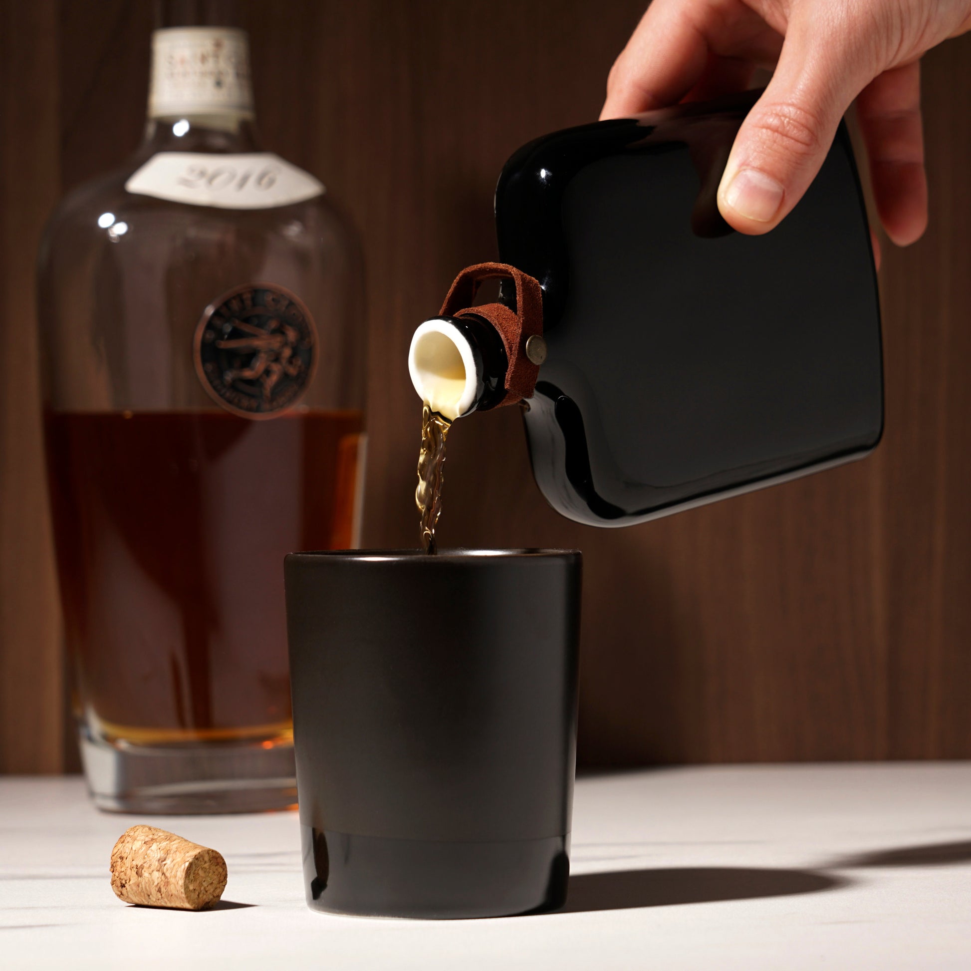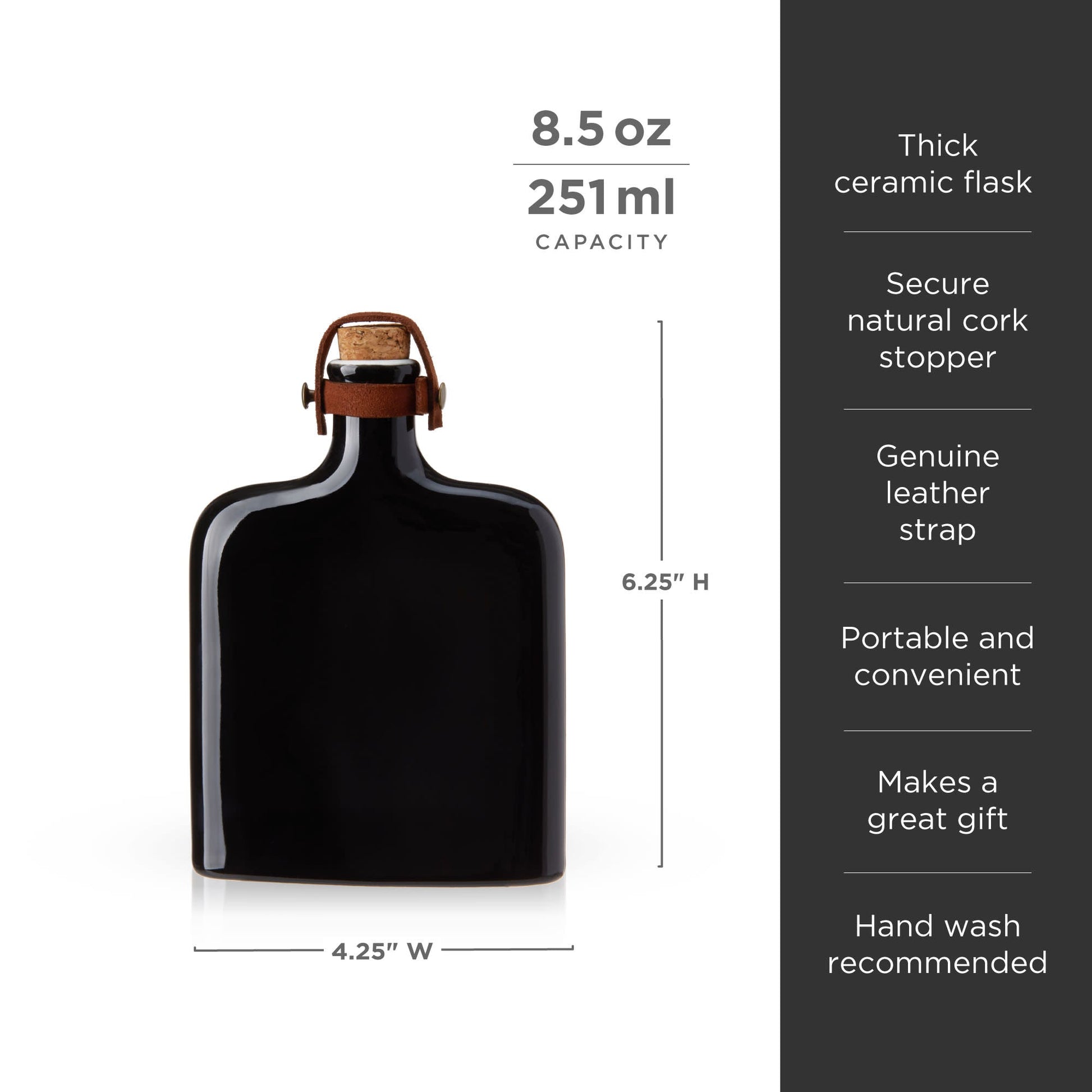 Crafted from ceramic with a striking black glaze, this flask is a unique display piece for your bar. It comes with a natural cork and genuine leather strap.