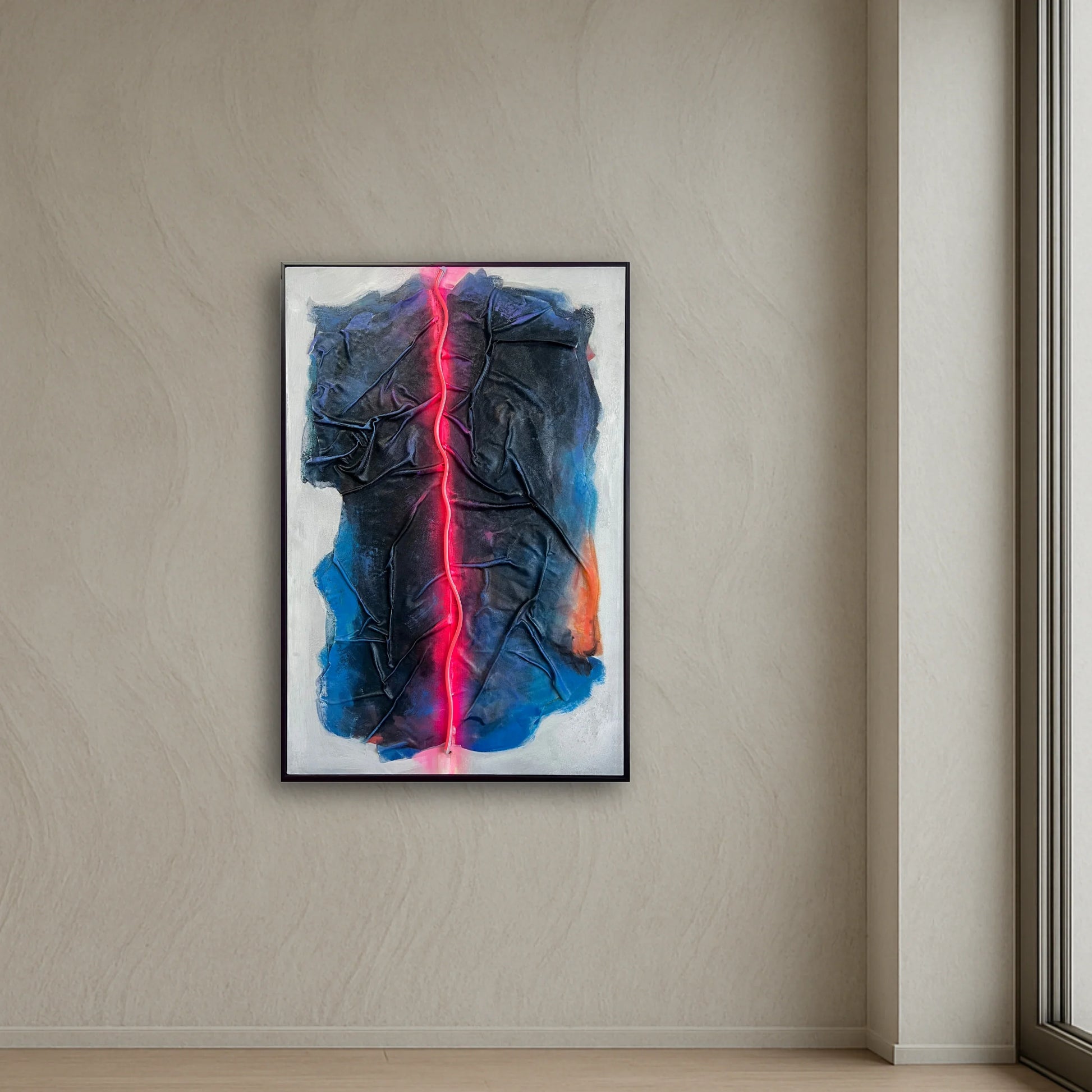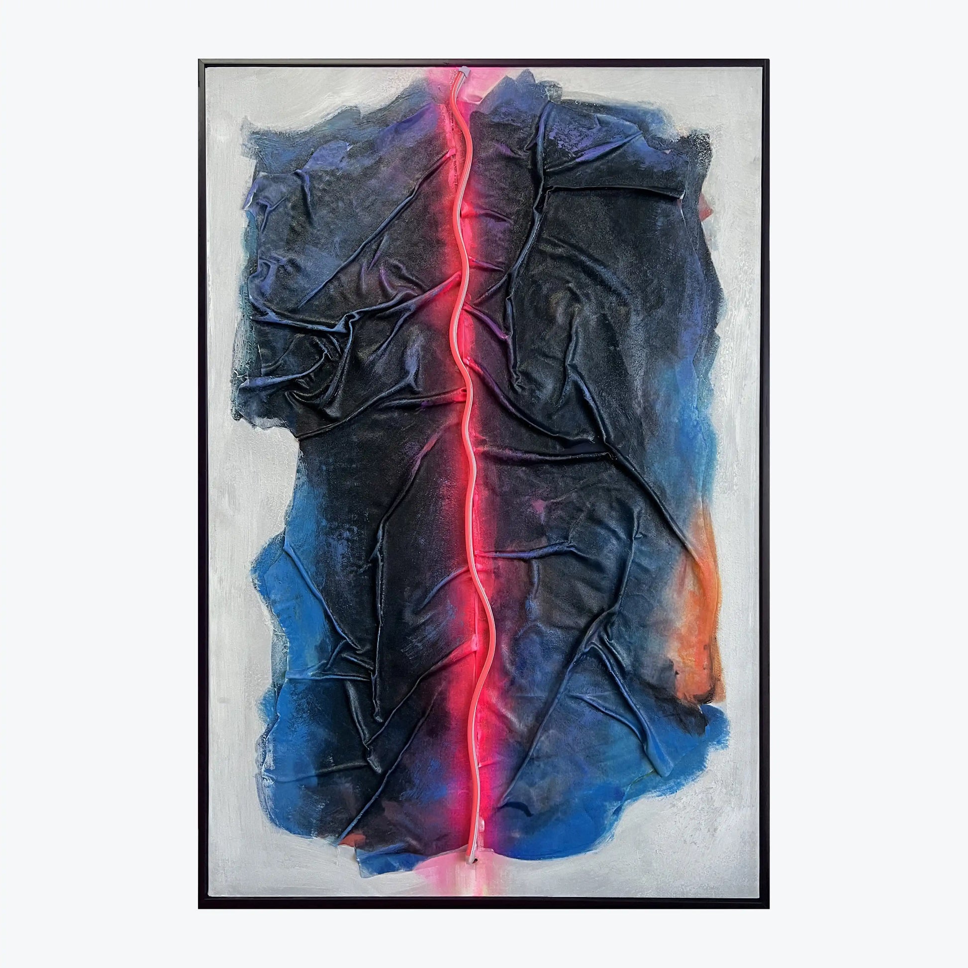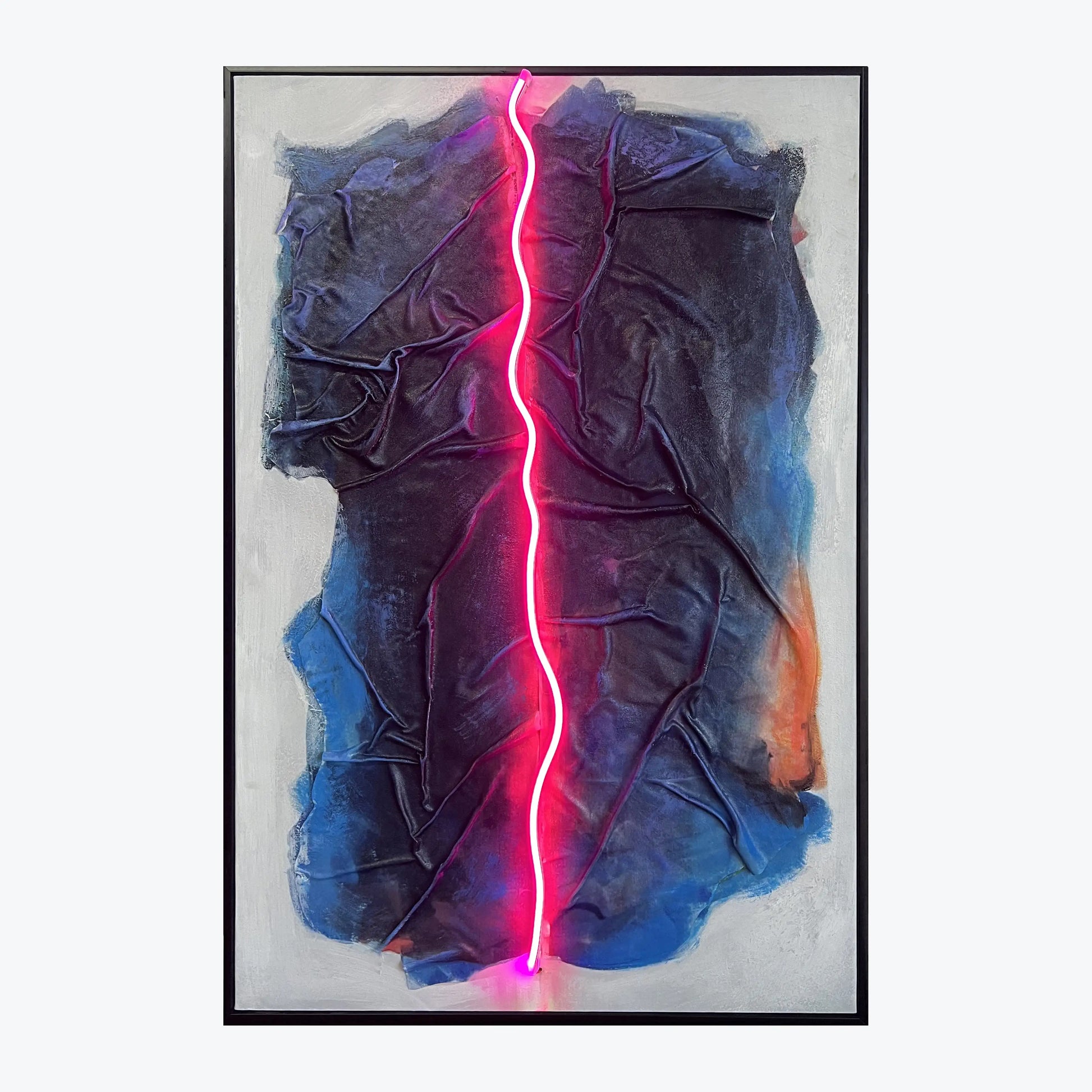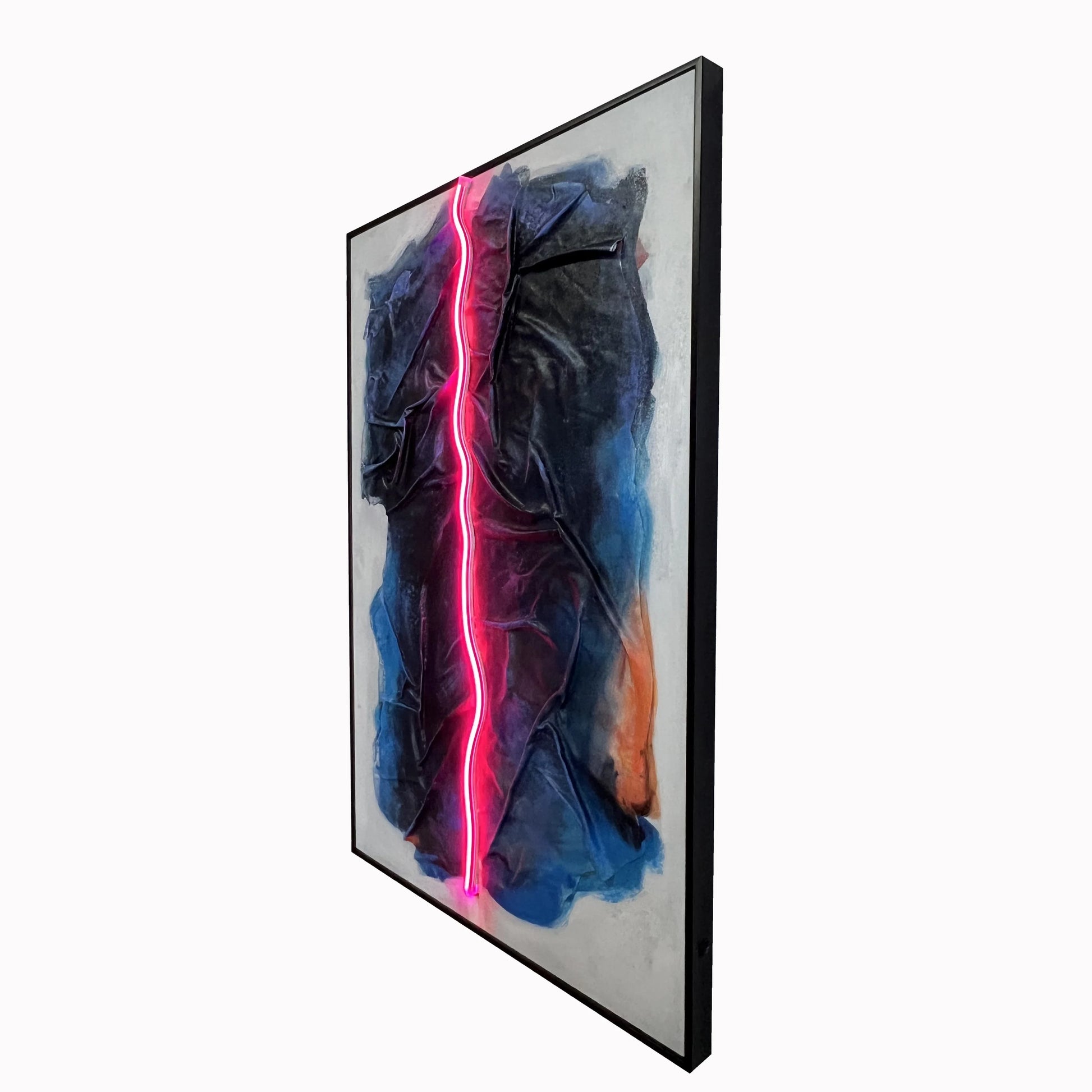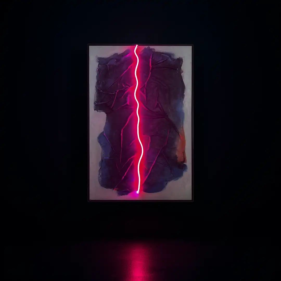 Neon Crease blends raw material texture with precise neon light to create a piece that feels both industrial and intimate. A hot pink LED line runs like a fault through dark, folded fabric and painted shadows, suggesting tension, pressure, and release. This work invites you to read between layers—where light cuts through surface and form.