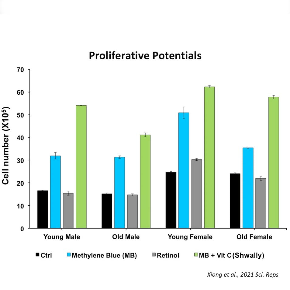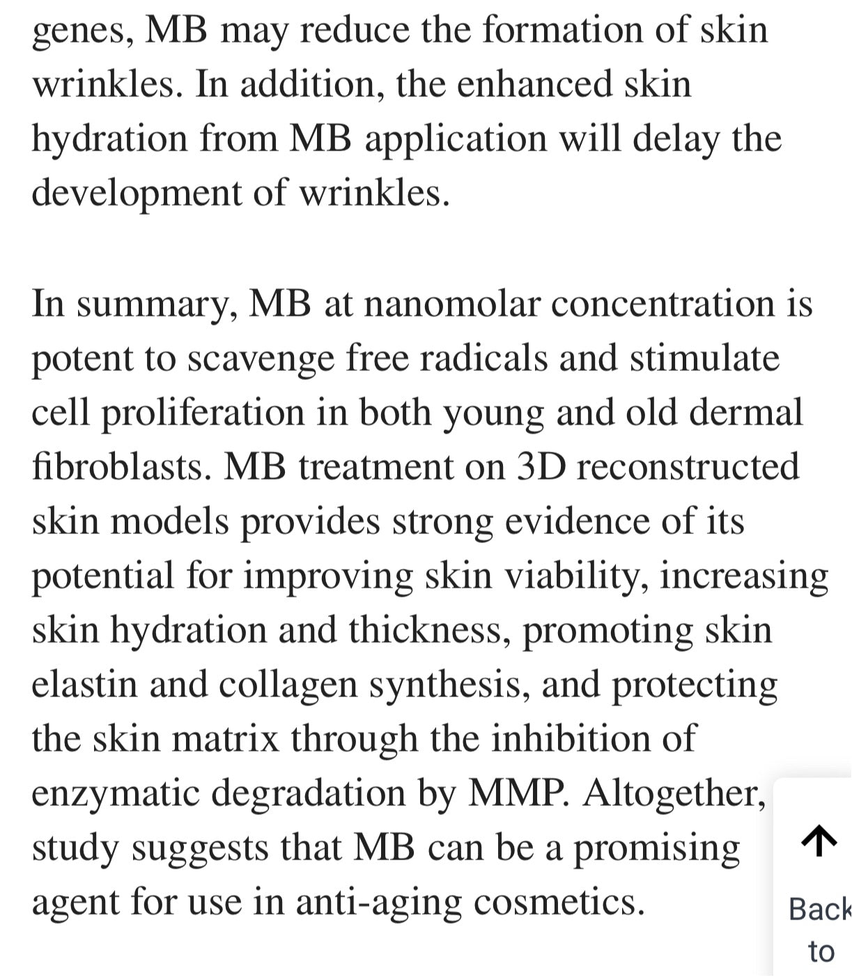 METHYLENE BLUE (MB) - is one of the most powerful free radical scavengers for humans. Free radicals (inflammation) are the main culprit in damaged skin. MB is special because it can prevent inflammation by neutralizing free radicals and promote healing by donating electrons (energy!) from it-self. A new study of topically applied MB showed how it enhanced collagen production, enhanced skin thickness and hydration, and reduces wrinkle formation. It really is a little magical molecule…!