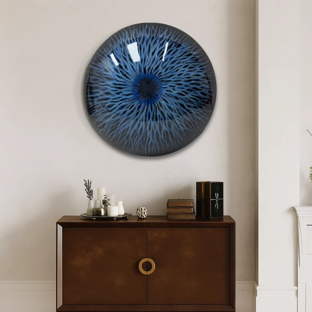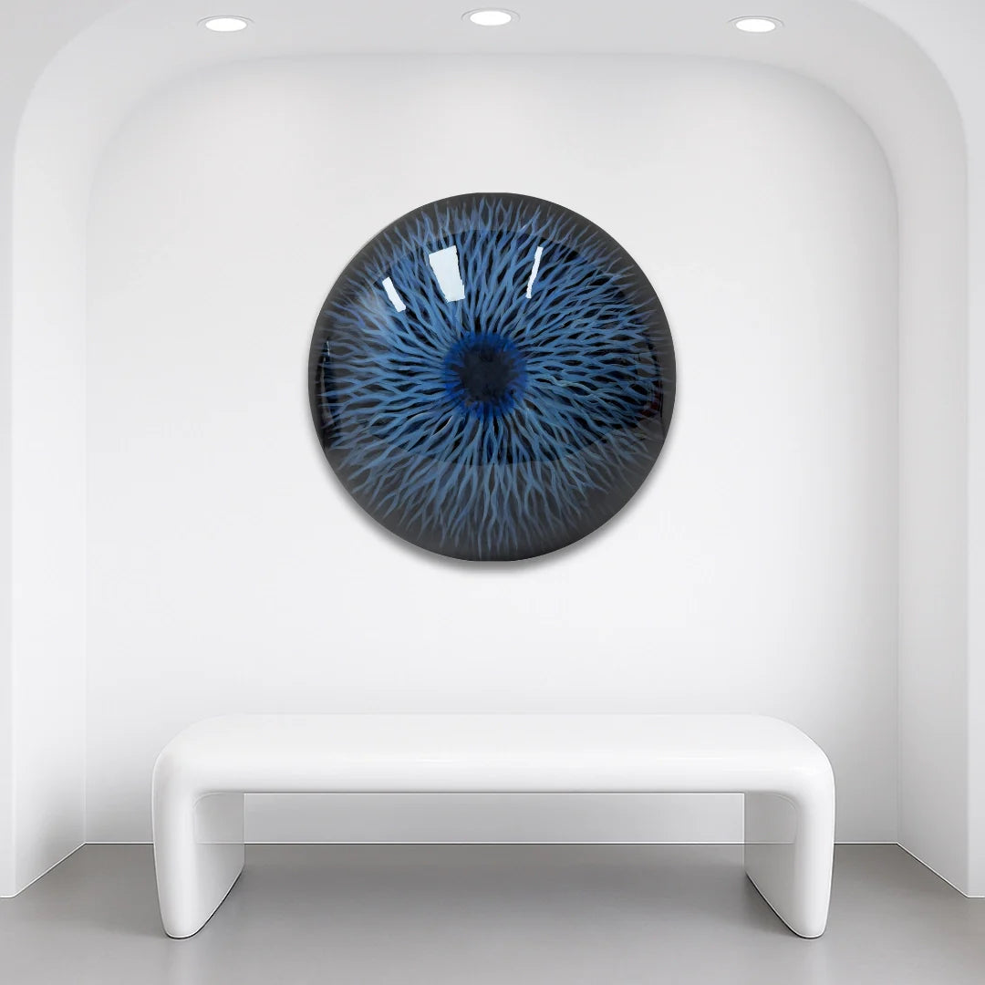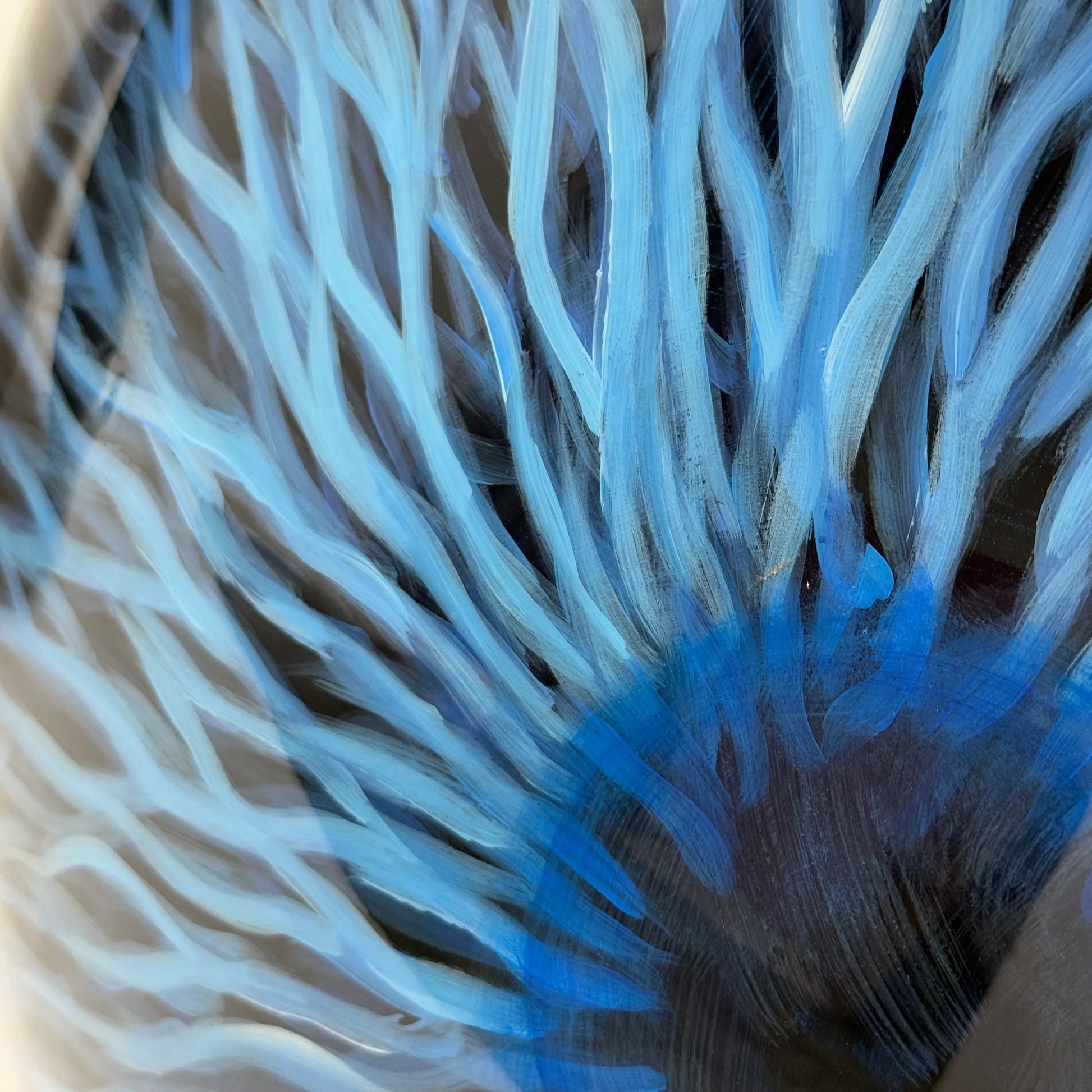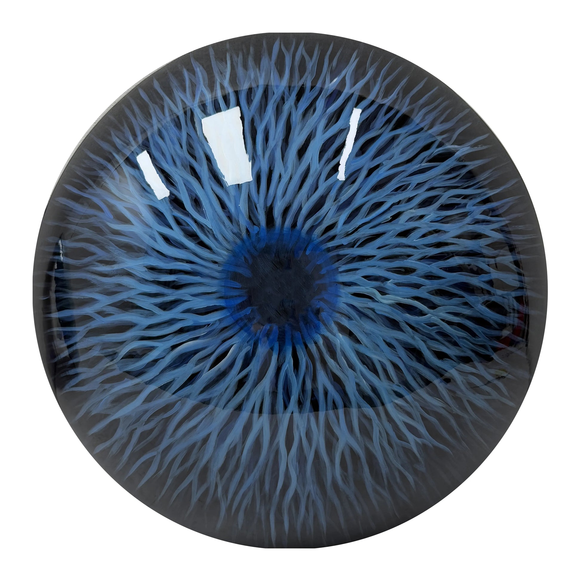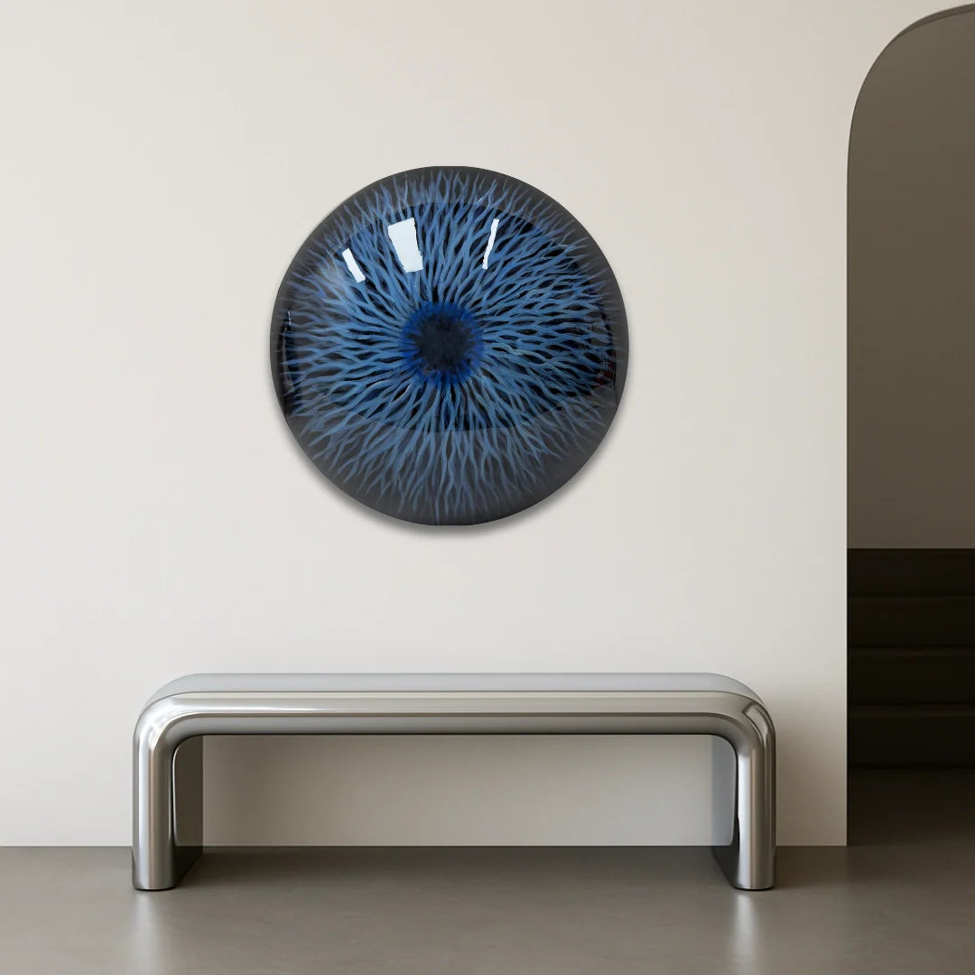 Nova Bloom is a hand-painted convex wall sculpture crafted from iron and finished with a high-gloss resin pour that enhances its depth and shine. Vivid blue tendrils radiate from a dark central core, evoking the intricate structure of an iris or the burst of a stellar nova. The combination of sculptural form, layered paintwork, and reflective resin creates a piece that feels both cosmic and alive.
