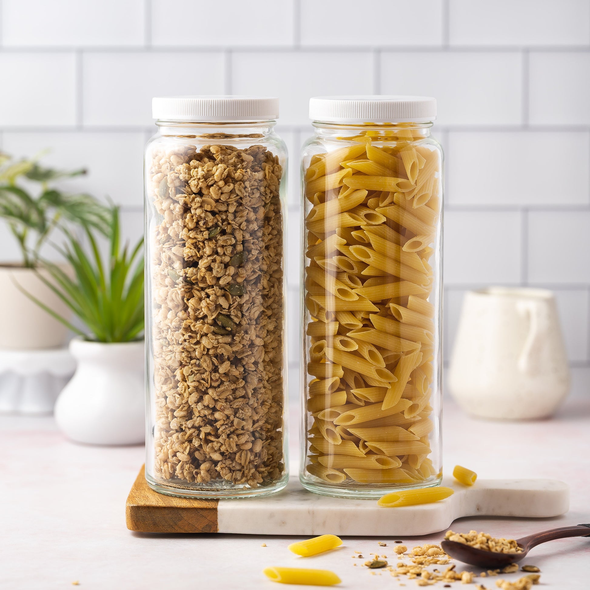 PANTRY ORGANIZATION - clean up your pantry. Busy packaging can make your kitchen cluttered. Choose clear same sized food storage containers to keep it looking cohesive and organized. The VAS Exclusive 32 ounce bottles provide air-tight storage for your dry foods and the tall slim characteristics of these bottles offers a space-saving design, and the clear aesthetic helps you find your food quickly.