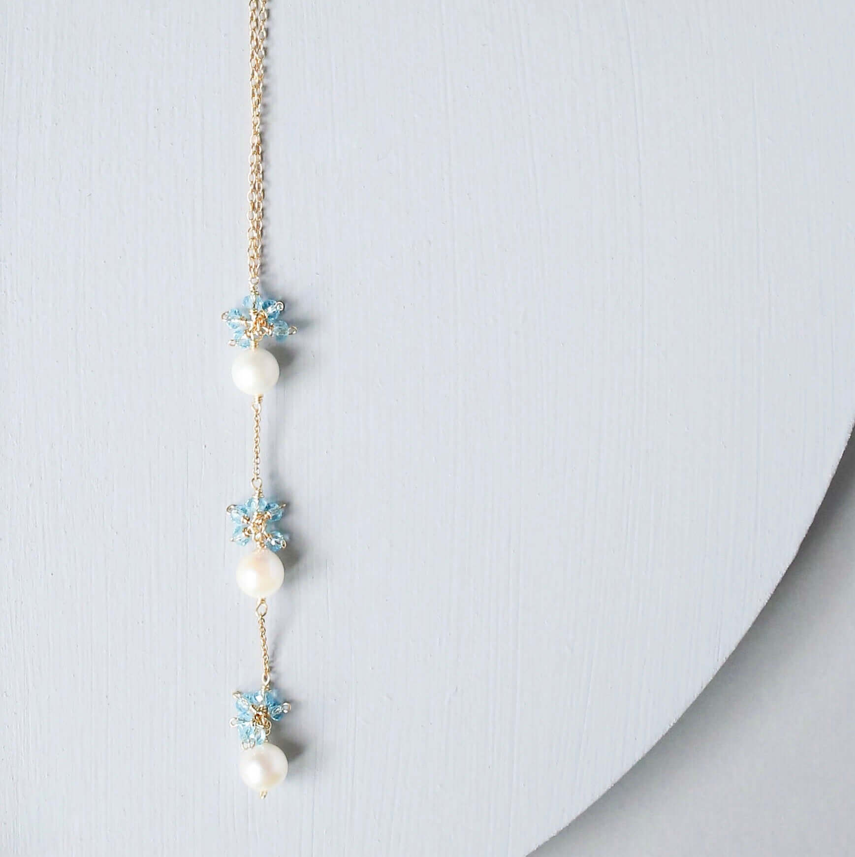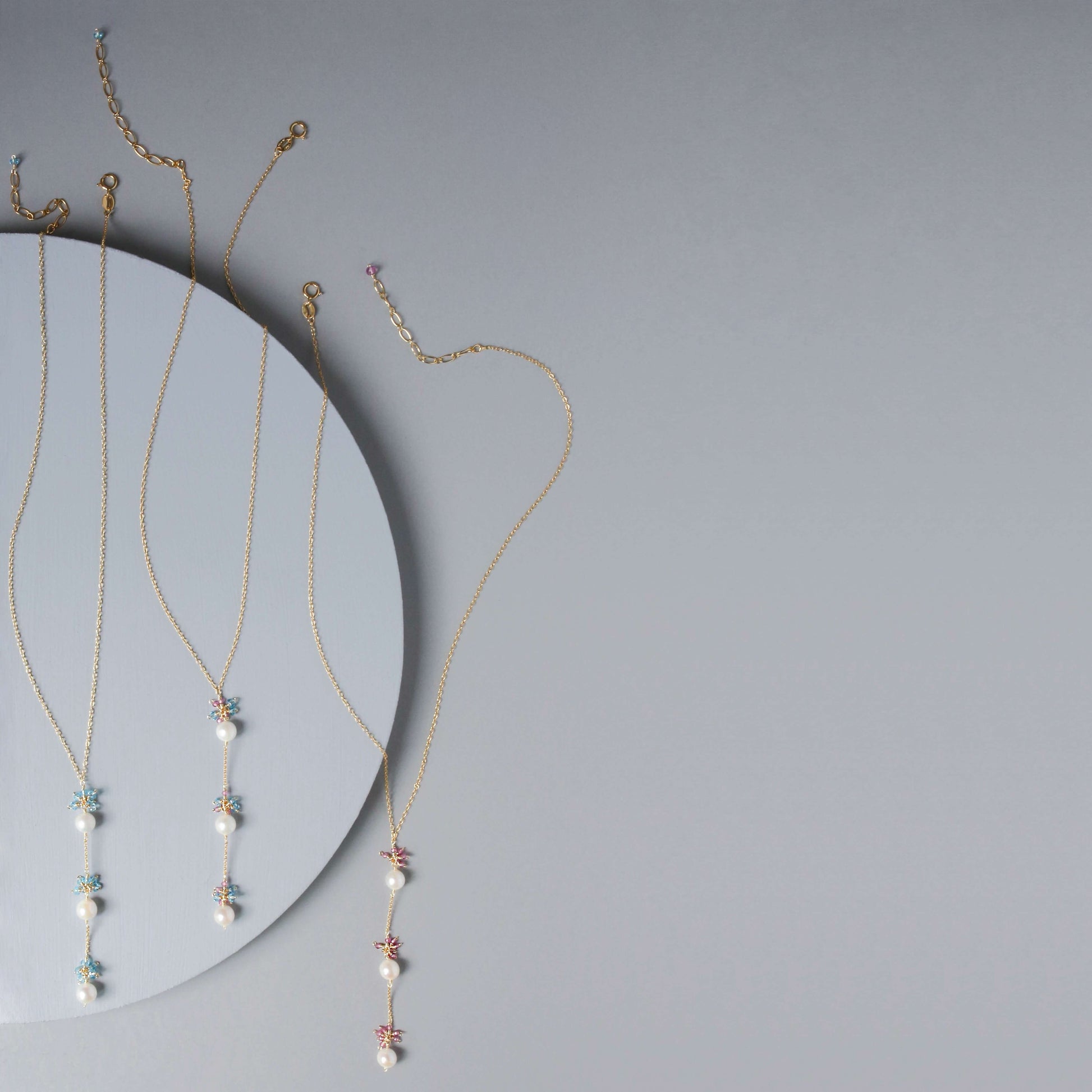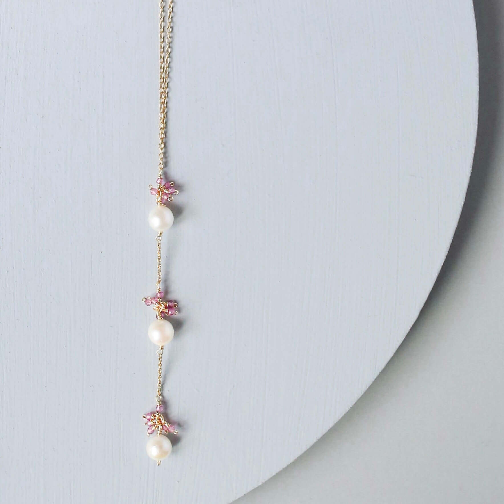 Y design with 3 white freshwater bead pearls paired with genuine pink tourmaline gemstones.