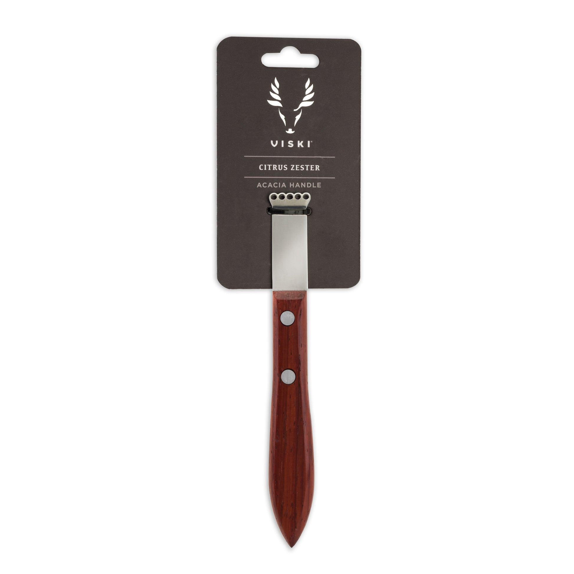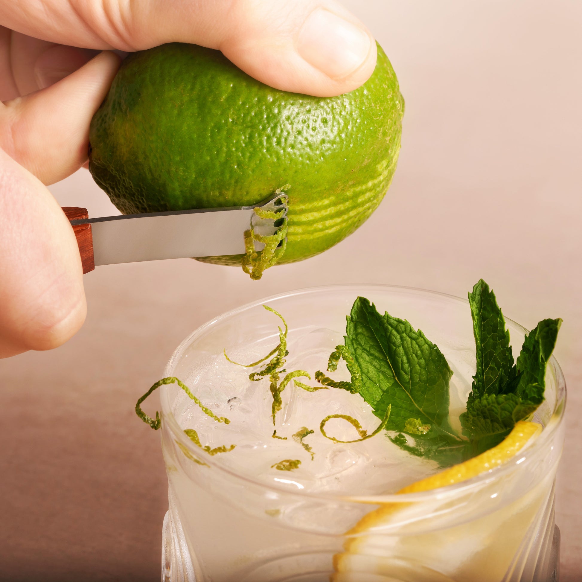 Finish handcrafted cocktails with a professional zing of citrus. Riveted wood with polished exposed grain provides ergonomic support while a curved blade shaves segments of rind into a delicate dusting of garnish. Most suitable for oranges, lemons and limes.
