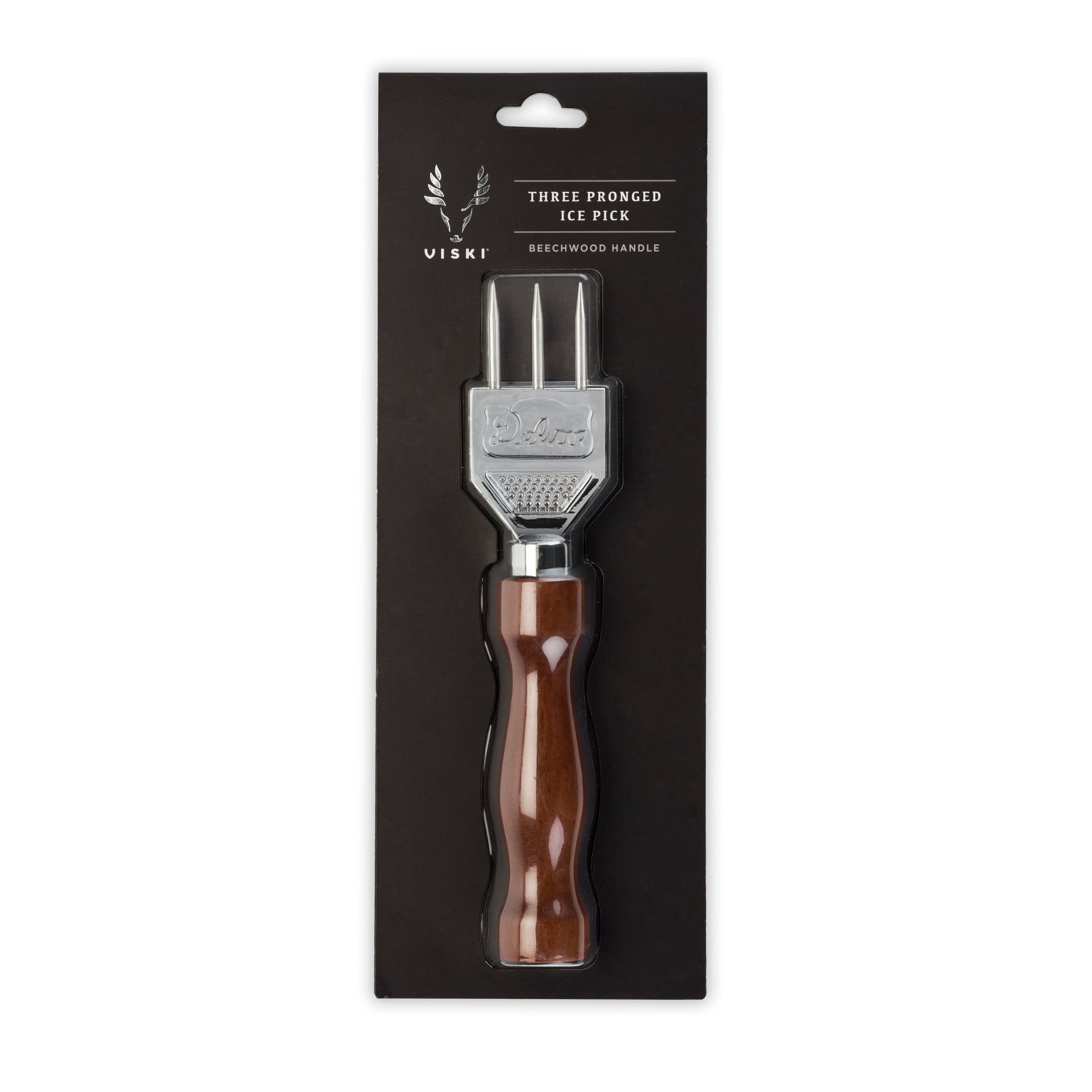 Chip away pieces of ice for a flawless frozen libation using the industrial strength of stainless steel. Curved stained wood tapers into three razor-sharp metal points, wielding enough force to crack and crush any chunk of ice with ease.