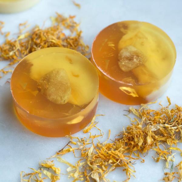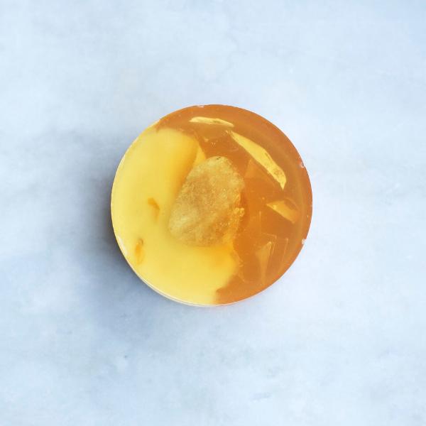 Enhanced with an embedded Citrine crystal known as the “Stone of Success”. This bar enhances mental clarity and raises self esteem. It promotes enlightenment, optimism, and warmth and helps attract wealth. Vibrant notes of Lemongrass, Bergamot and Avocado creates a sense of deep relaxation. This Bar is made with Shea Butter infused with Oatmeal Powder and Calendula Petals.