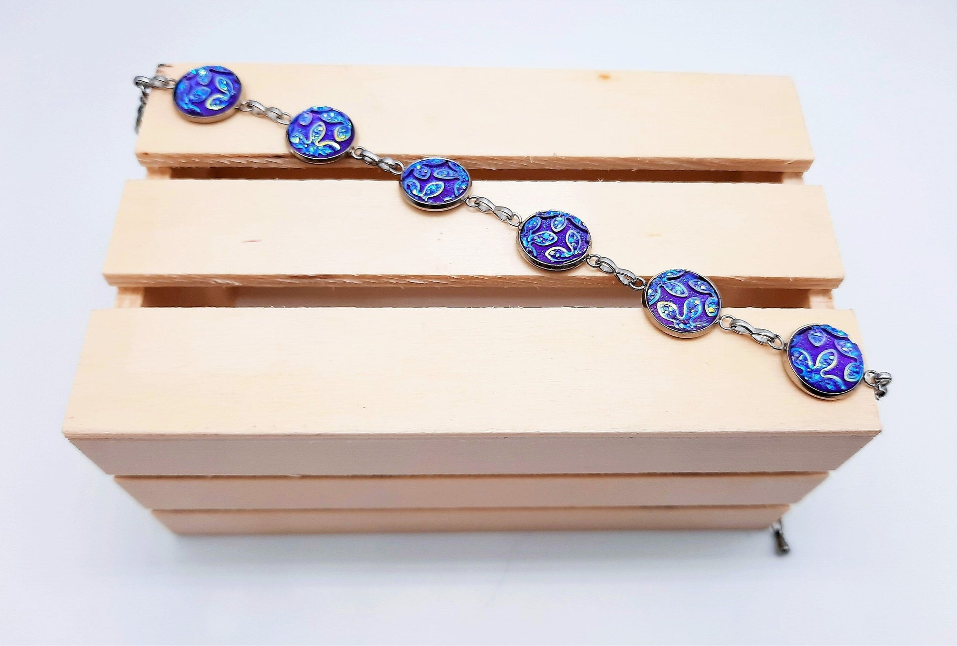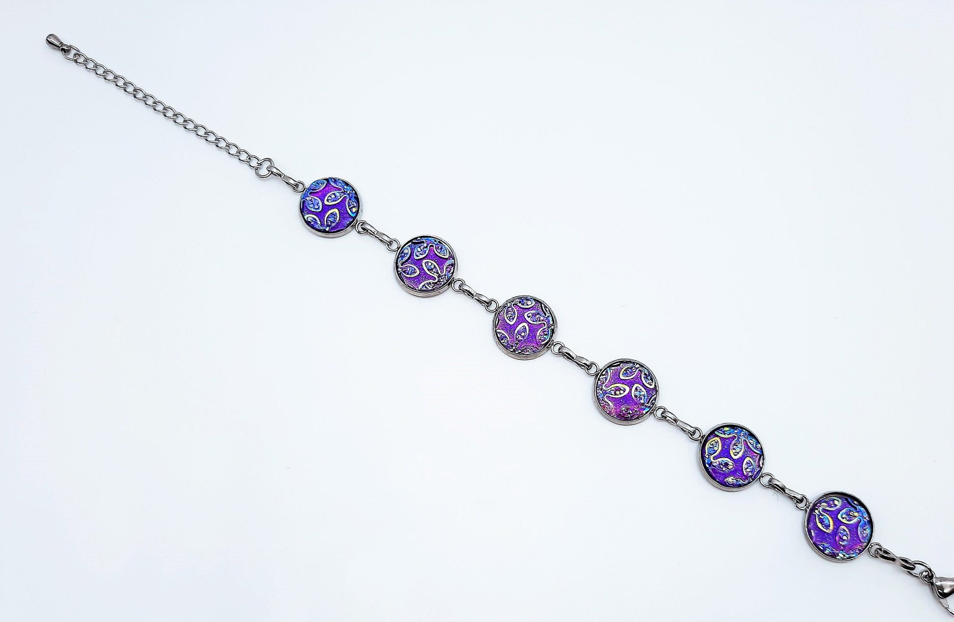 Handcrafted Purple Iridescent Resin Link Bracelet. The bracelet size is adjustable. Six (6) 12mm round cabochon resin settings, 7 inches long with 1.5 inch extender chain and lobster claw clasp.