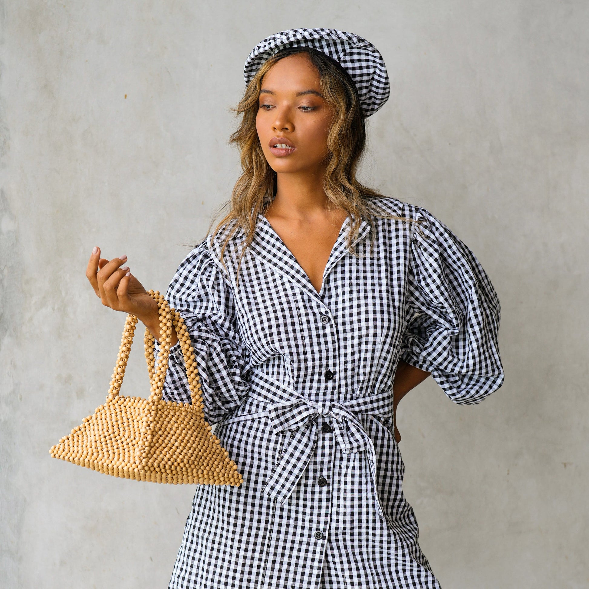 This Pyramid bag is a museum-worthy, sculptural beads piece that strikes a cool, coastal ease. Crafted from natural wooden beads, this arm purse features a sturdy 3-dimensional pyramid shape with 2 bag handles. Show yours off with our Meghan mini gingham dress and your favorite espadrilles.