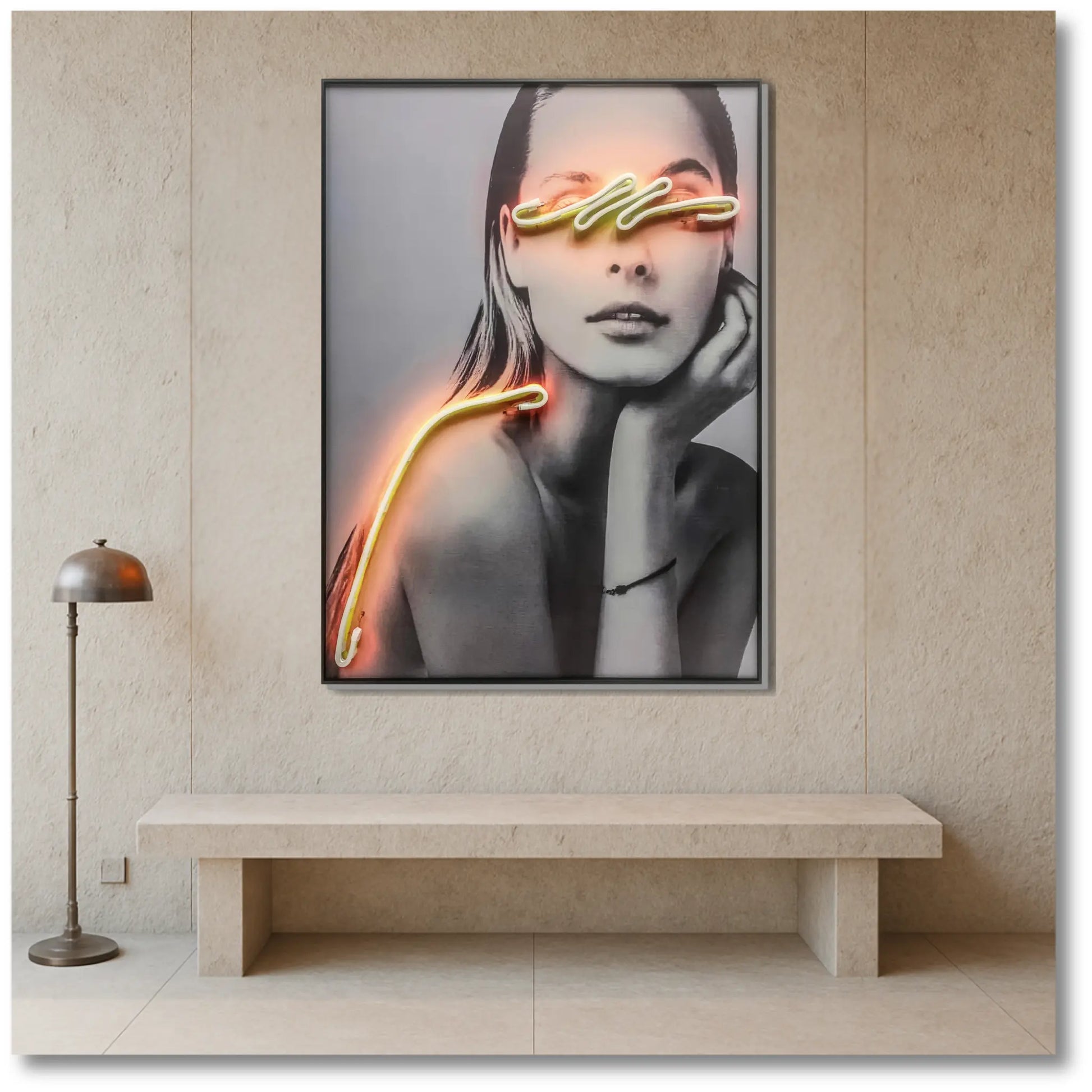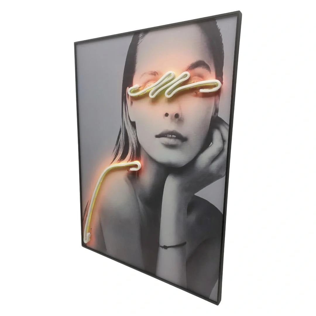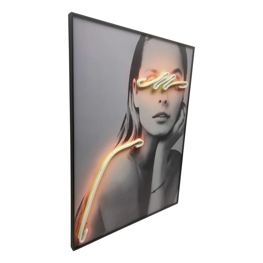 Introducing "Radiant Grace: LED-Lit Lady with Glowing Eyes" - a stunning portrayal of elegance and allure, where a beautiful woman is adorned with an orange glow LED over her eyes. This captivating piece exudes sophistication and charm, inviting viewers to bask in the radiant glow of her presence. With its graceful depiction and subtle yet captivating illumination, "Radiant Grace" adds a touch of mystique and glamour to any space. Whether adorning a bedroom, dressing room, or salon, this LED-lit artwork becomes a focal point of beauty and inspiration. Elevate your home decor with the enchanting allure of "Radiant Grace" and let its luminous presence illuminate your surroundings with elegance and style.