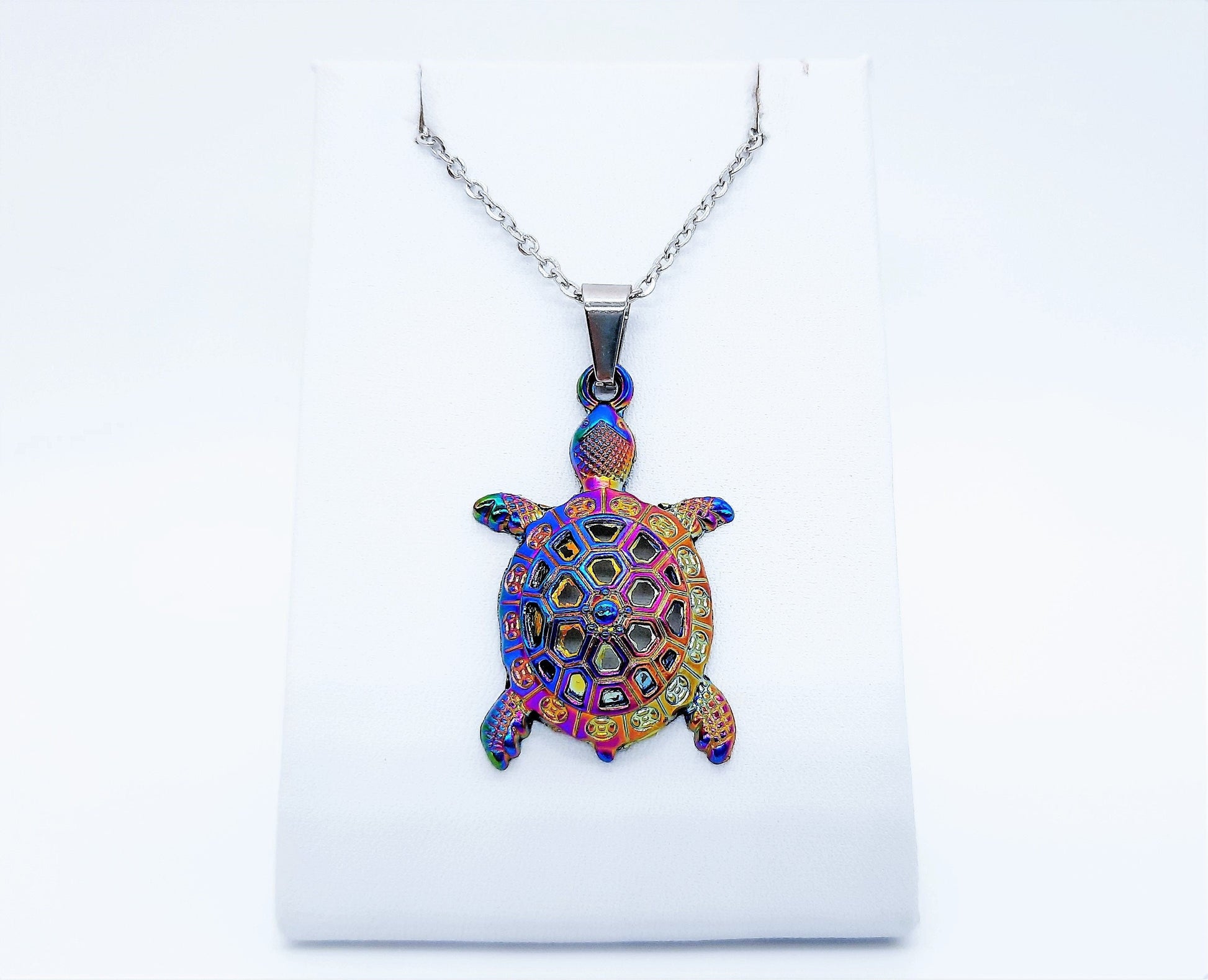 Rainbow Chromium Metal Sea Turtle Pendant Necklace - 19 Inch Stainless Steel Hypoallergenic Chain - Lobster Claw Closure - Alloy Pendant.