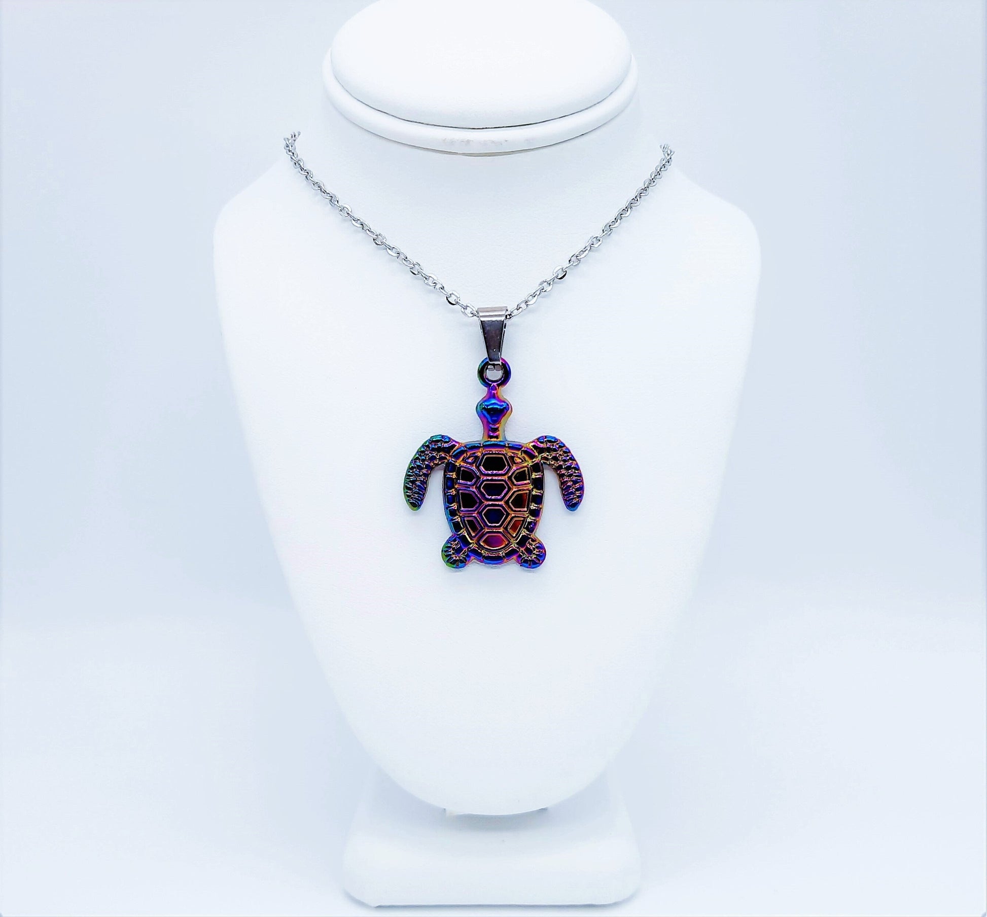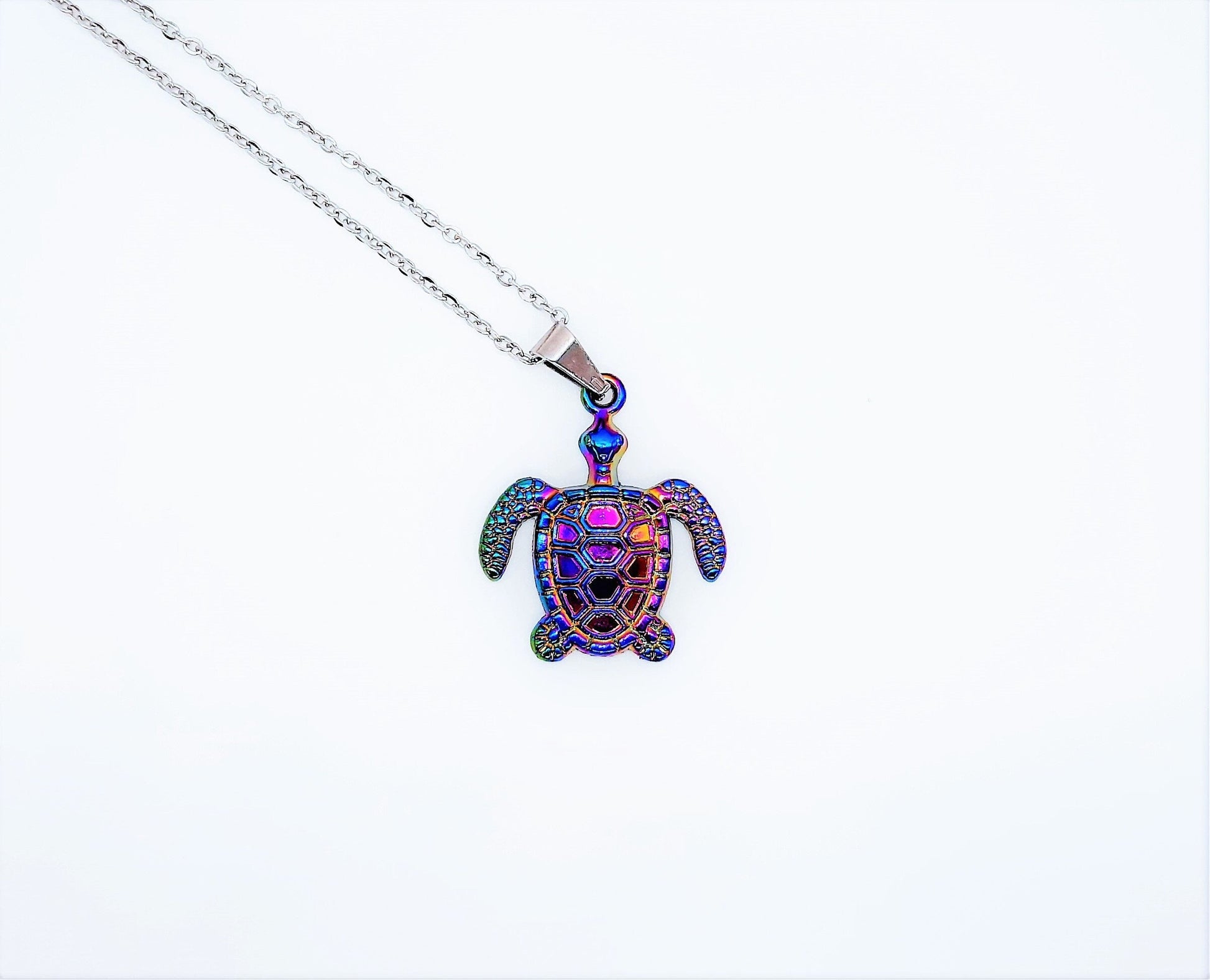 Rainbow Chromium Metal Sea Turtle / Tortoise Necklace - 19" Stainless Steel Hypoallergenic Chain - Lobster Claw Closure - Alloy Pendant.
